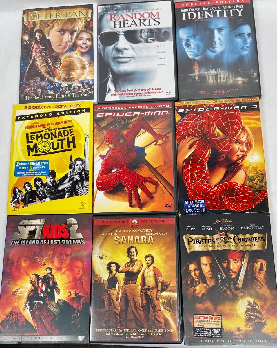 Titles include: Spiderman 1 & 2, Pirates of the Caribbean, Peter Pan, Spy Kids, and more. Good condition. All previously viewed.