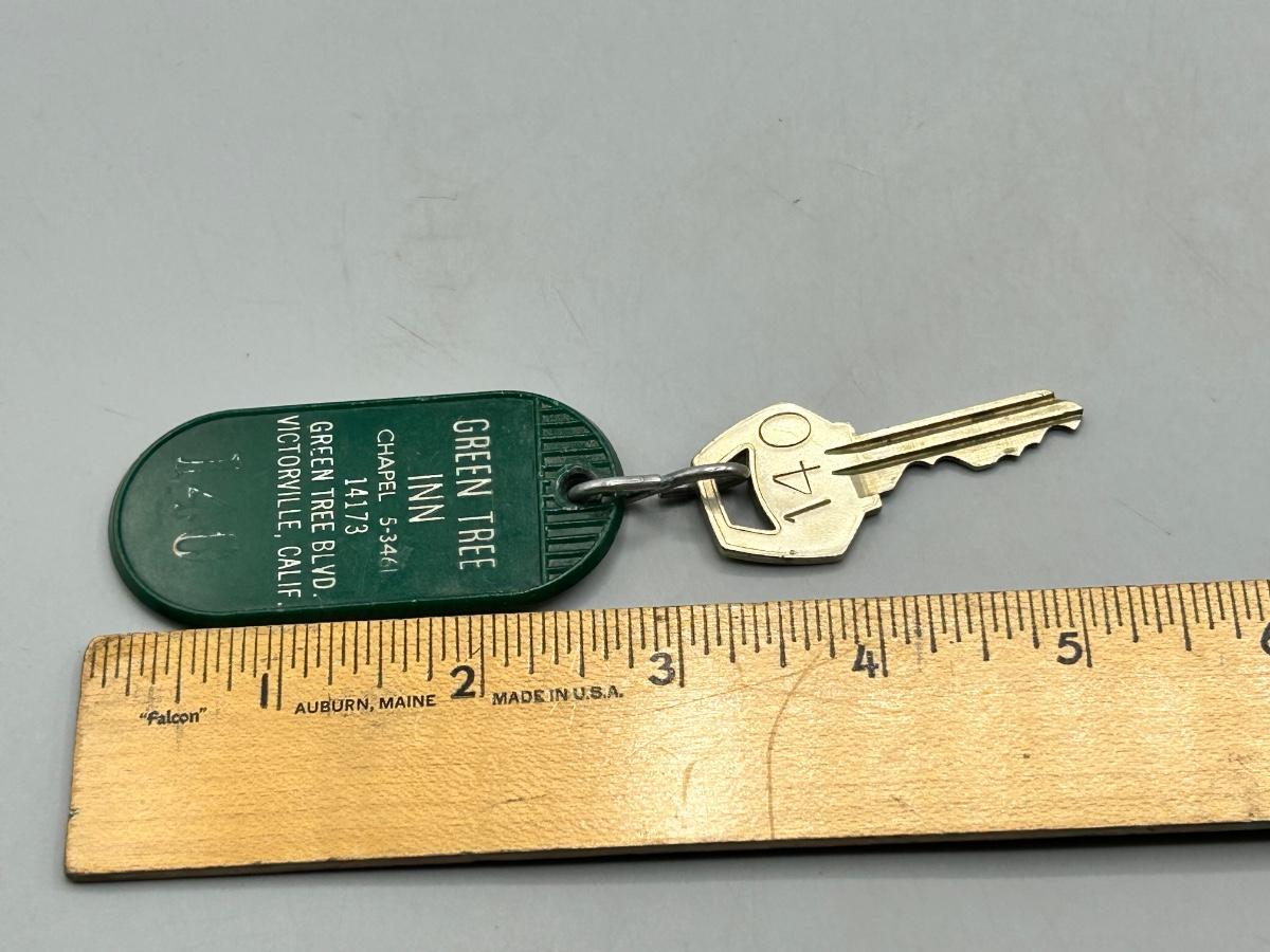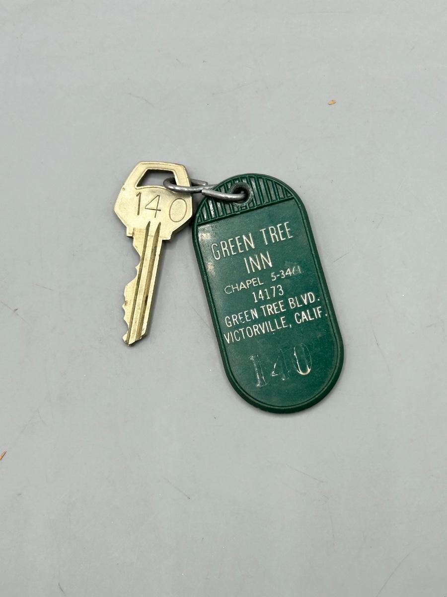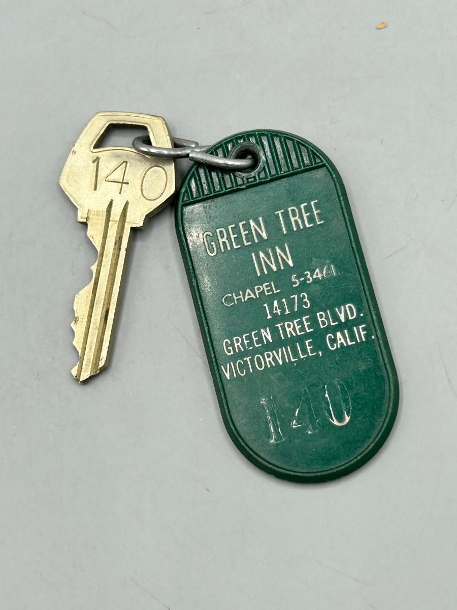 Vintage Green Tree Inn Chapel Hotel Motel Keychain Room Key Victorville California. Room #140. Motel is still open but there does not seem to be a chapel any longer.