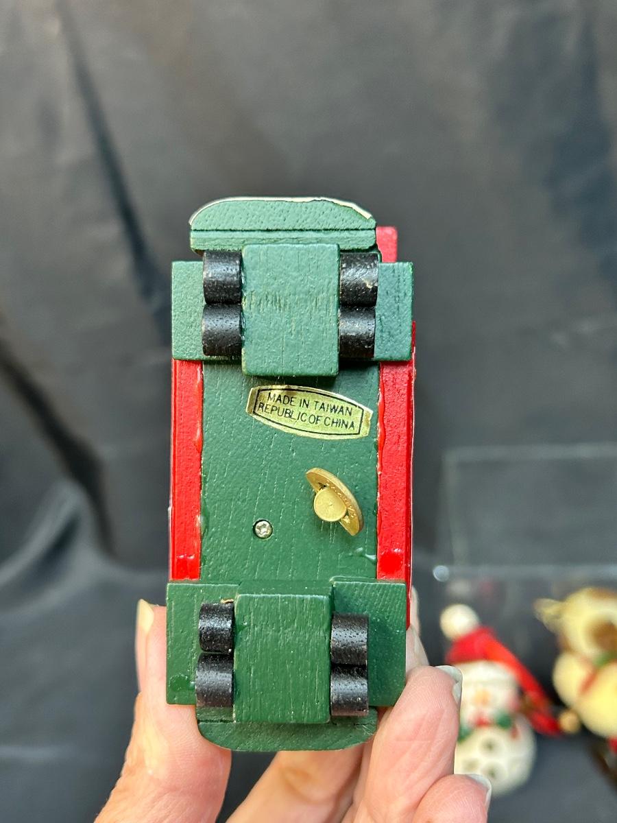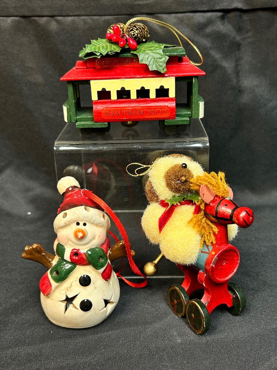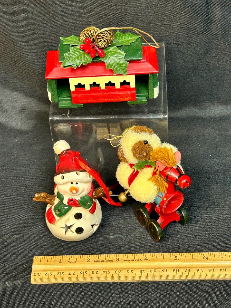 Lot of Three Christmas Holiday Tree Ornament Light Up Snowman Music Playing Trolly Wood Horse. Light up snowman and the musical trolley both work.