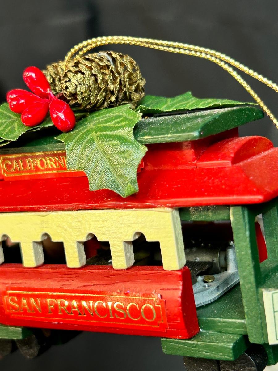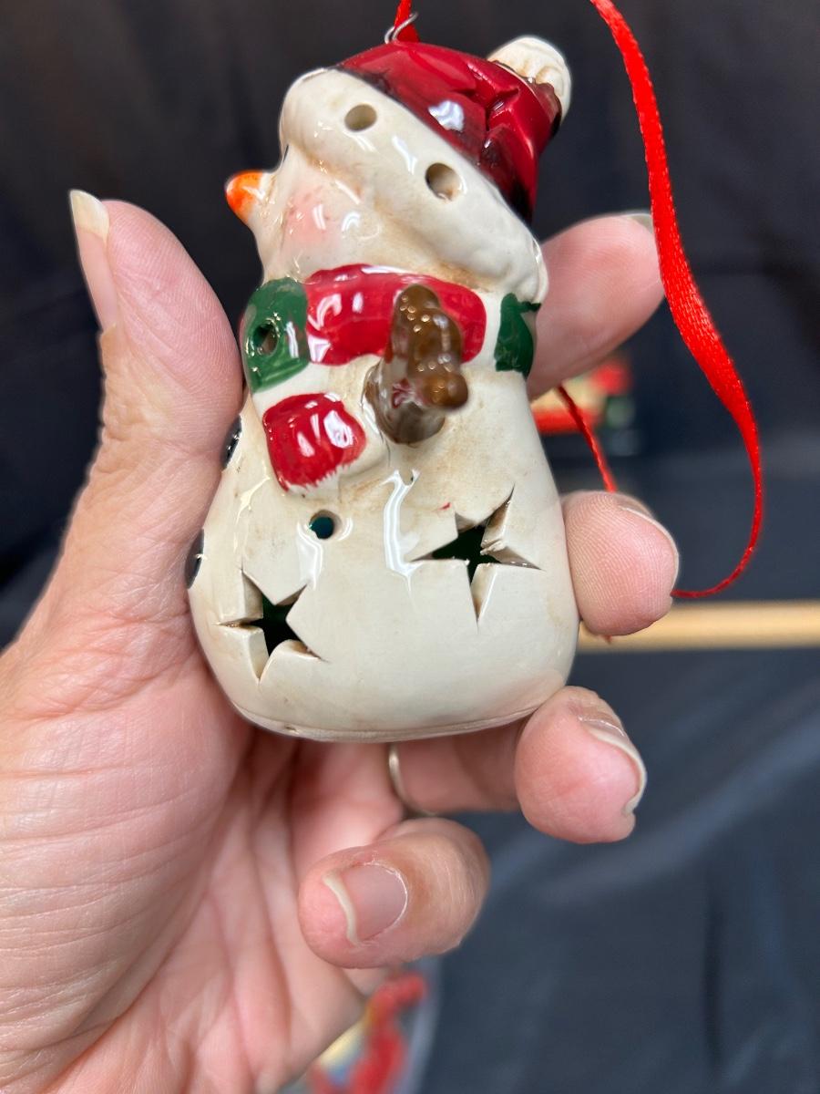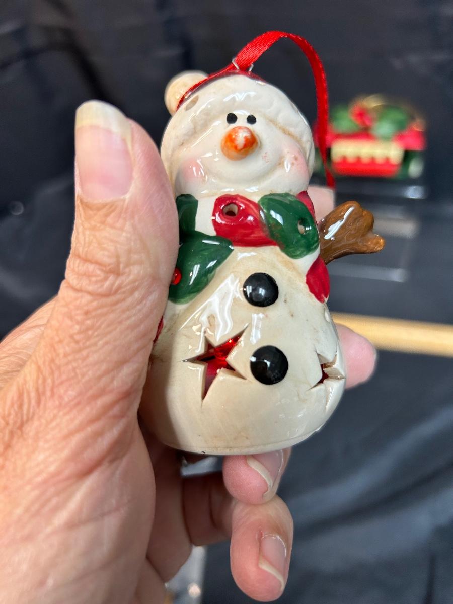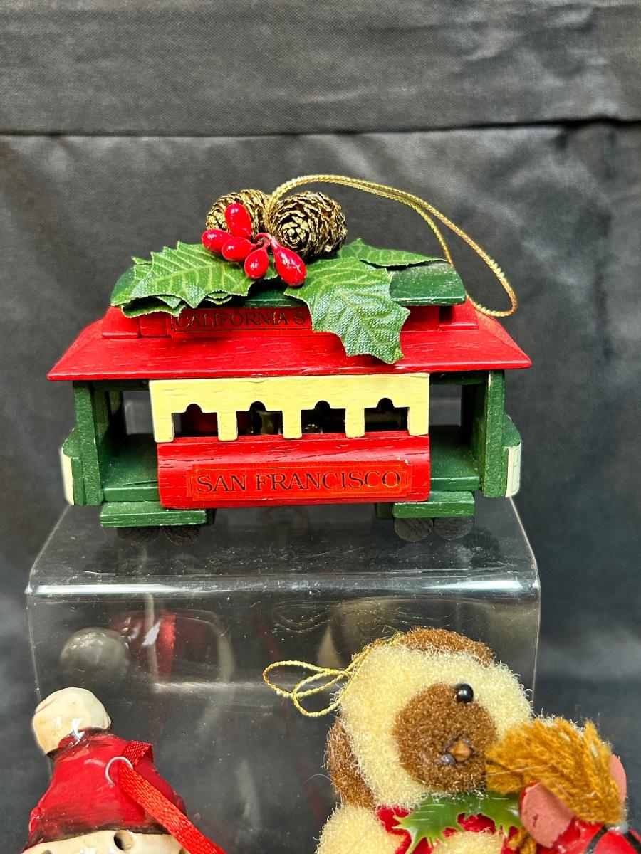 Lot of Three Christmas Holiday Tree Ornament Light Up Snowman Music Playing Trolly Wood Horse. Light up snowman and the musical trolley both work.