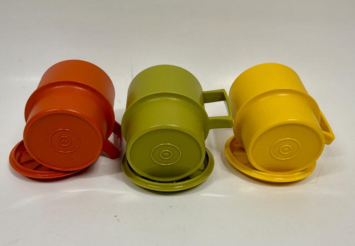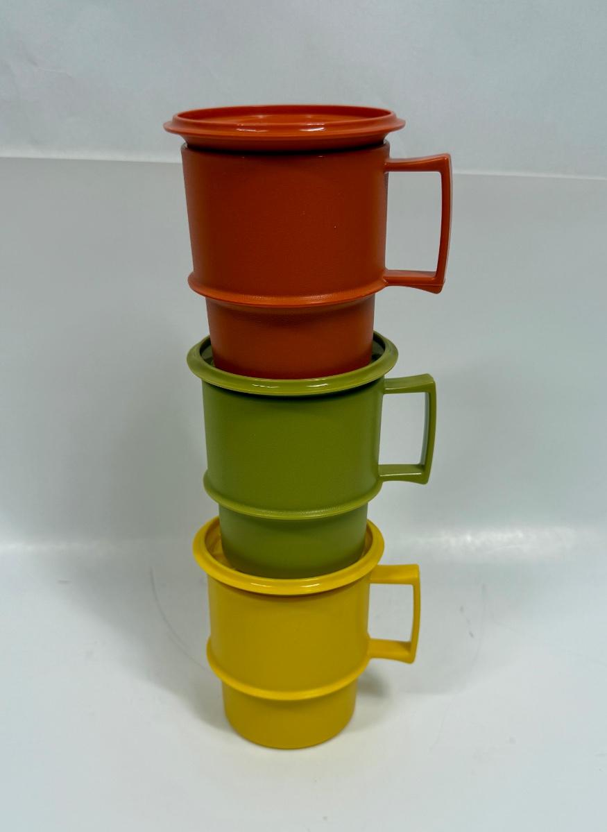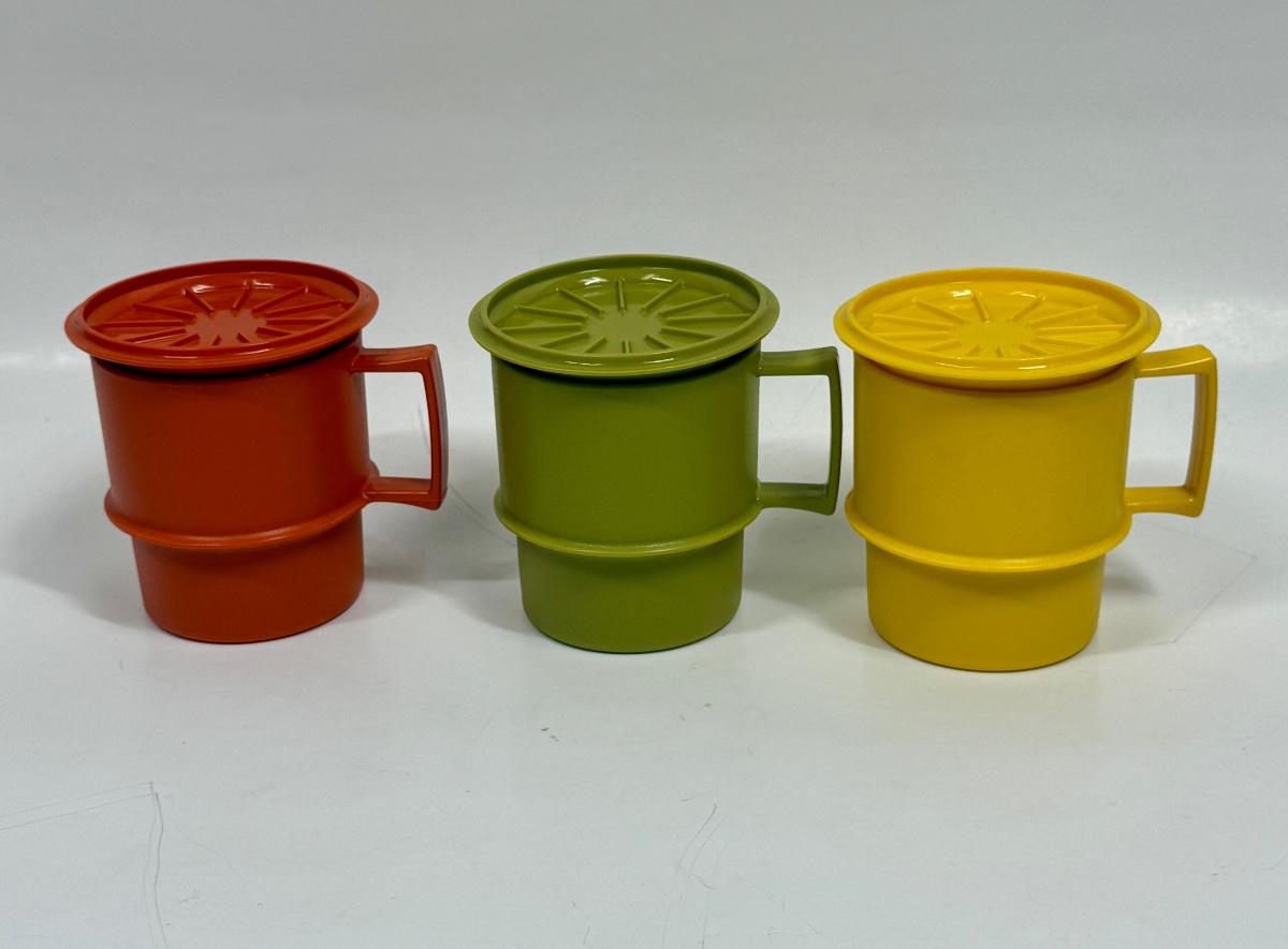 3 Vintage Tupperware Stackable Sealable Coffee Mugs with lids/coasters green orange yellow