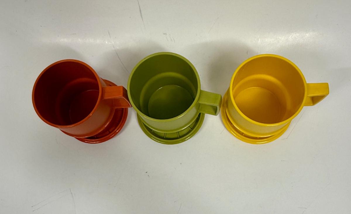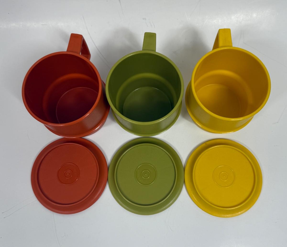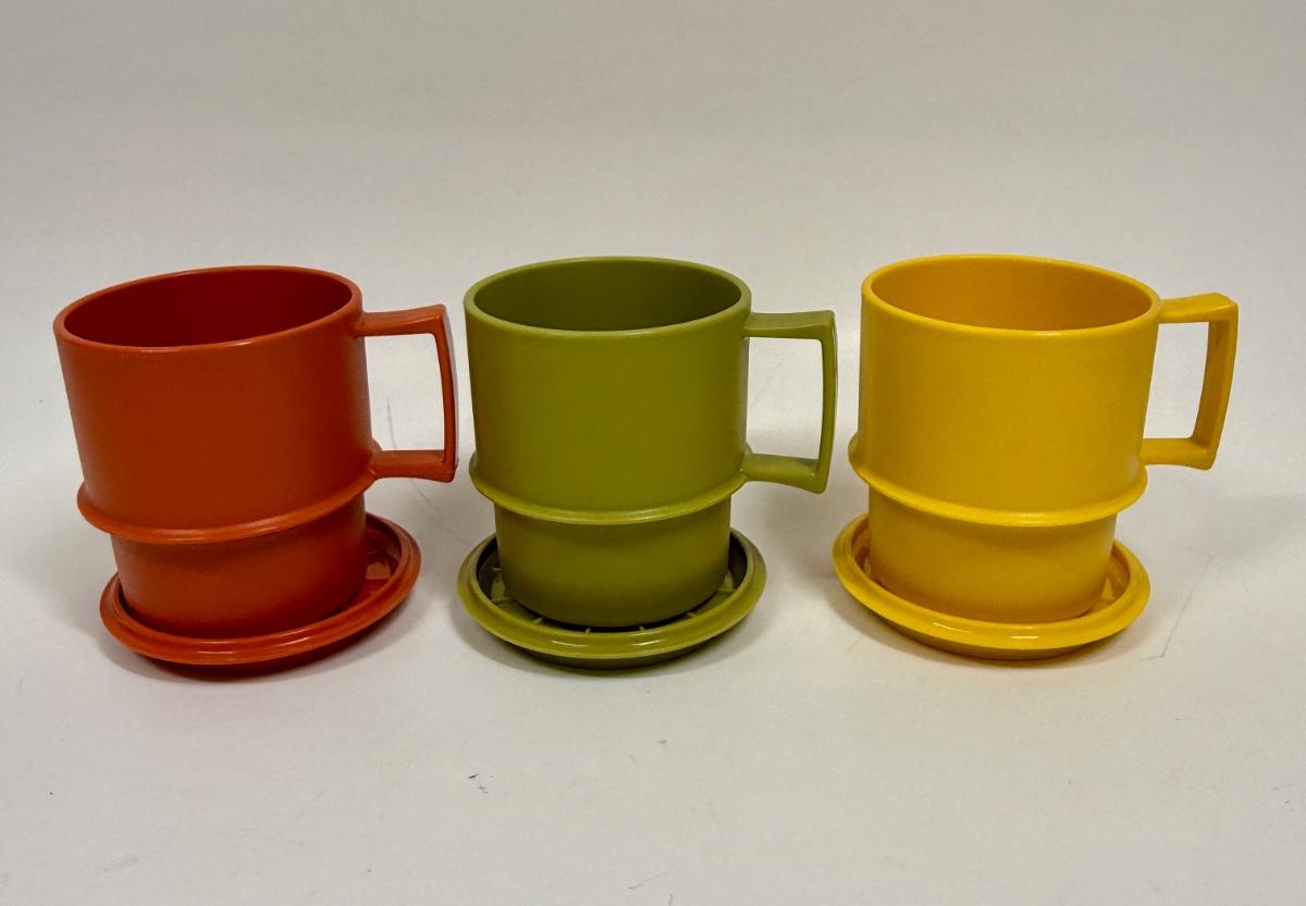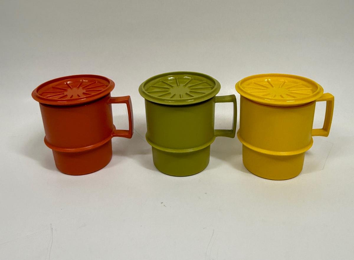 3 Vintage Tupperware Stackable Sealable Coffee Mugs with lids/coasters green orange yellow