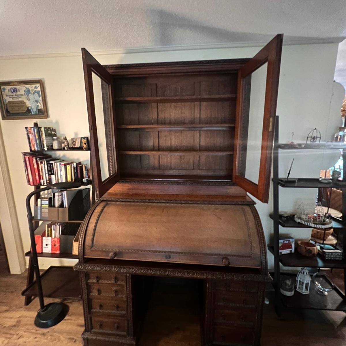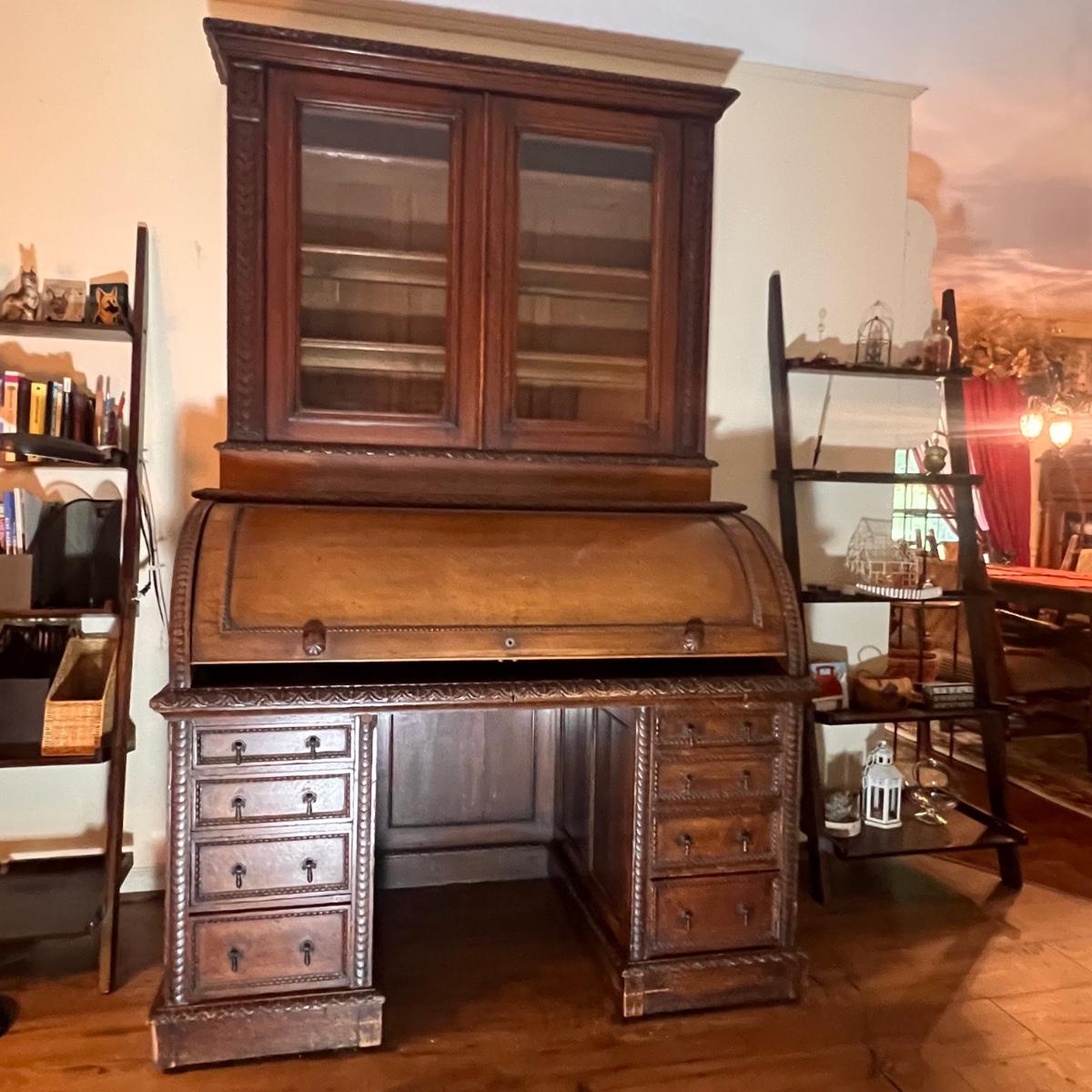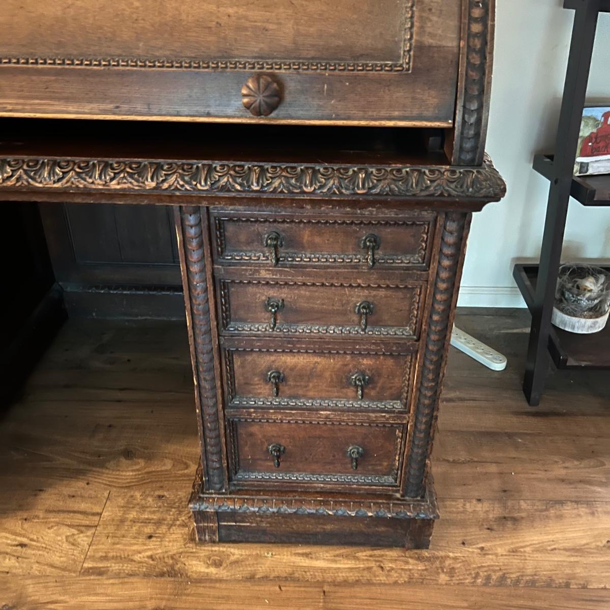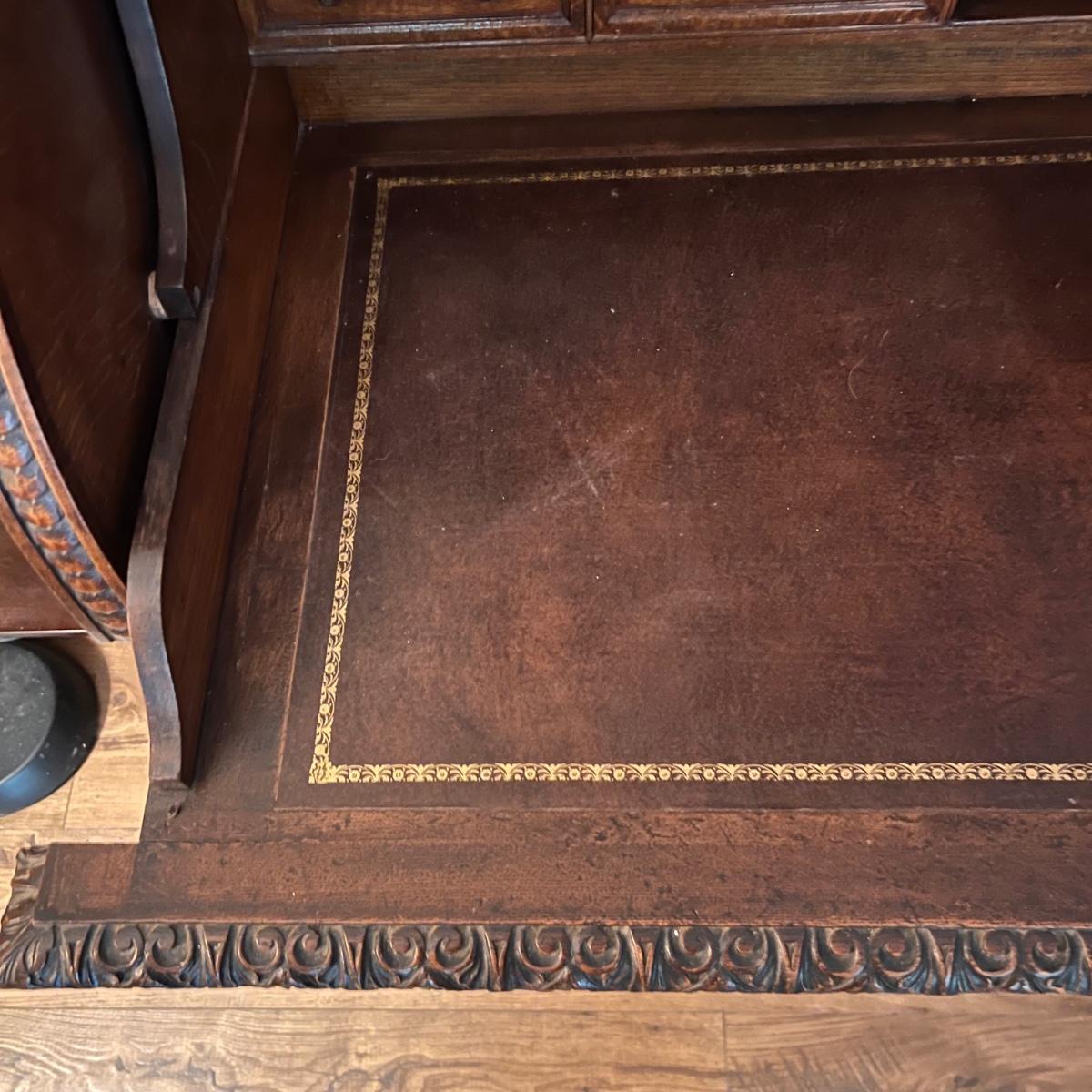 This beautifully crafted and carved furniture is a large solid wood roll top two piece desk. The upper portion is a glass door cabinet with three shelves. Both it and the desk it sits on have locks but no keys are included. The desk is very unique in that the leather covered writing area pulls out approximately 6”. The drawers are locked shut when this section is pushed back but if you pull it out an inch or more, the drawers miraculously unlock! Drawers on the left side are a little sticky to open, but just a tad. A few knicks and a mark on the roll top are shown in pics. Estate owner states this was imported from Scotland but no authentication included.
