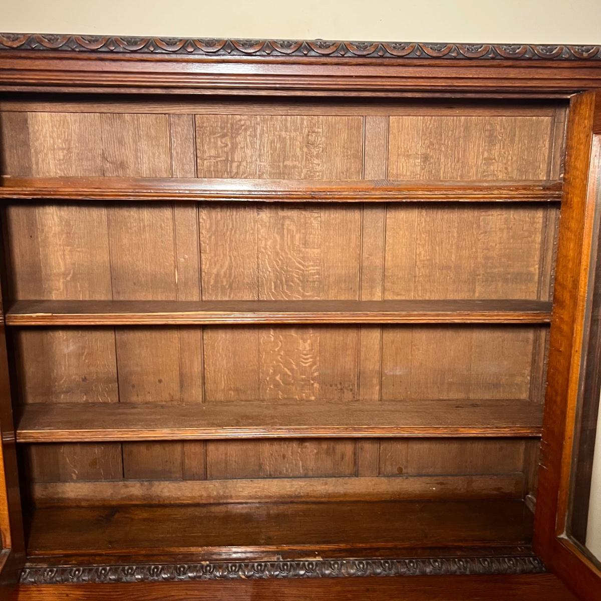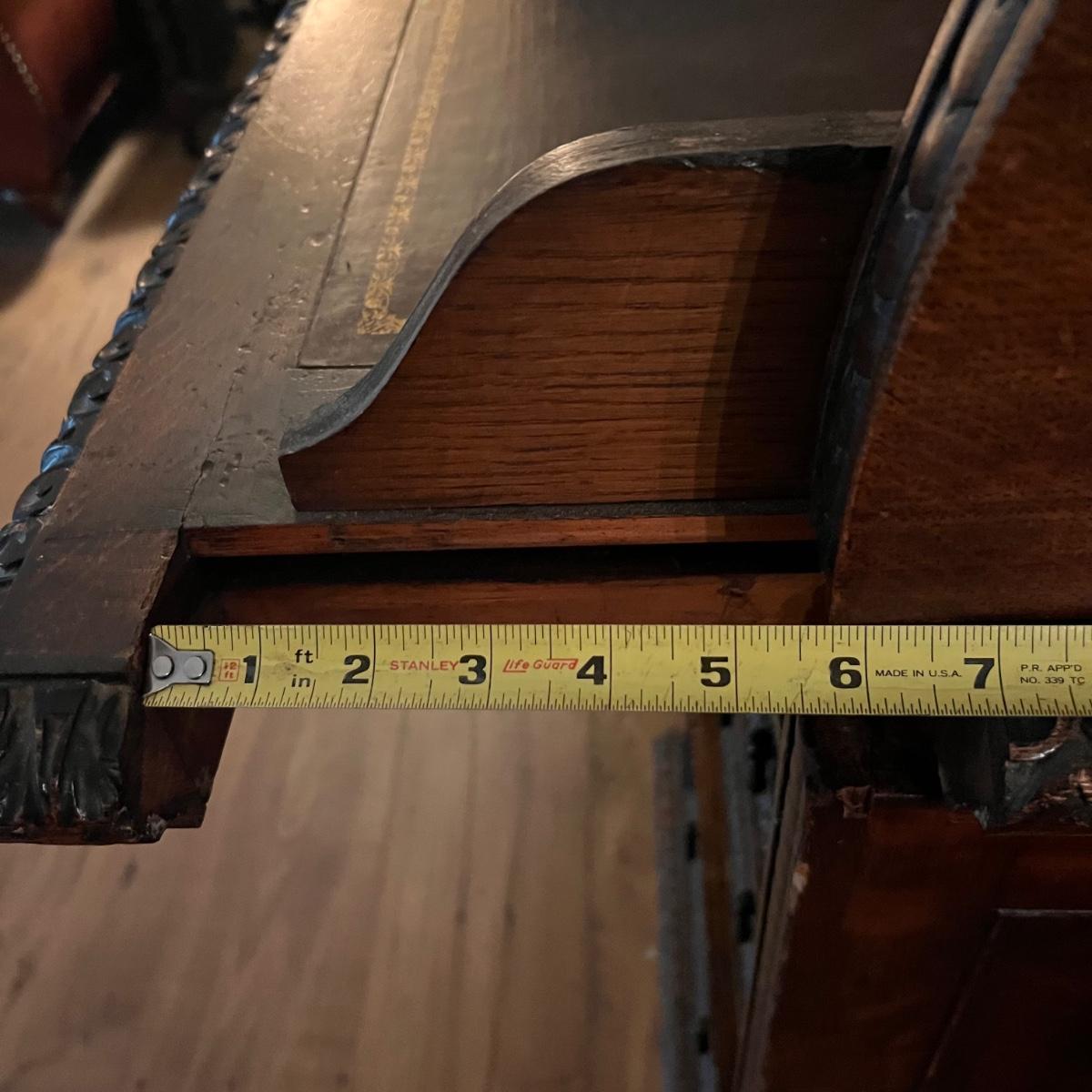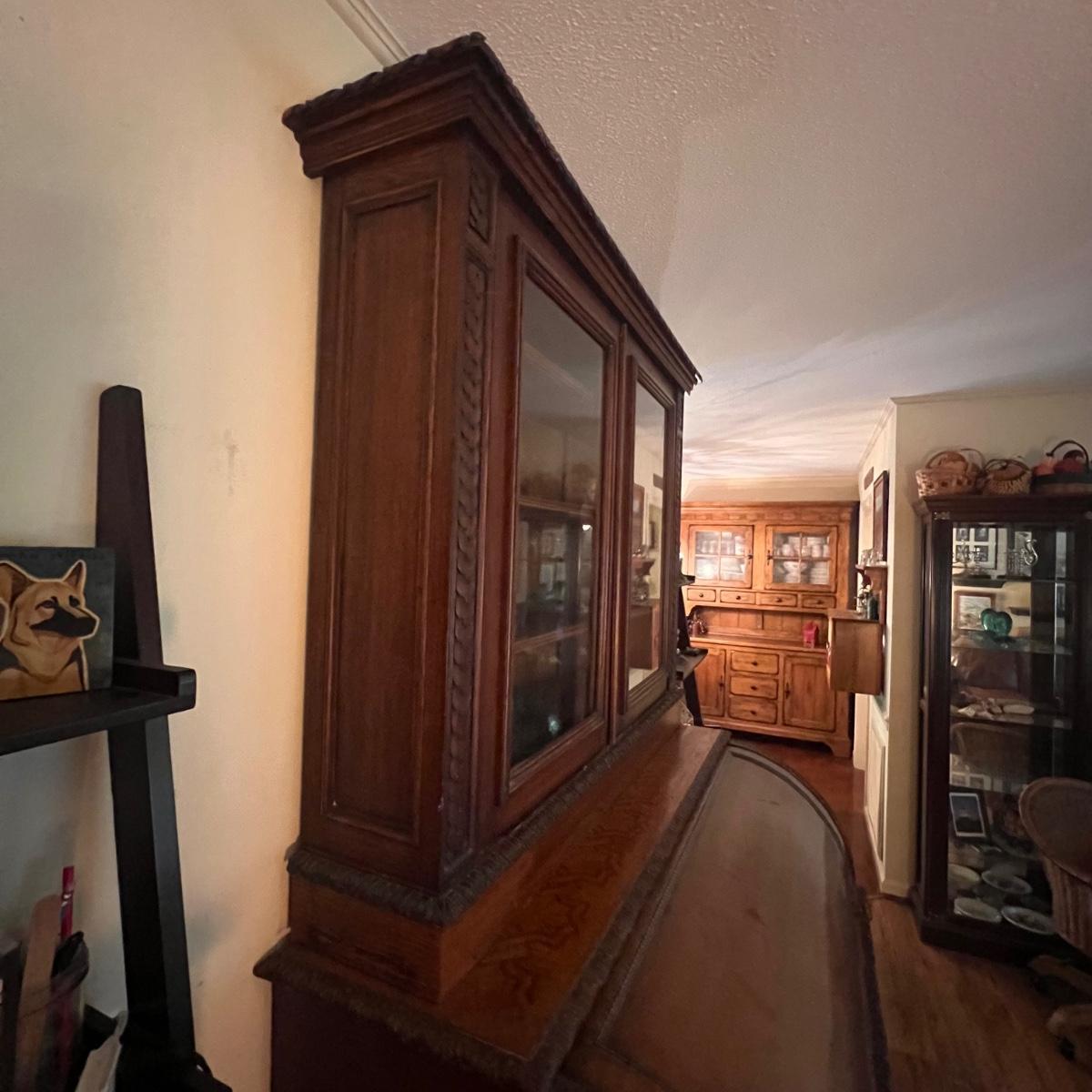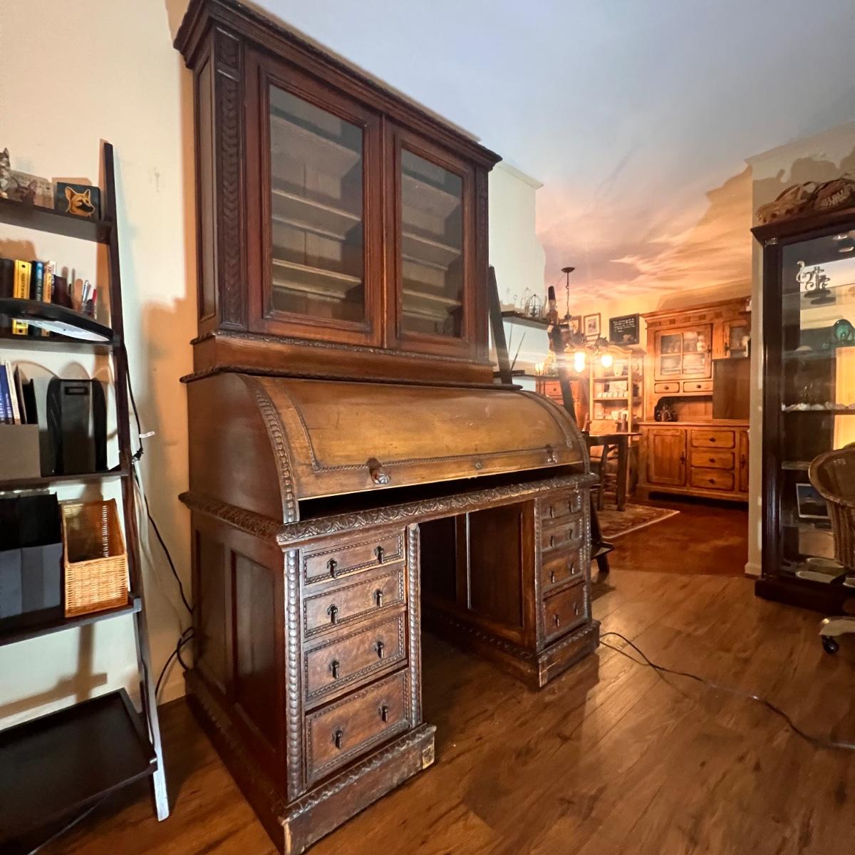 This beautifully crafted and carved furniture is a large solid wood roll top two piece desk. The upper portion is a glass door cabinet with three shelves. Both it and the desk it sits on have locks but no keys are included. The desk is very unique in that the leather covered writing area pulls out approximately 6”. The drawers are locked shut when this section is pushed back but if you pull it out an inch or more, the drawers miraculously unlock! Drawers on the left side are a little sticky to open, but just a tad. A few knicks and a mark on the roll top are shown in pics. Estate owner states this was imported from Scotland but no authentication included.