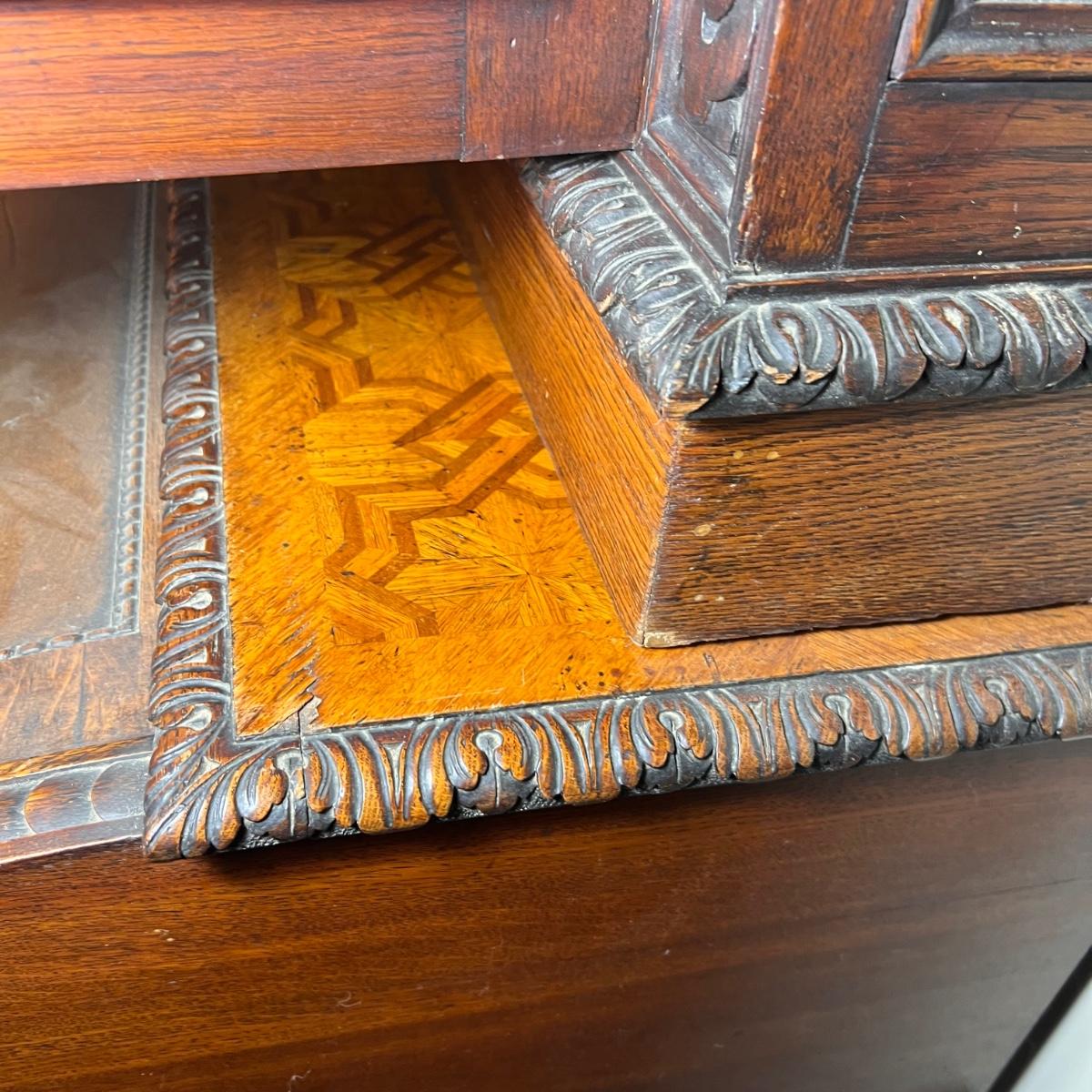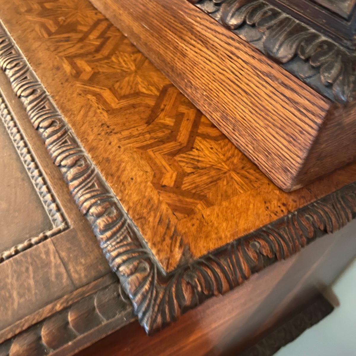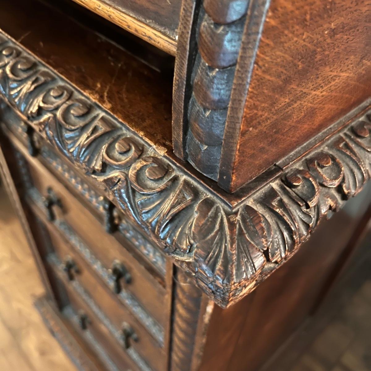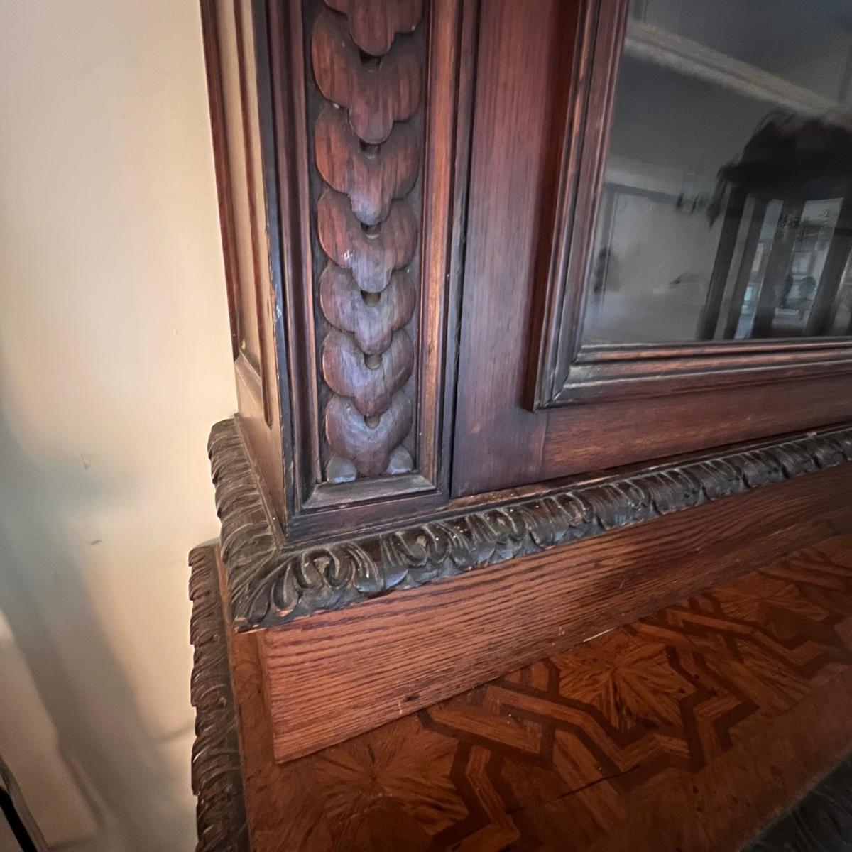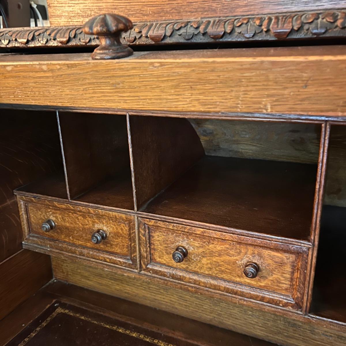 This beautifully crafted and carved furniture is a large solid wood roll top two piece desk. The upper portion is a glass door cabinet with three shelves. Both it and the desk it sits on have locks but no keys are included. The desk is very unique in that the leather covered writing area pulls out approximately 6”. The drawers are locked shut when this section is pushed back but if you pull it out an inch or more, the drawers miraculously unlock! Drawers on the left side are a little sticky to open, but just a tad. A few knicks and a mark on the roll top are shown in pics. Estate owner states this was imported from Scotland but no authentication included.