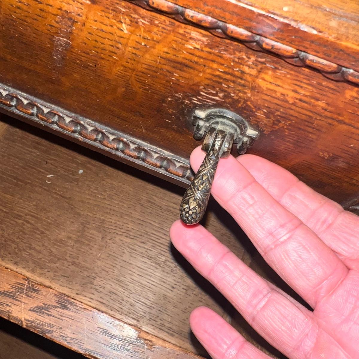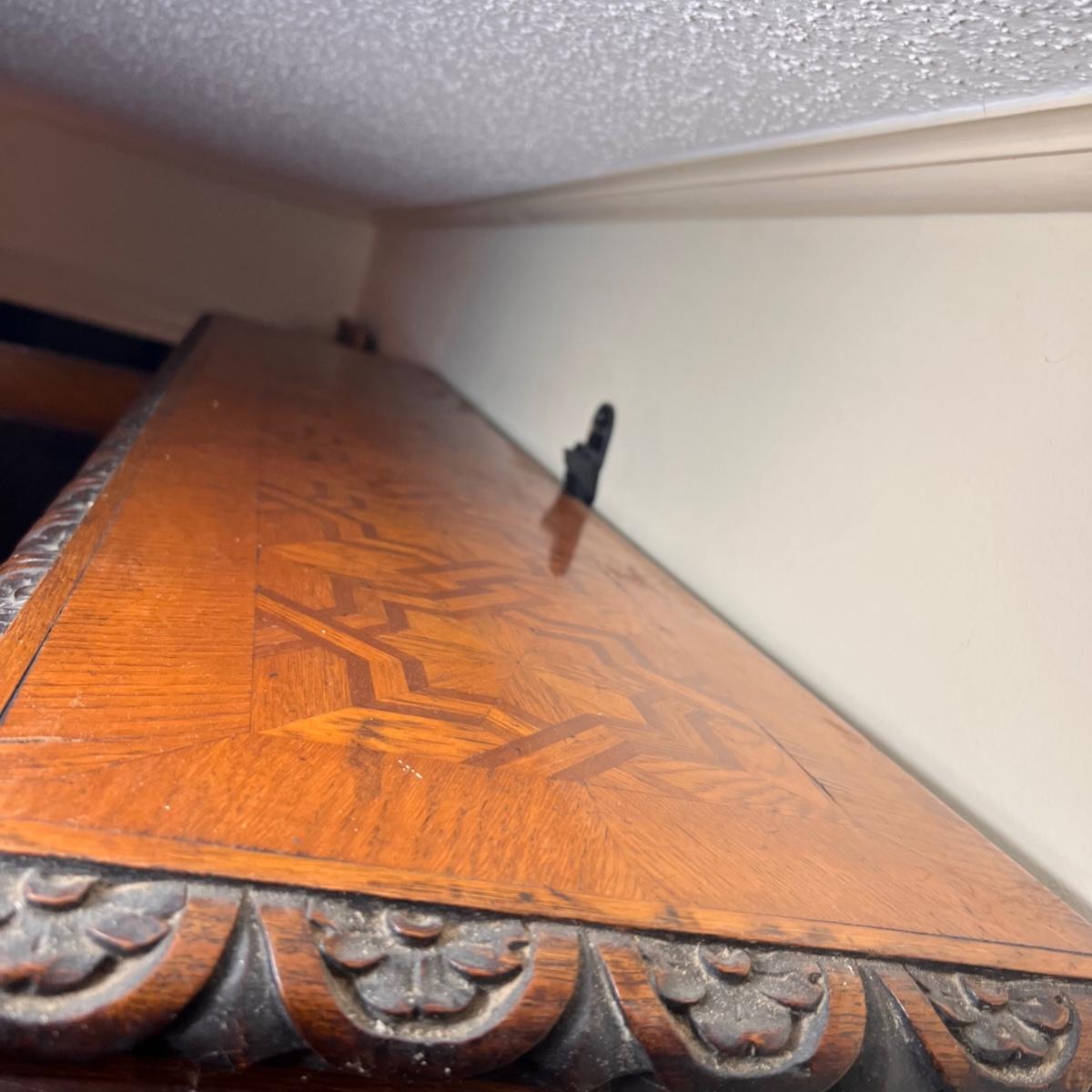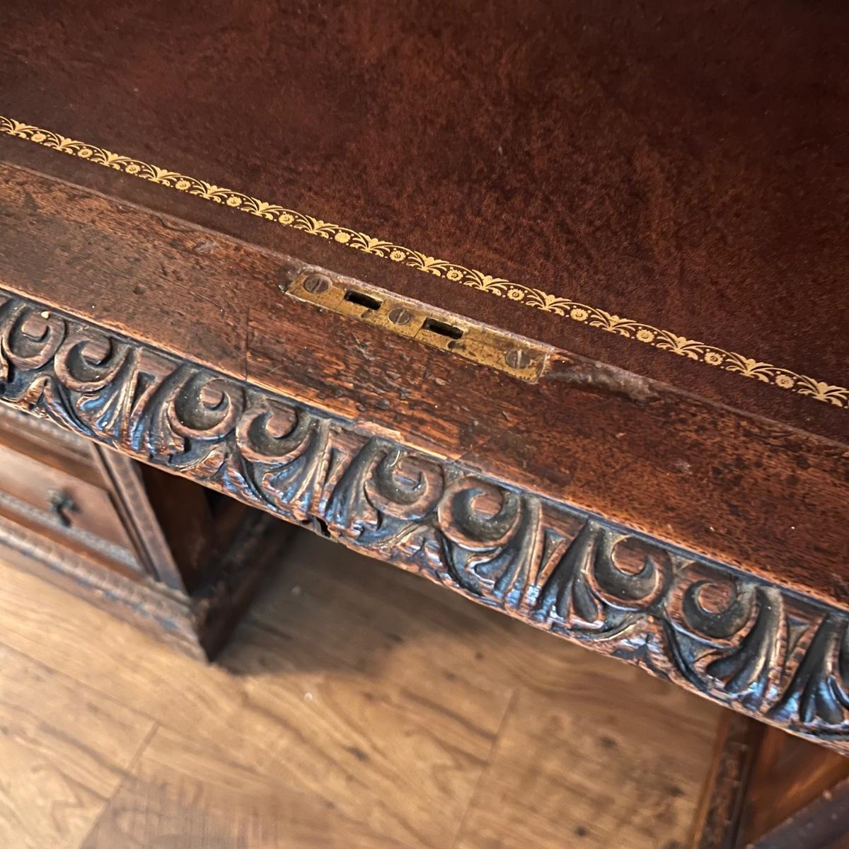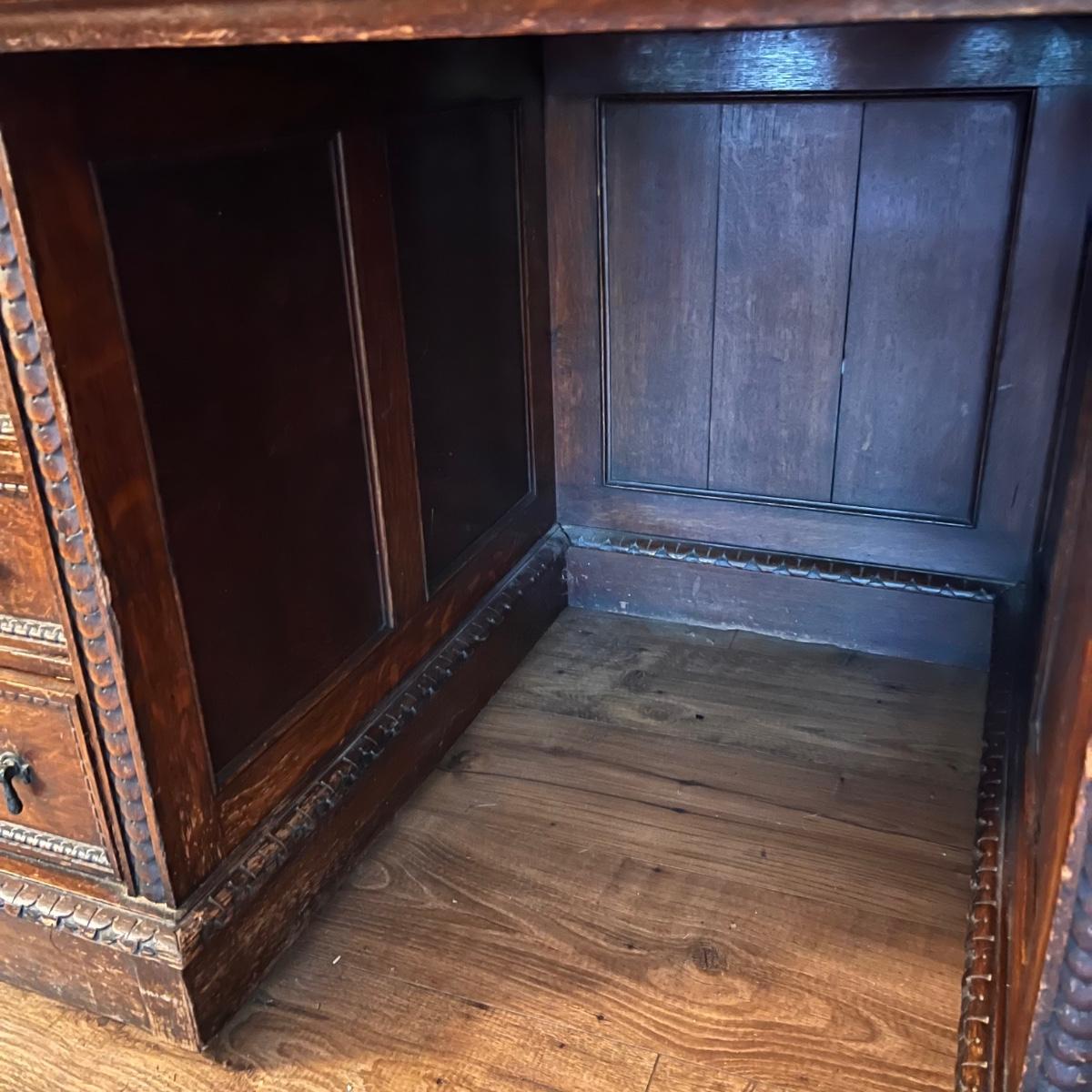 This beautifully crafted and carved furniture is a large solid wood roll top two piece desk. The upper portion is a glass door cabinet with three shelves. Both it and the desk it sits on have locks but no keys are included. The desk is very unique in that the leather covered writing area pulls out approximately 6”. The drawers are locked shut when this section is pushed back but if you pull it out an inch or more, the drawers miraculously unlock! Drawers on the left side are a little sticky to open, but just a tad. A few knicks and a mark on the roll top are shown in pics. Estate owner states this was imported from Scotland but no authentication included.