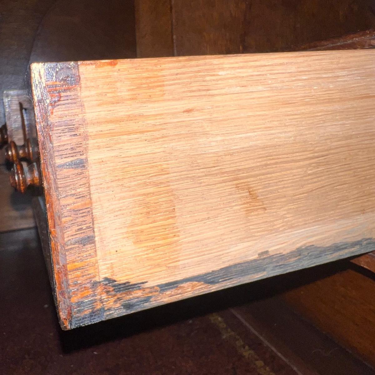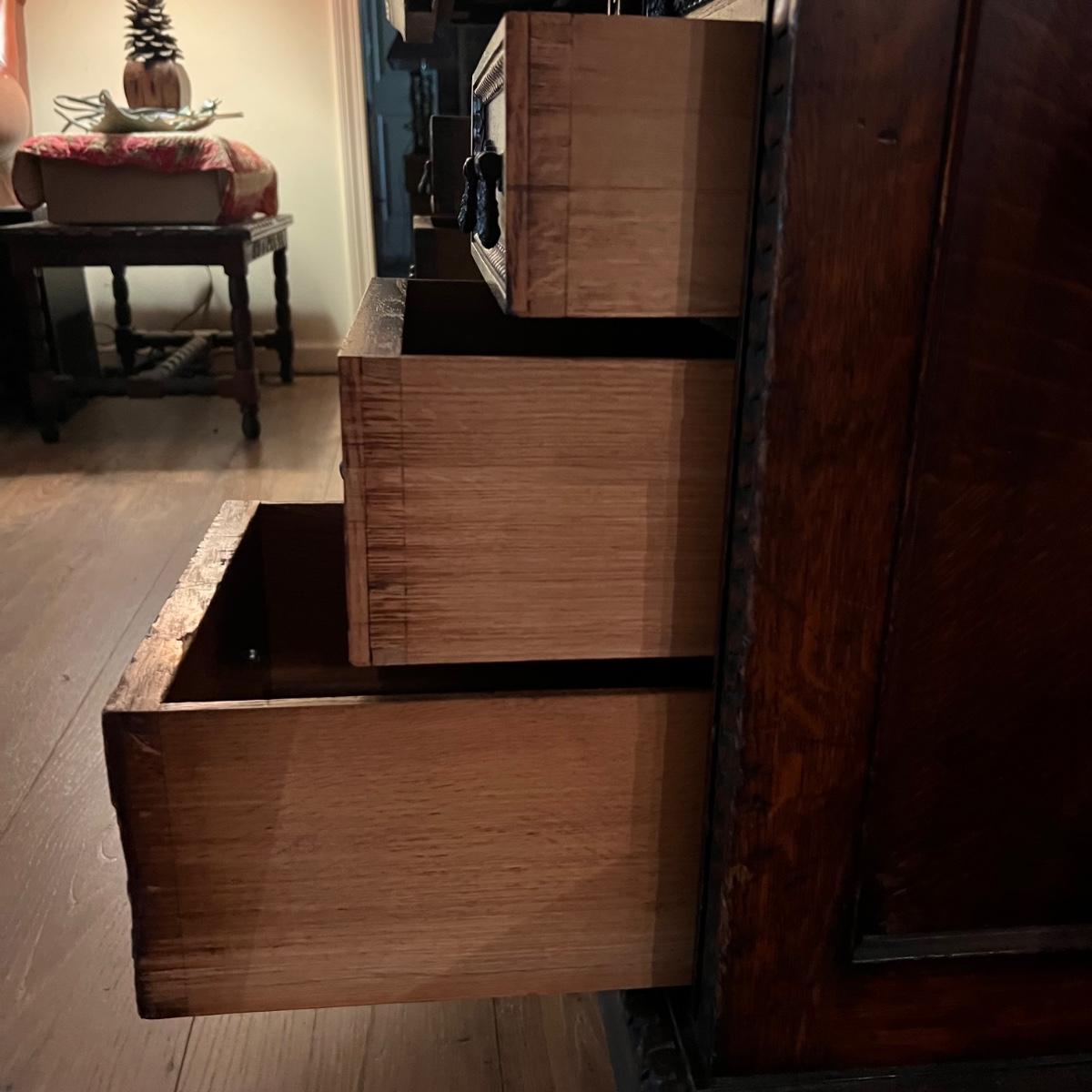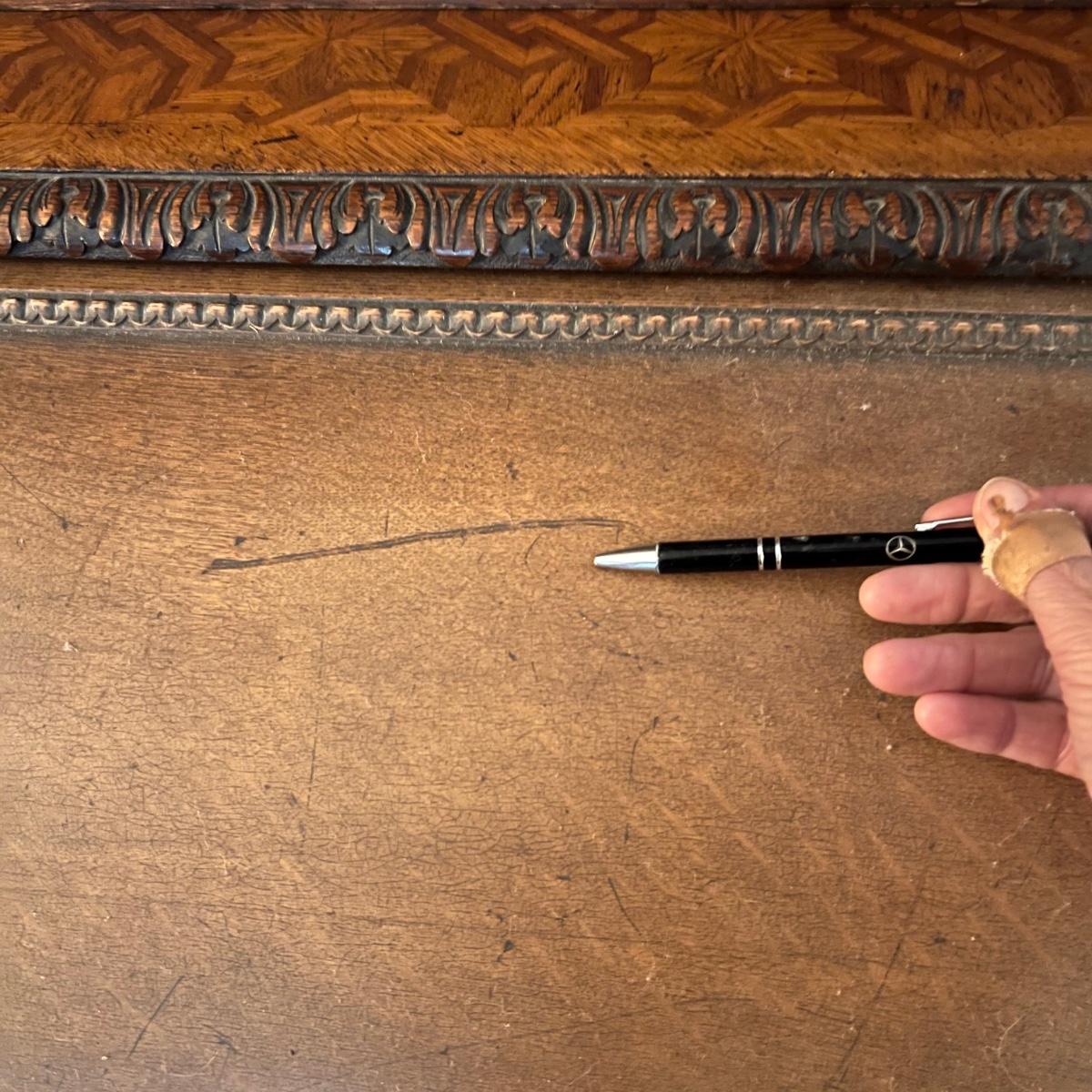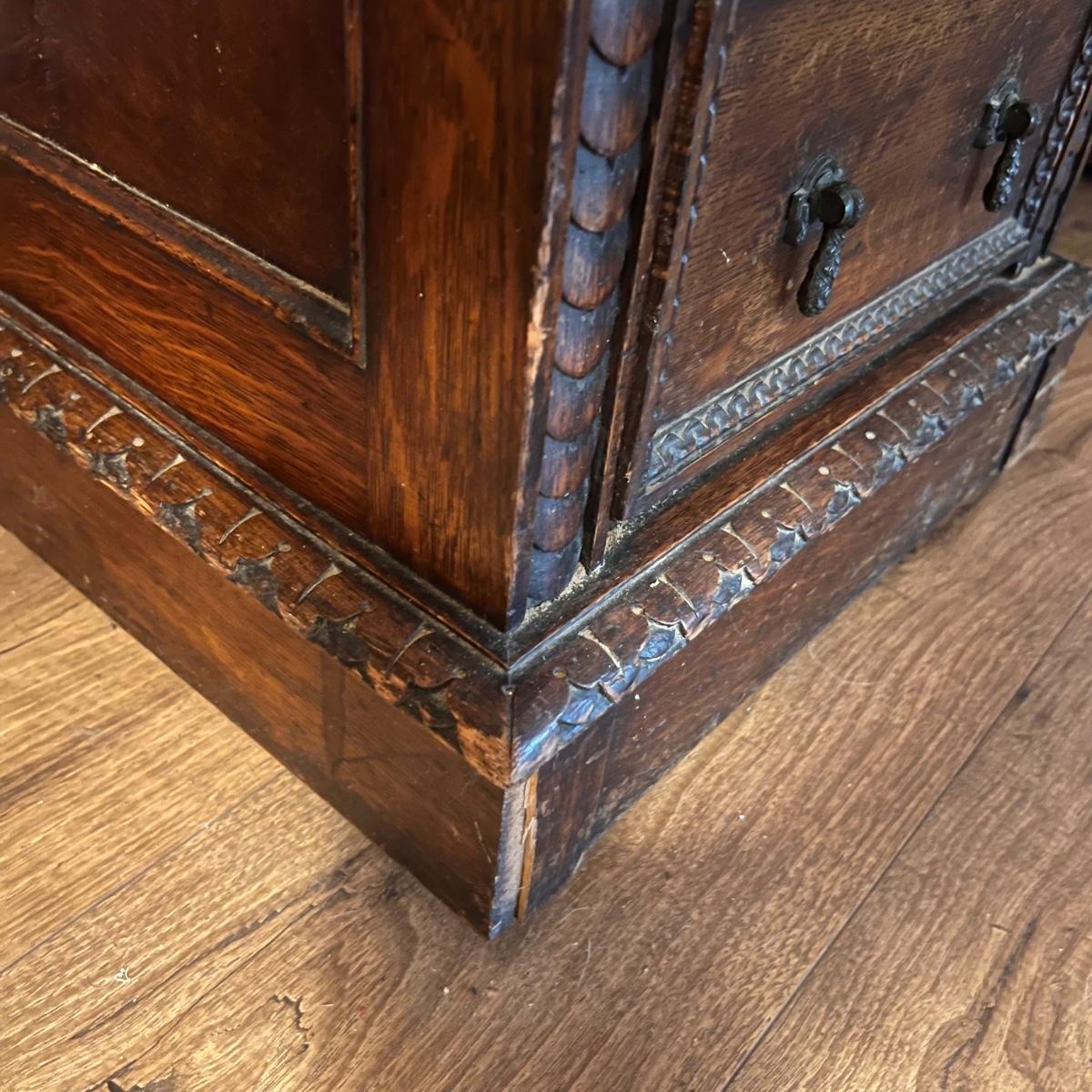 This beautifully crafted and carved furniture is a large solid wood roll top two piece desk. The upper portion is a glass door cabinet with three shelves. Both it and the desk it sits on have locks but no keys are included. The desk is very unique in that the leather covered writing area pulls out approximately 6”. The drawers are locked shut when this section is pushed back but if you pull it out an inch or more, the drawers miraculously unlock! Drawers on the left side are a little sticky to open, but just a tad. A few knicks and a mark on the roll top are shown in pics. Estate owner states this was imported from Scotland but no authentication included.