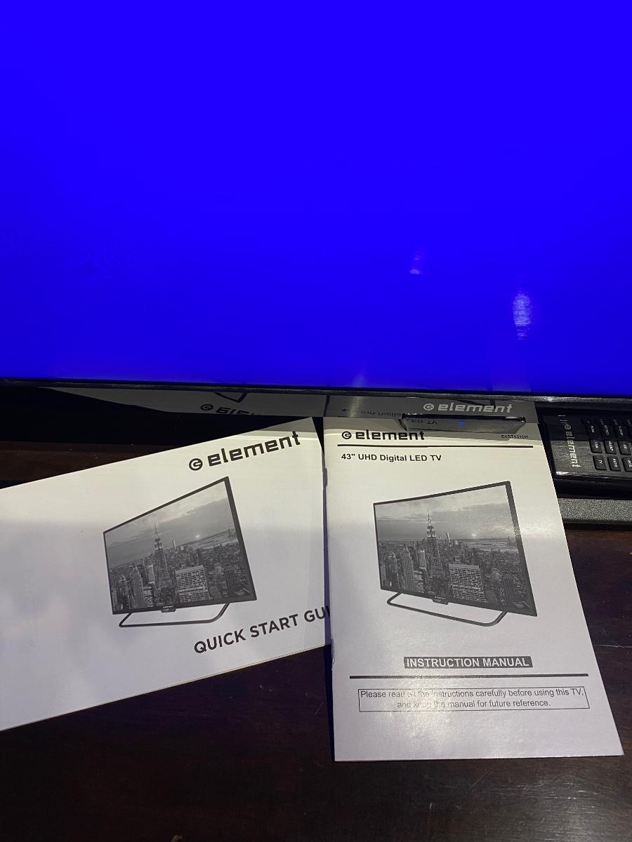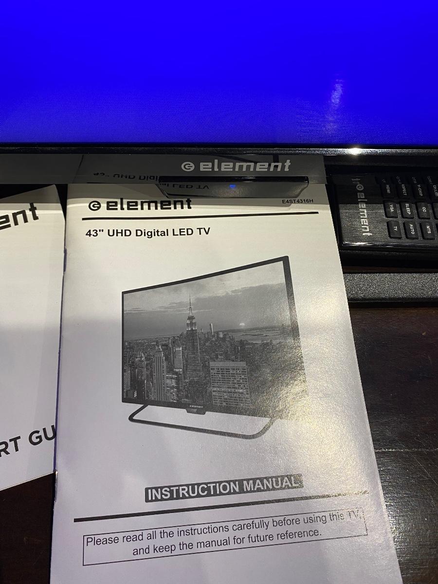 43" UHD Digital LED Tv with remote from Element. Did not have antenna or cable to test picture but it does seem to be working. Comes with instructions & quick start guide.