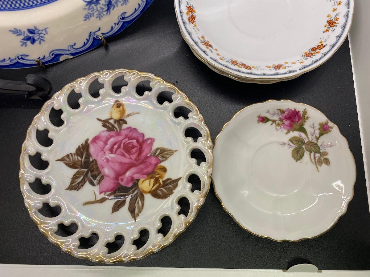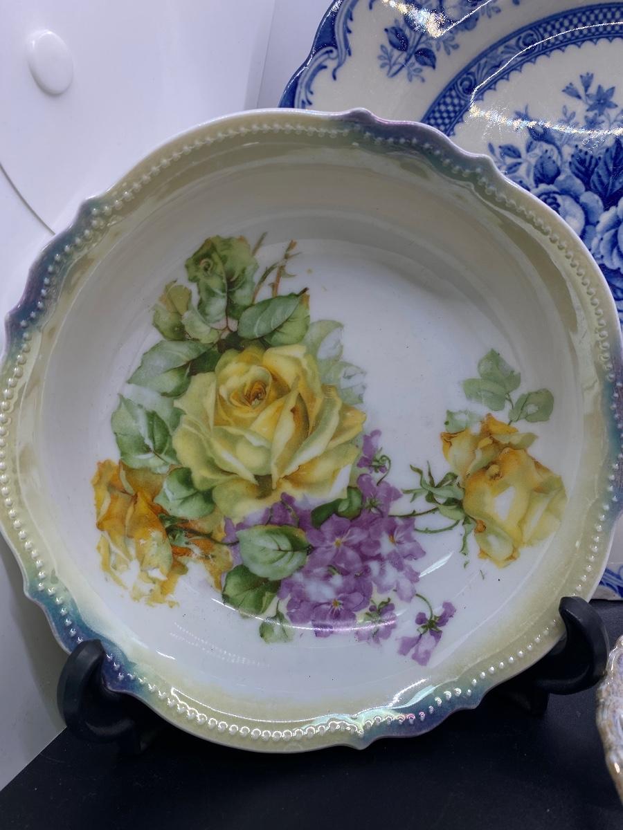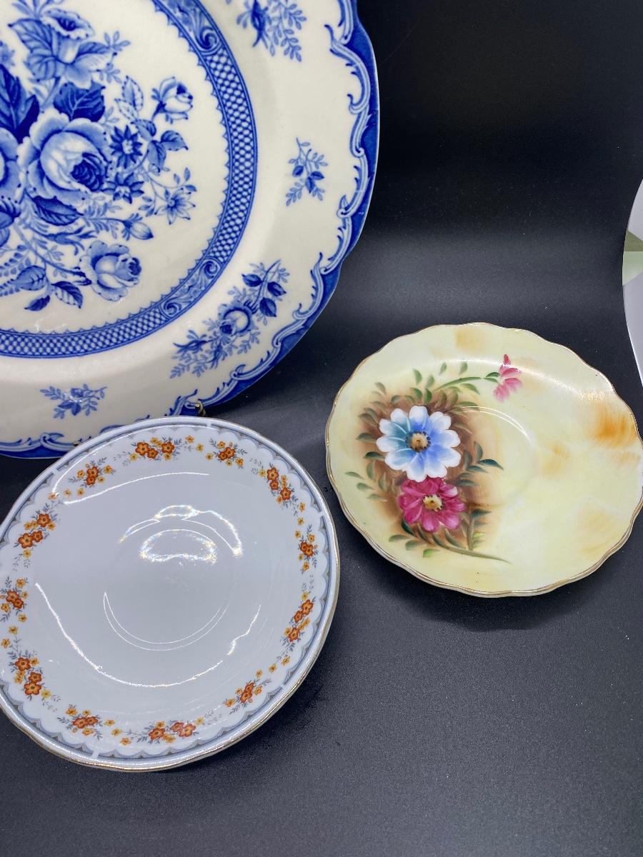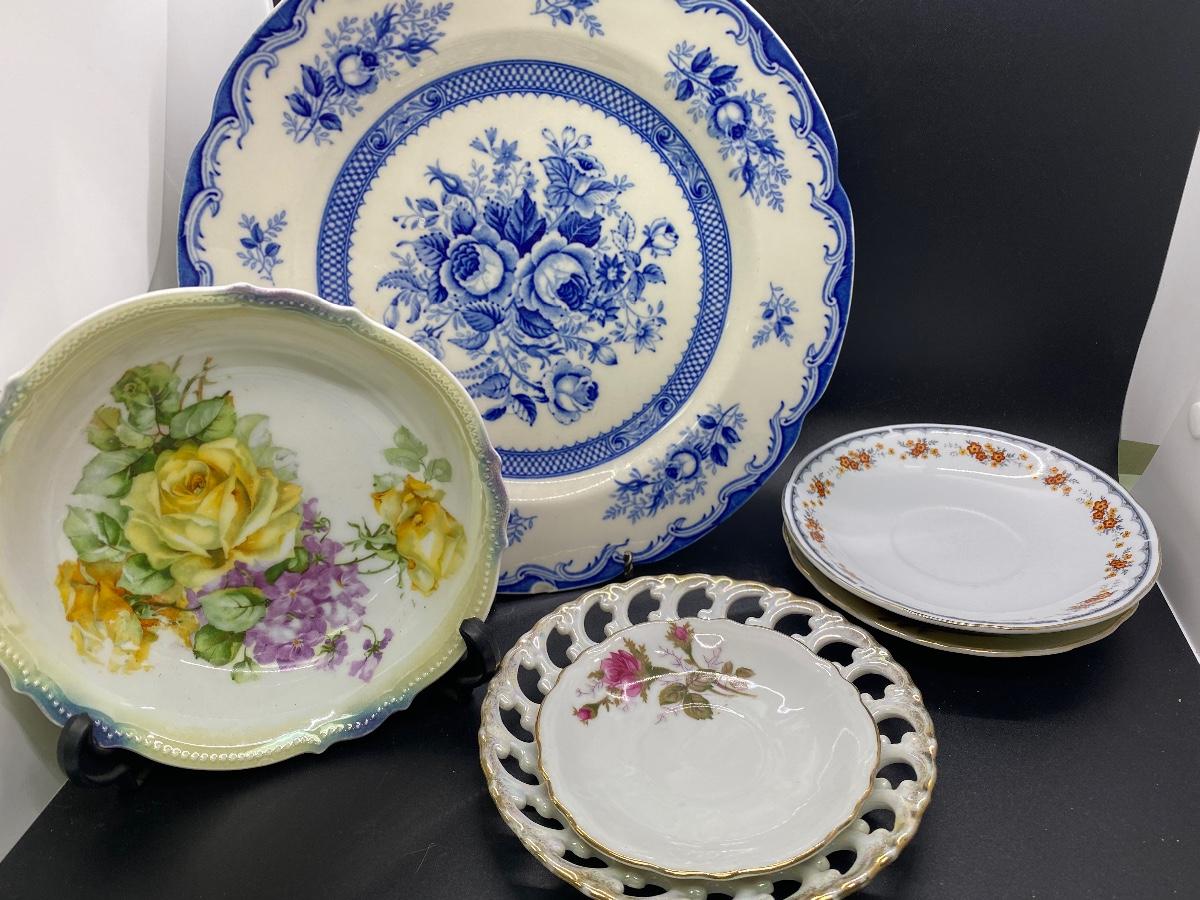Miscellaneous Vintage Pieces of China Dishware. Various patterns, sizes, and makers. Some marked and unmarked pieces. The flow blue plate does have a small chip along edge.