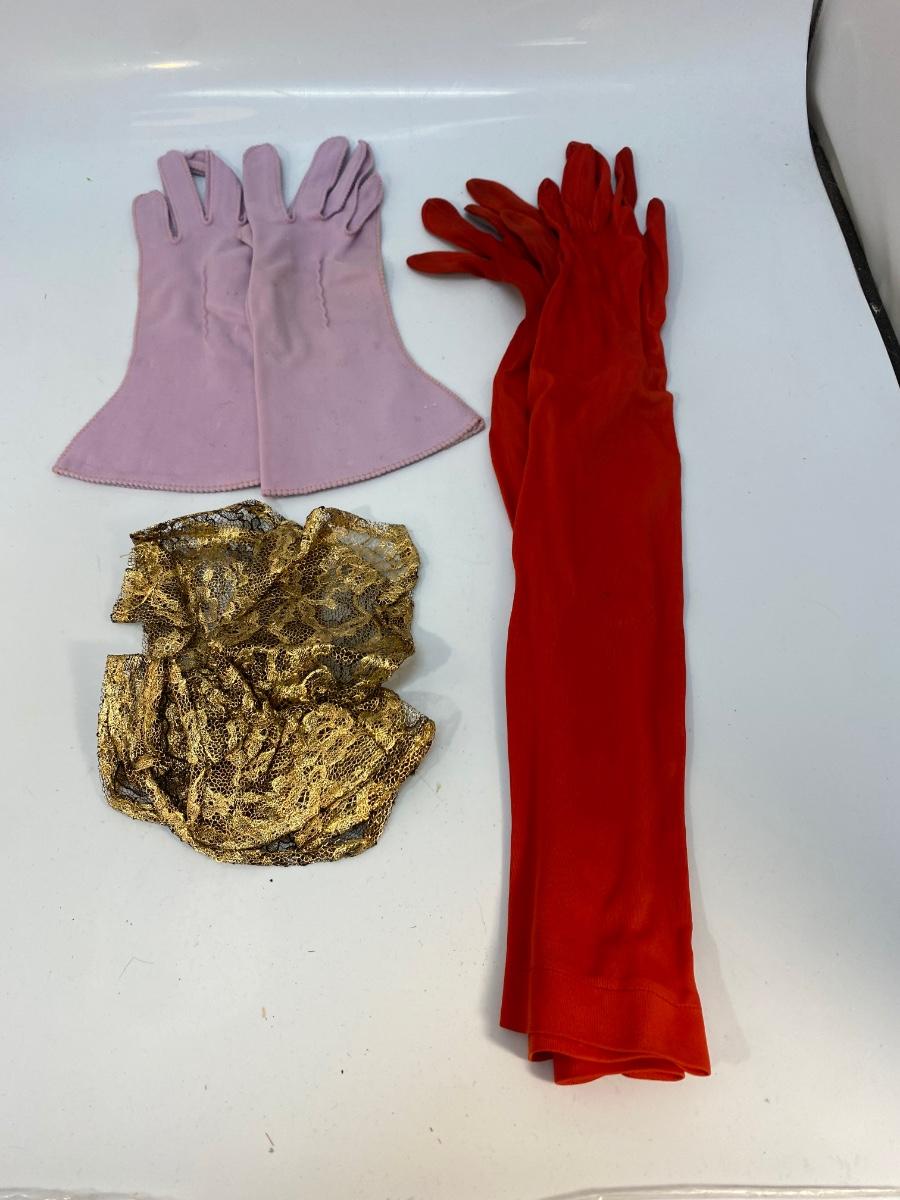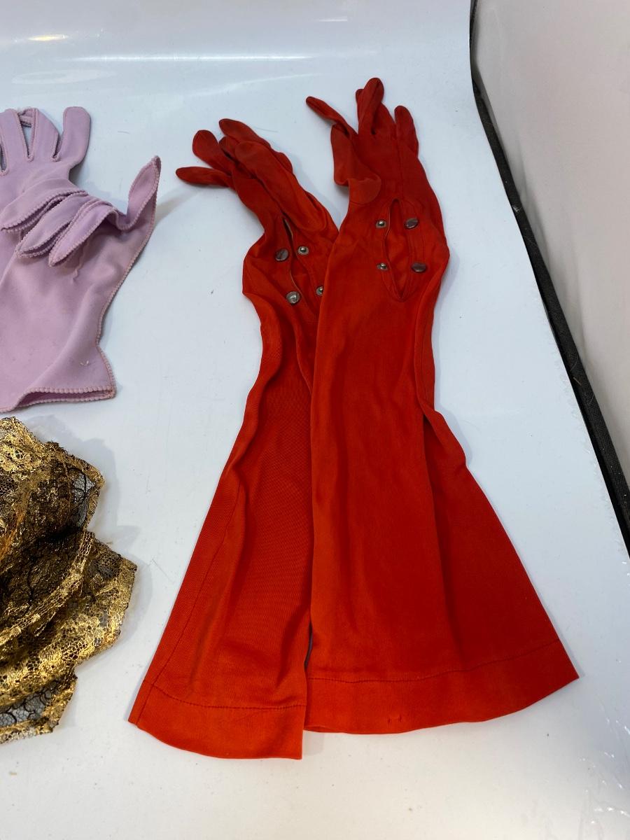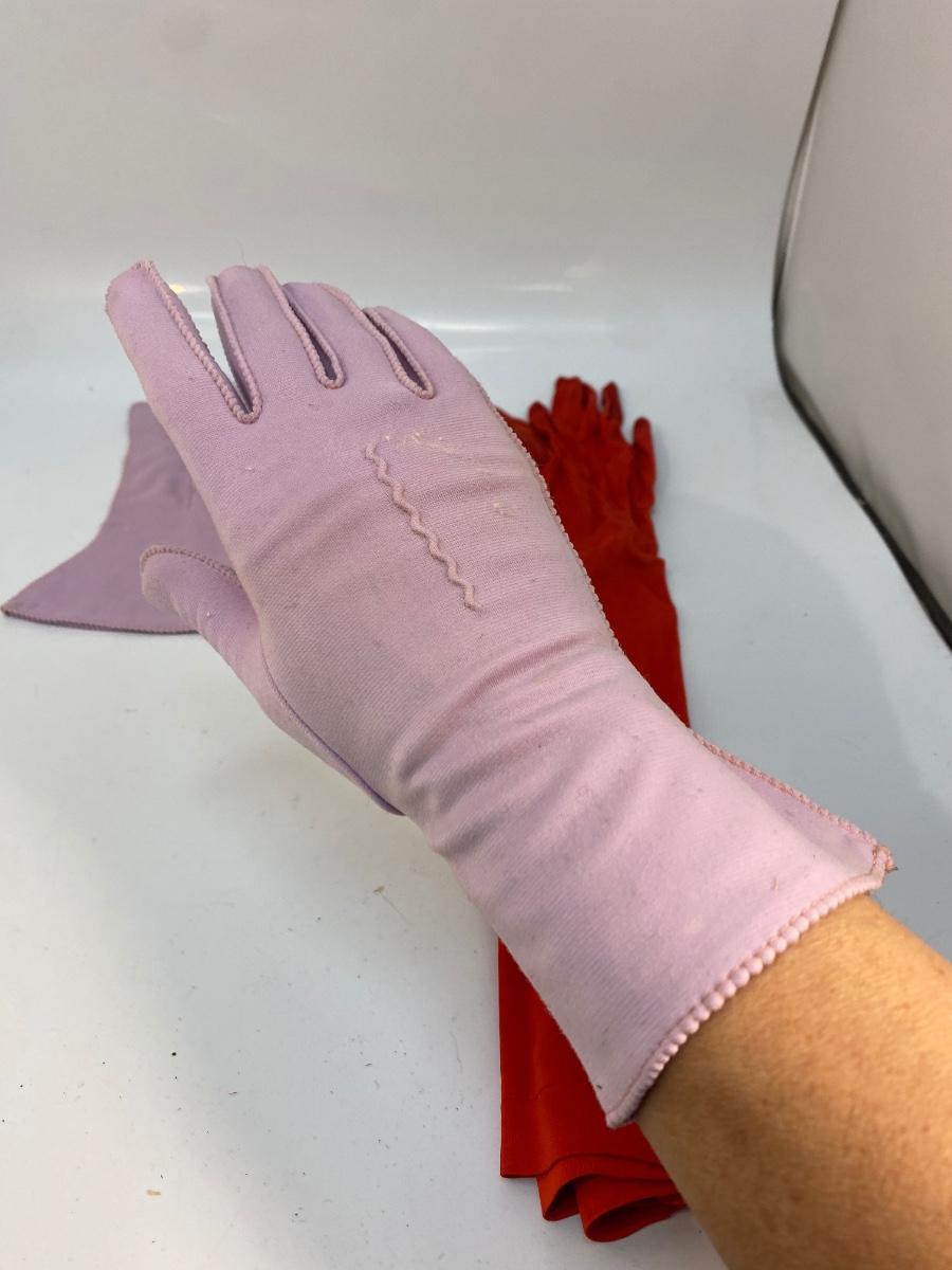 Three Pairs of Vintage Colorful Evening Gloves. Light purple, gold, and red. In previously worn condition. Small size hands.