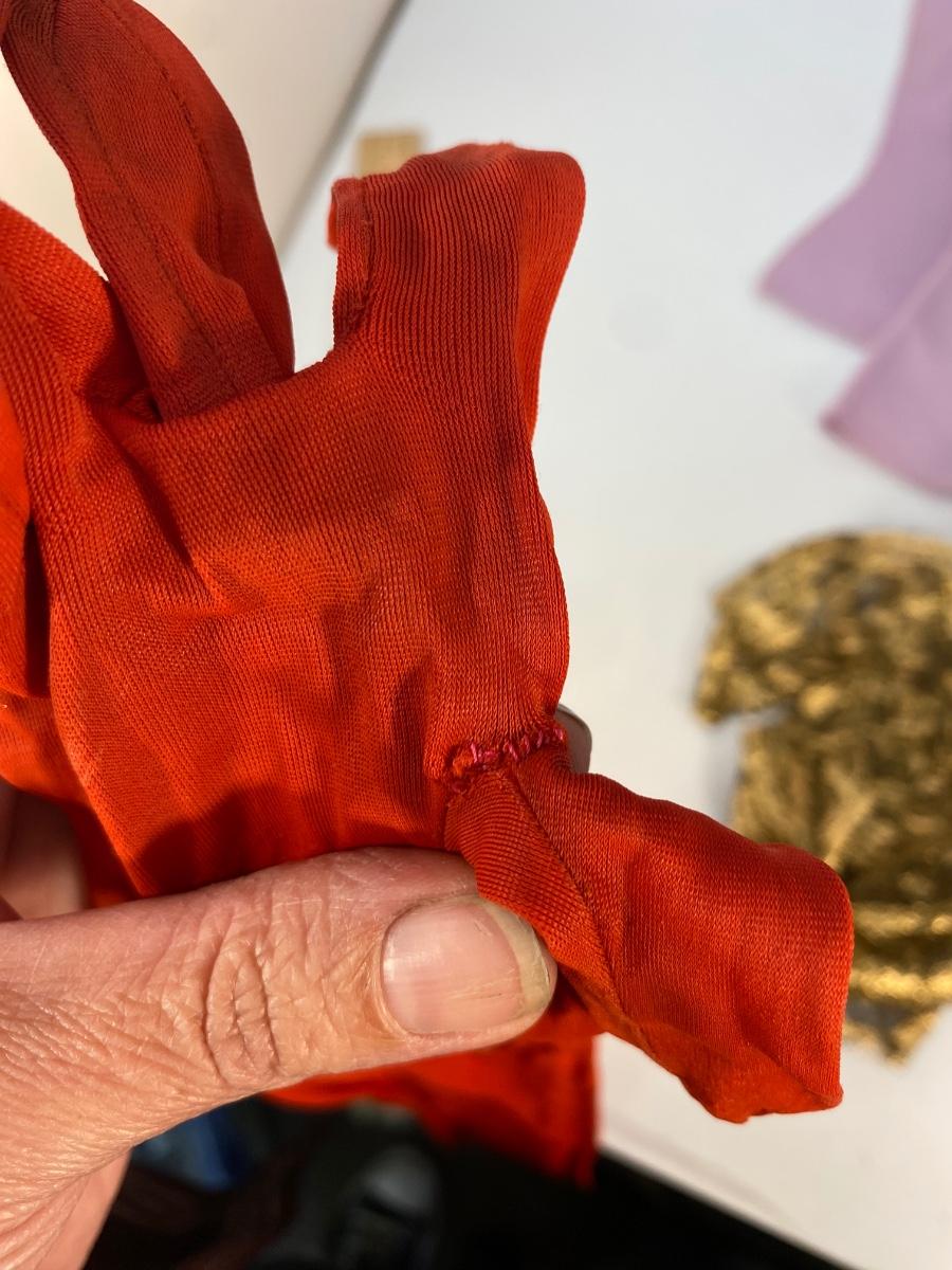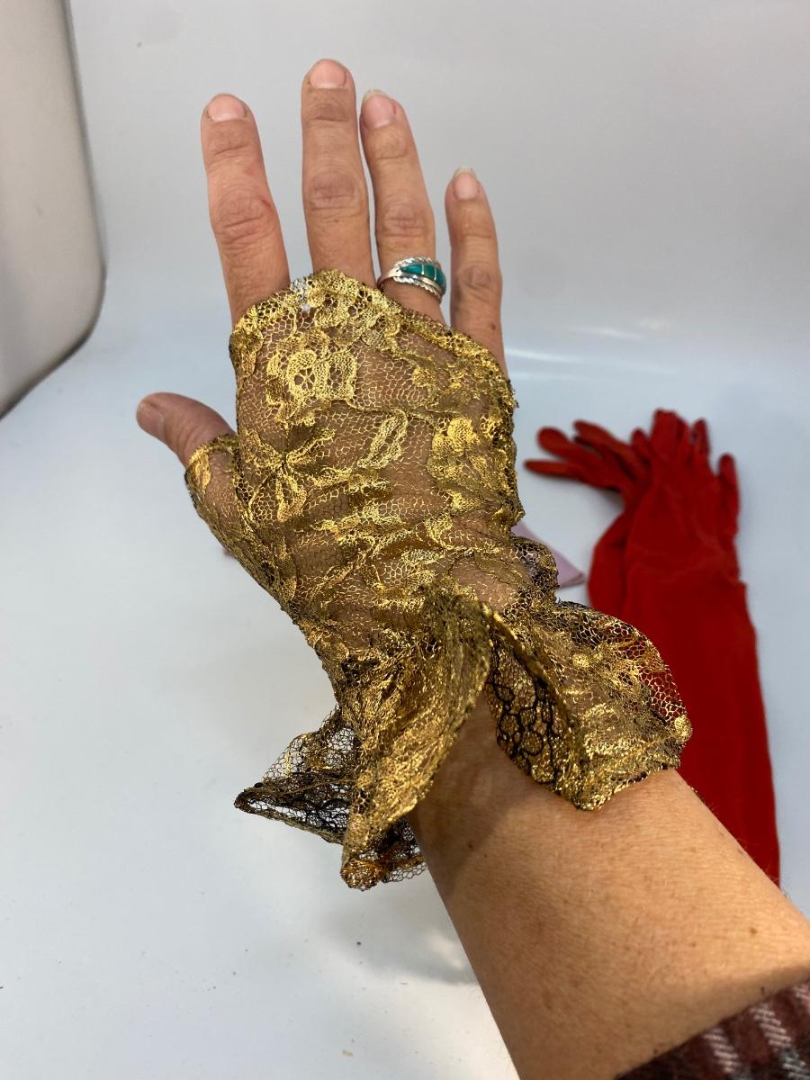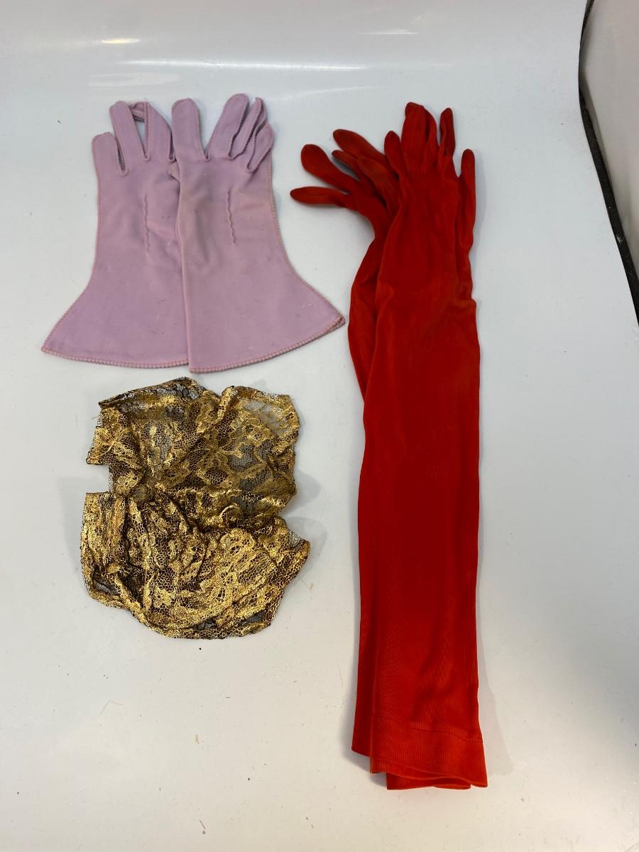 Three Pairs of Vintage Colorful Evening Gloves. Light purple, gold, and red. In previously worn condition. Small size hands.