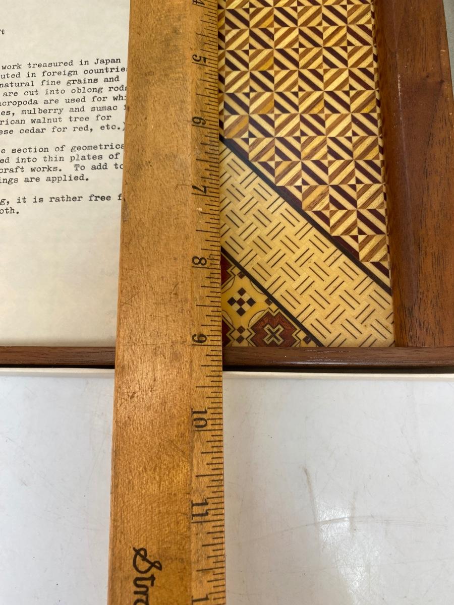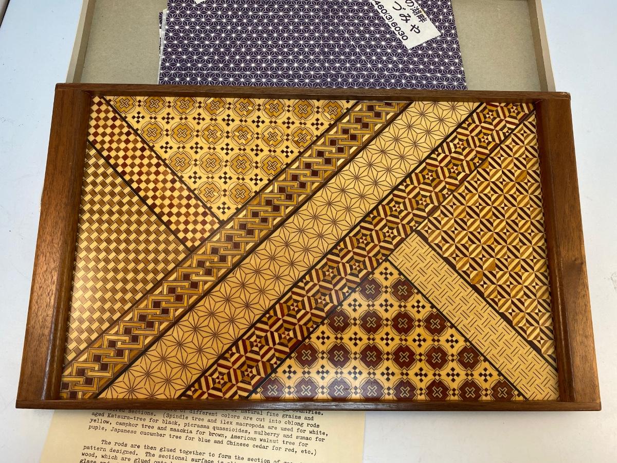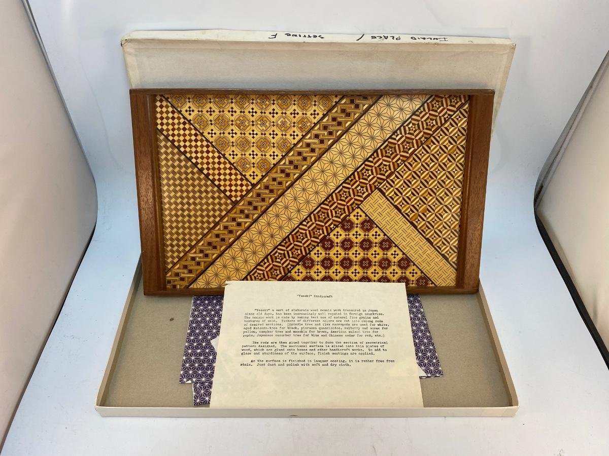 Vintage Ornate Geometric Inlaid Wood Serving Tray Japan Yoseki Handicraft. Beautiful multicolored wood tray with a mosaic geometric pattern. Comes with info sheet, in original box and has what looks like the paper shopping bag folded up in the box from Japan. About 16"x9" size.