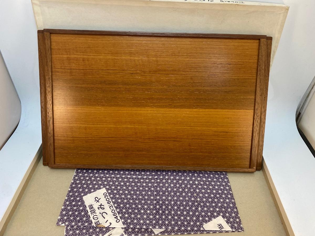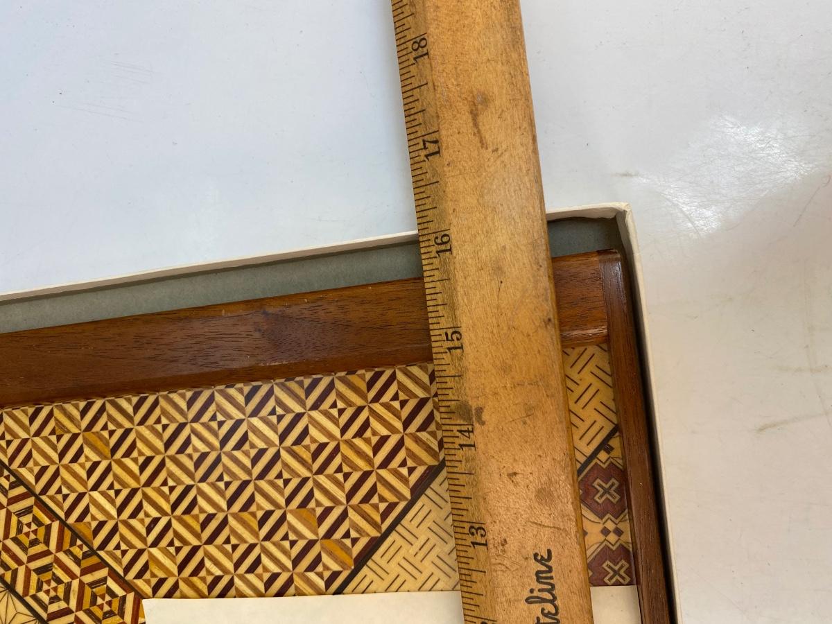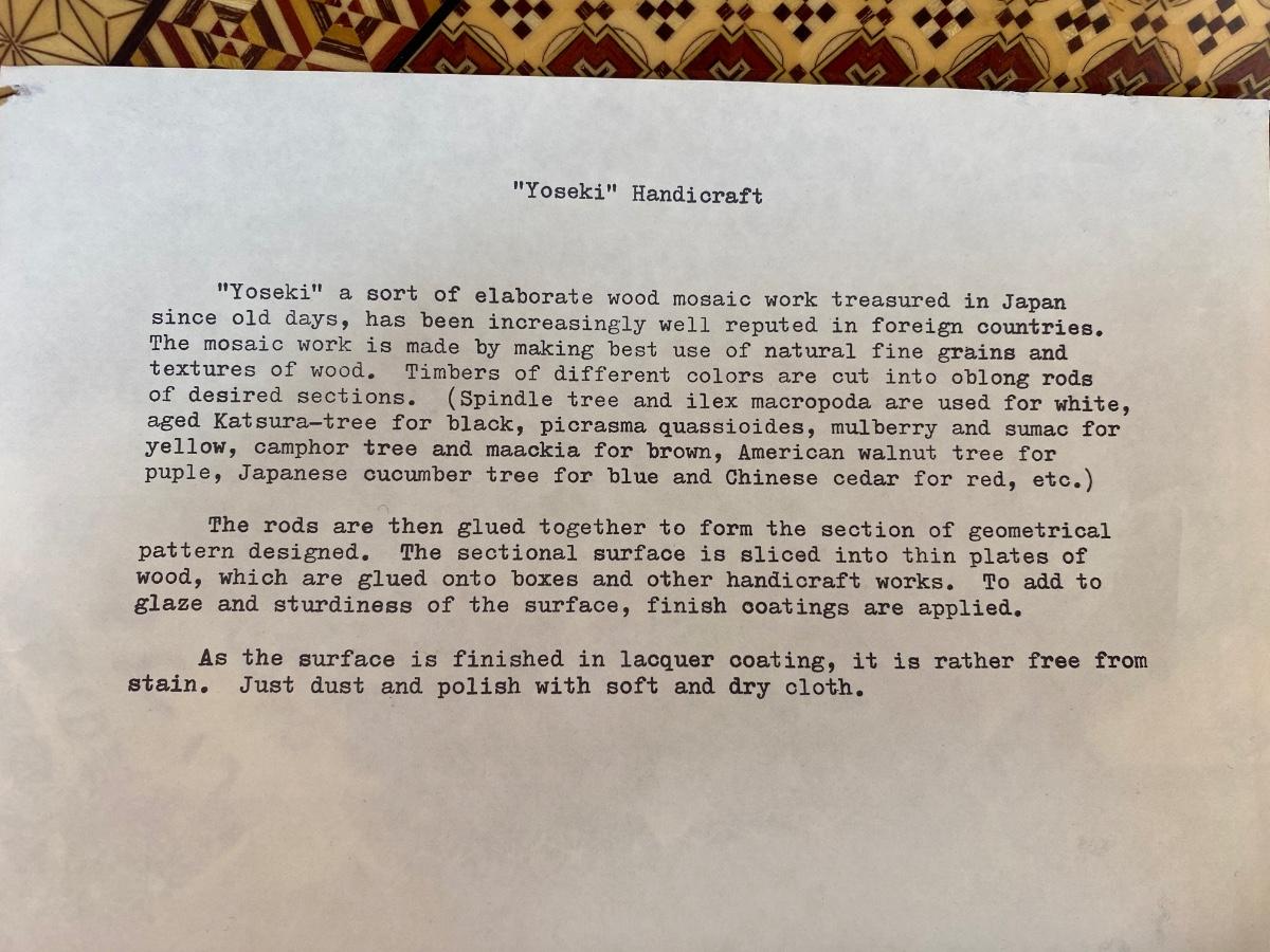 Vintage Ornate Geometric Inlaid Wood Serving Tray Japan Yoseki Handicraft. Beautiful multicolored wood tray with a mosaic geometric pattern. Comes with info sheet, in original box and has what looks like the paper shopping bag folded up in the box from Japan. About 16"x9" size.