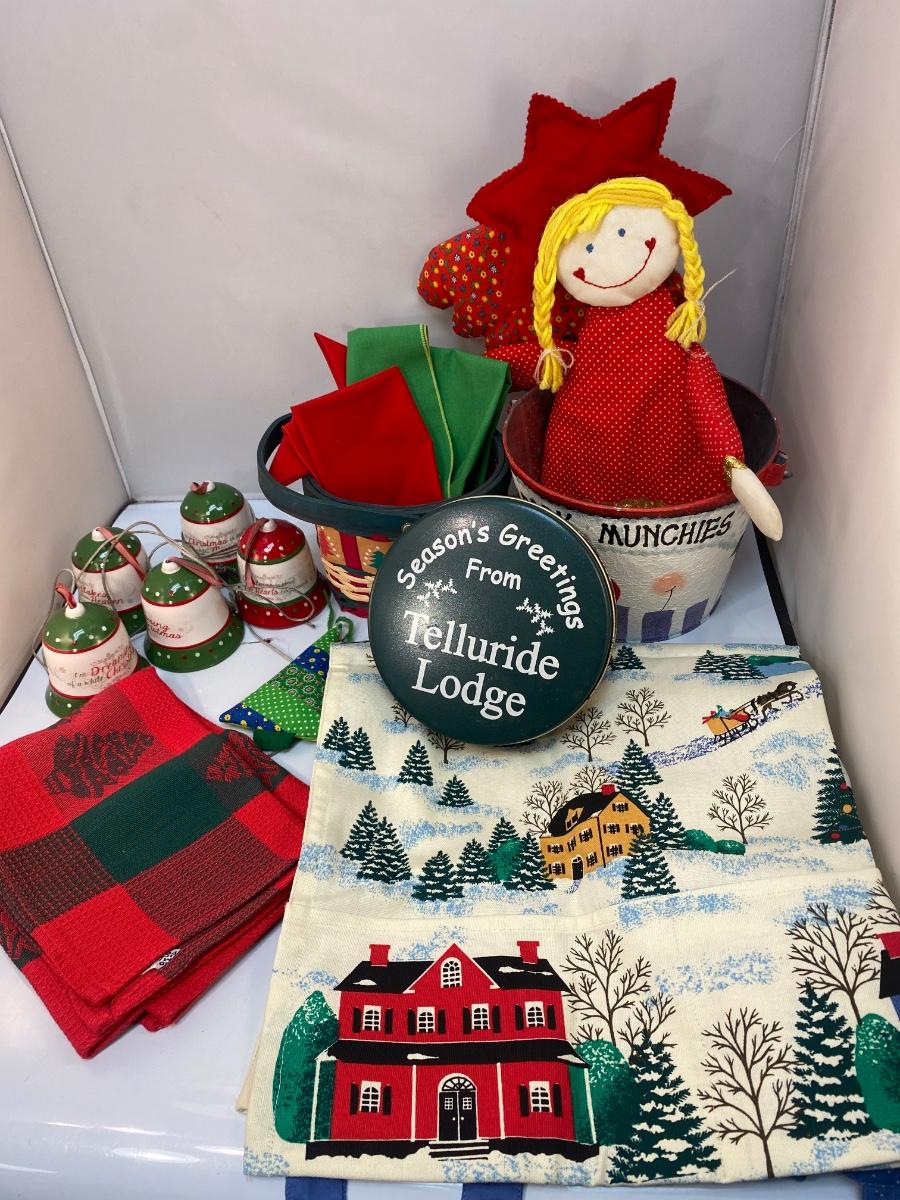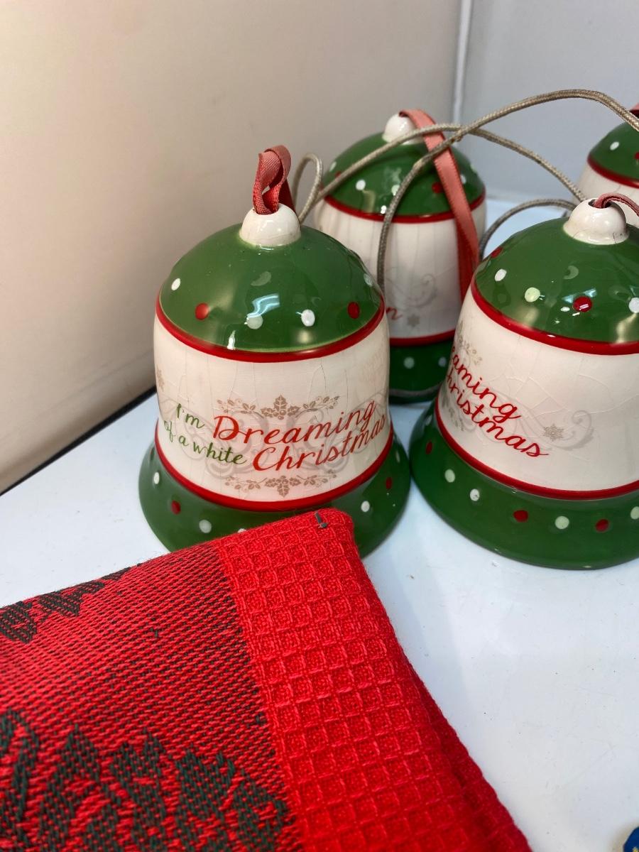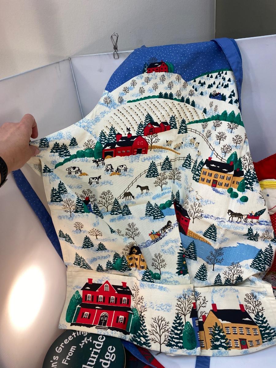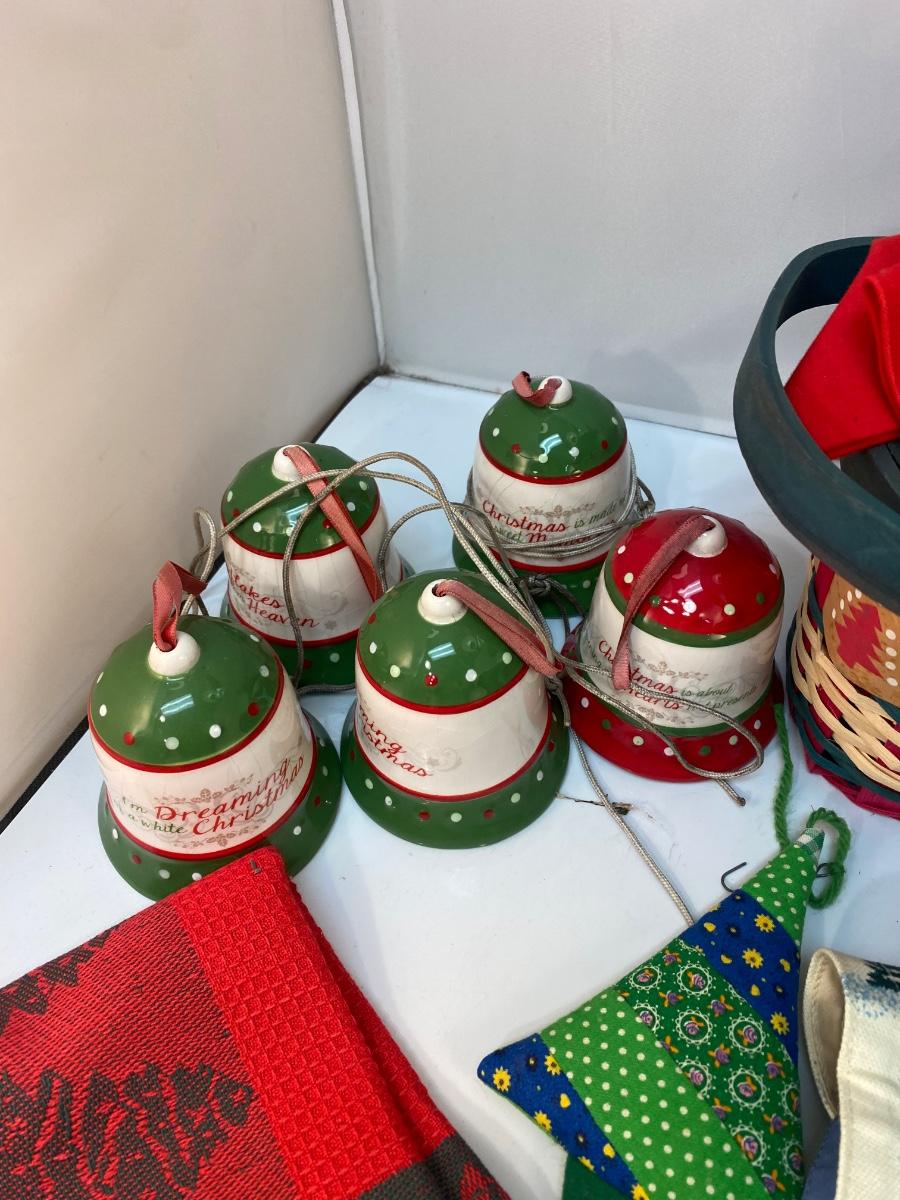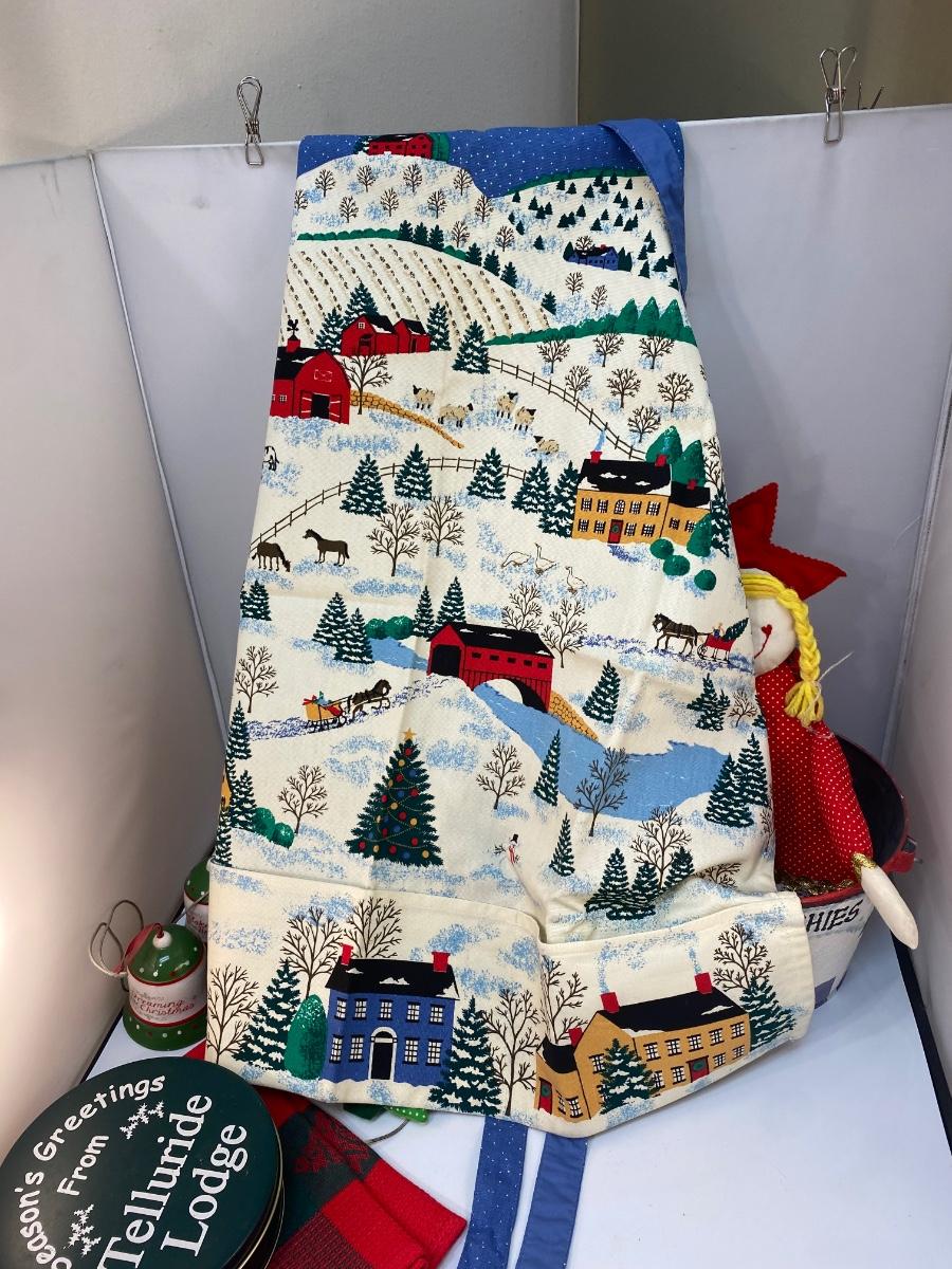 Mixed Lot of Various Christmas Holiday Decor. In fair condition. The ceramic hanging bells have crazing and may have been displayed outside previously. Winter themed apron is in good condition, looks unused.