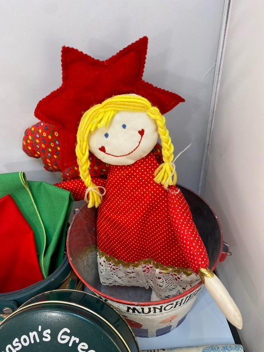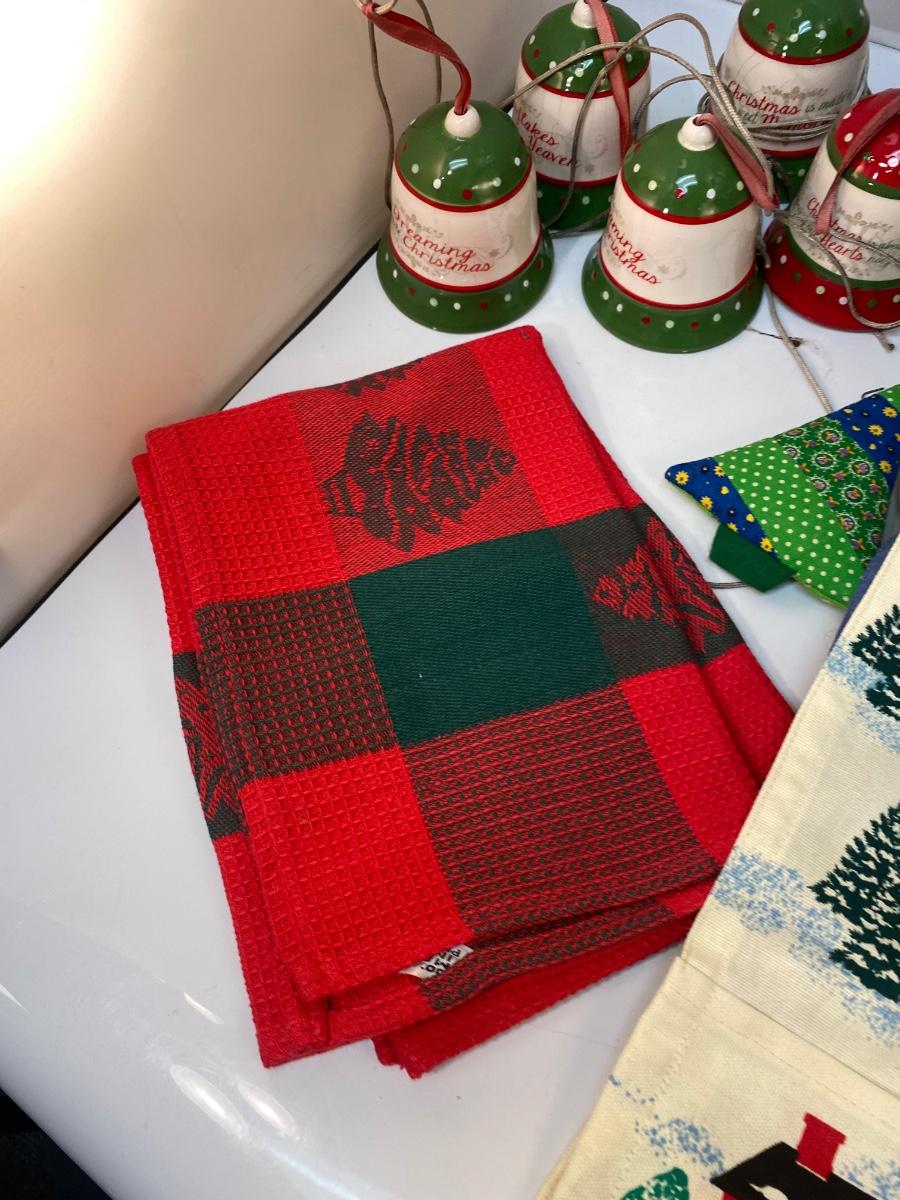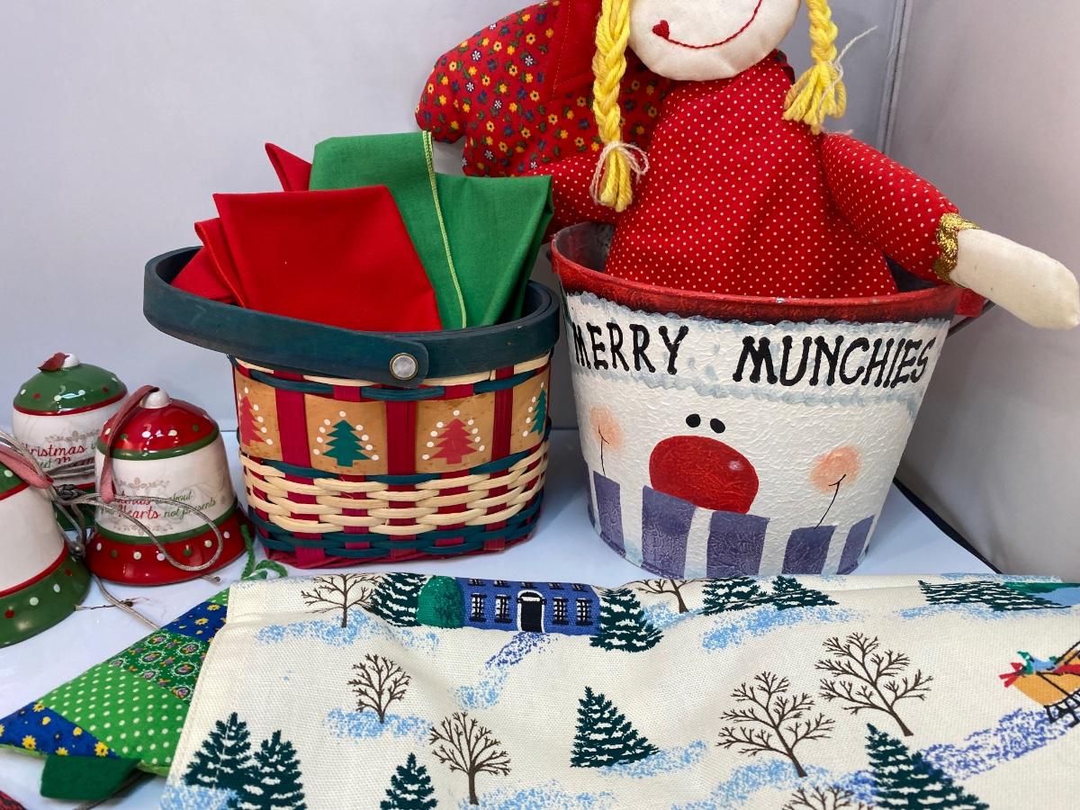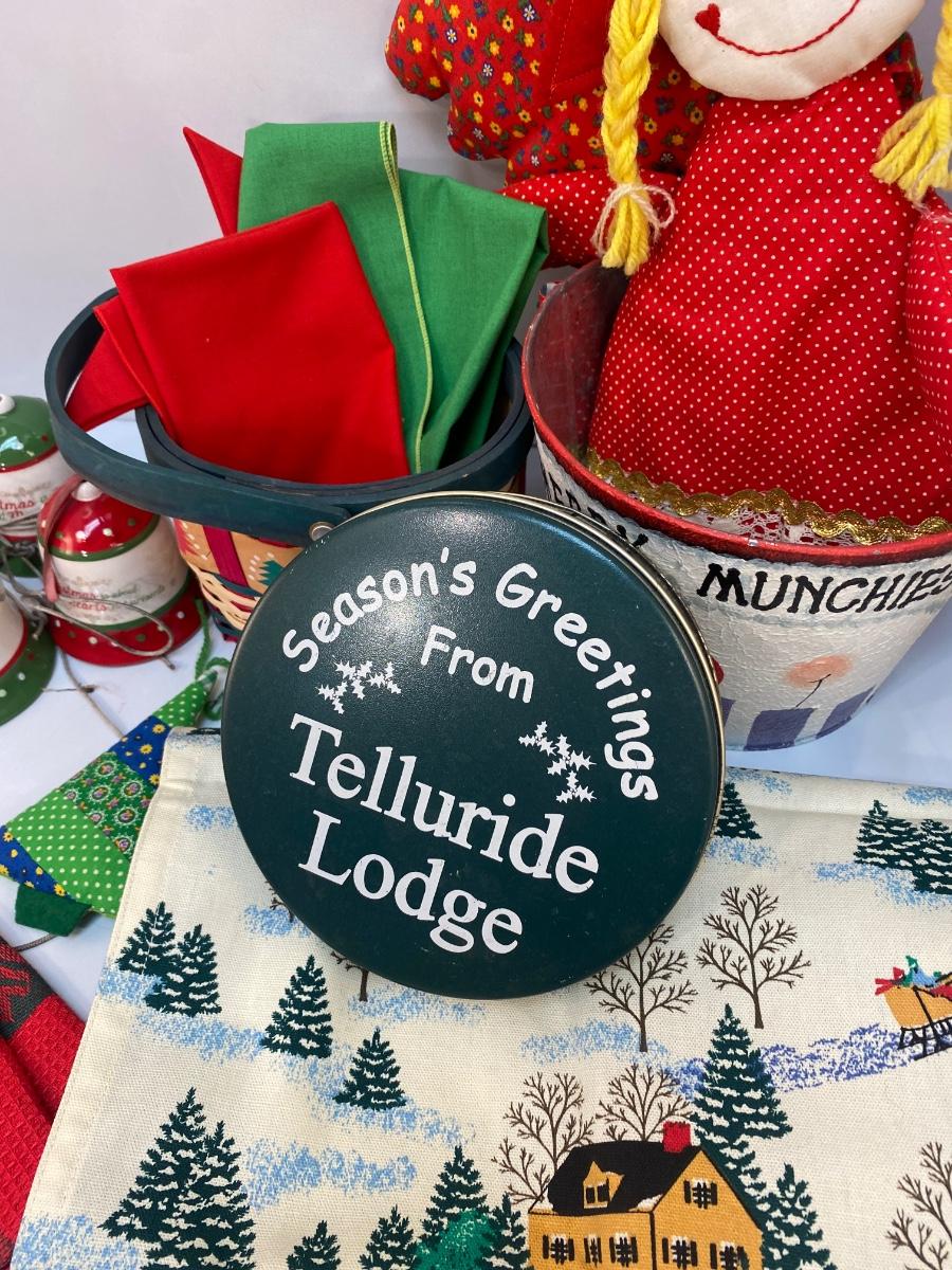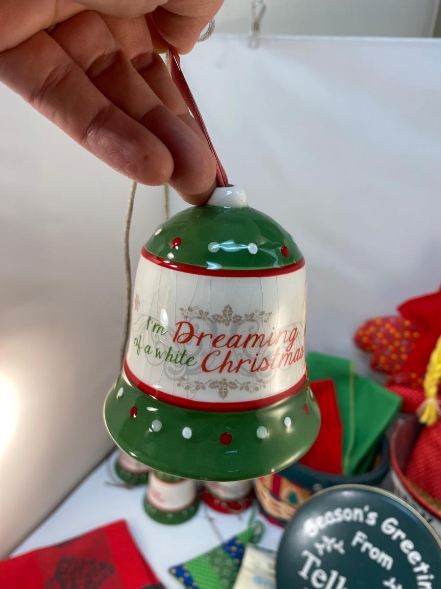 Mixed Lot of Various Christmas Holiday Decor. In fair condition. The ceramic hanging bells have crazing and may have been displayed outside previously. Winter themed apron is in good condition, looks unused.
