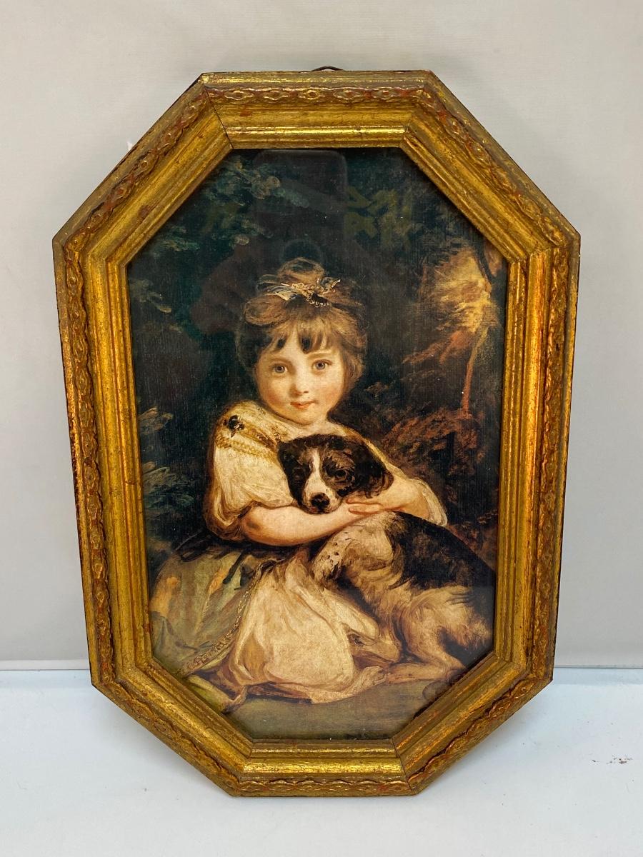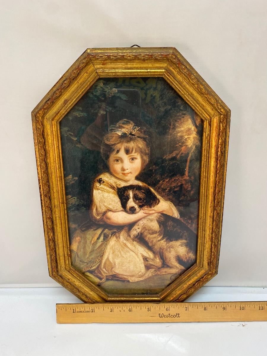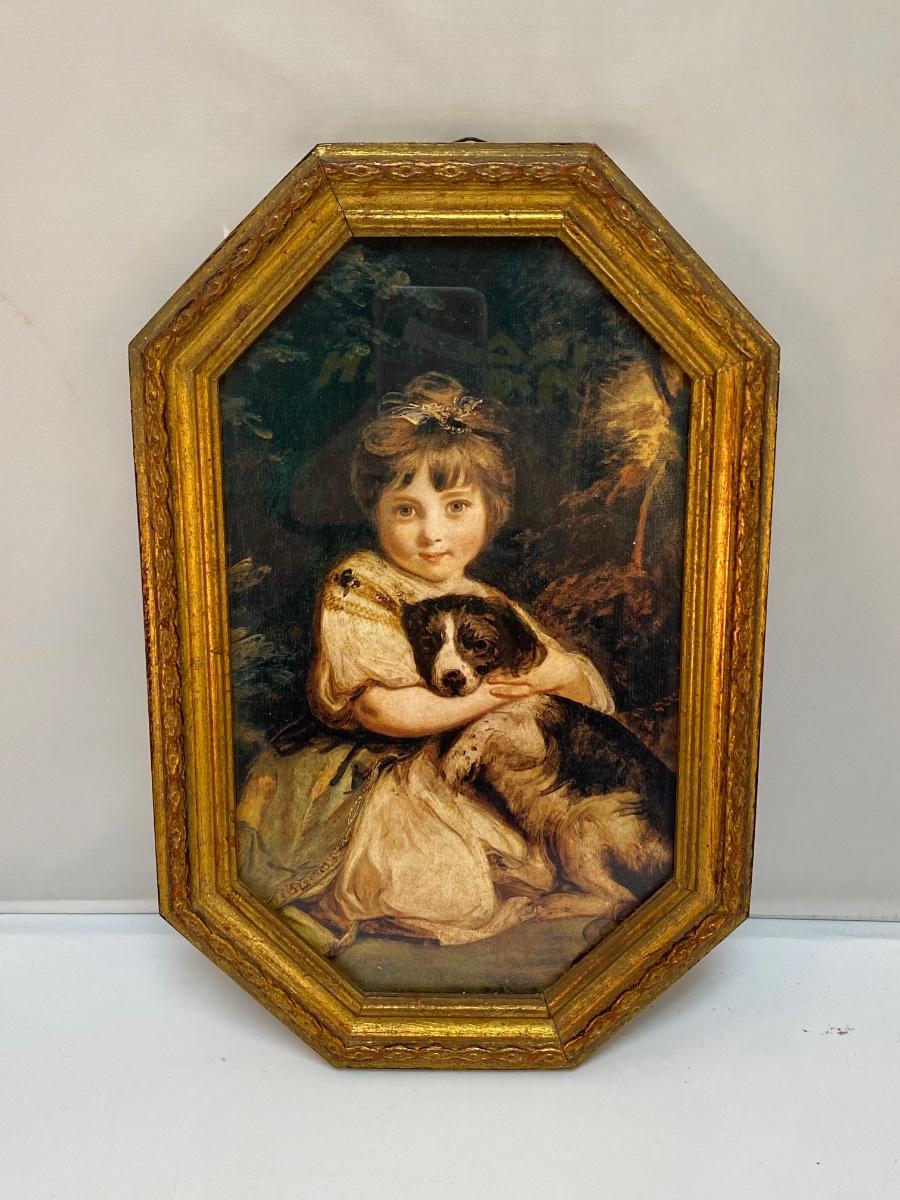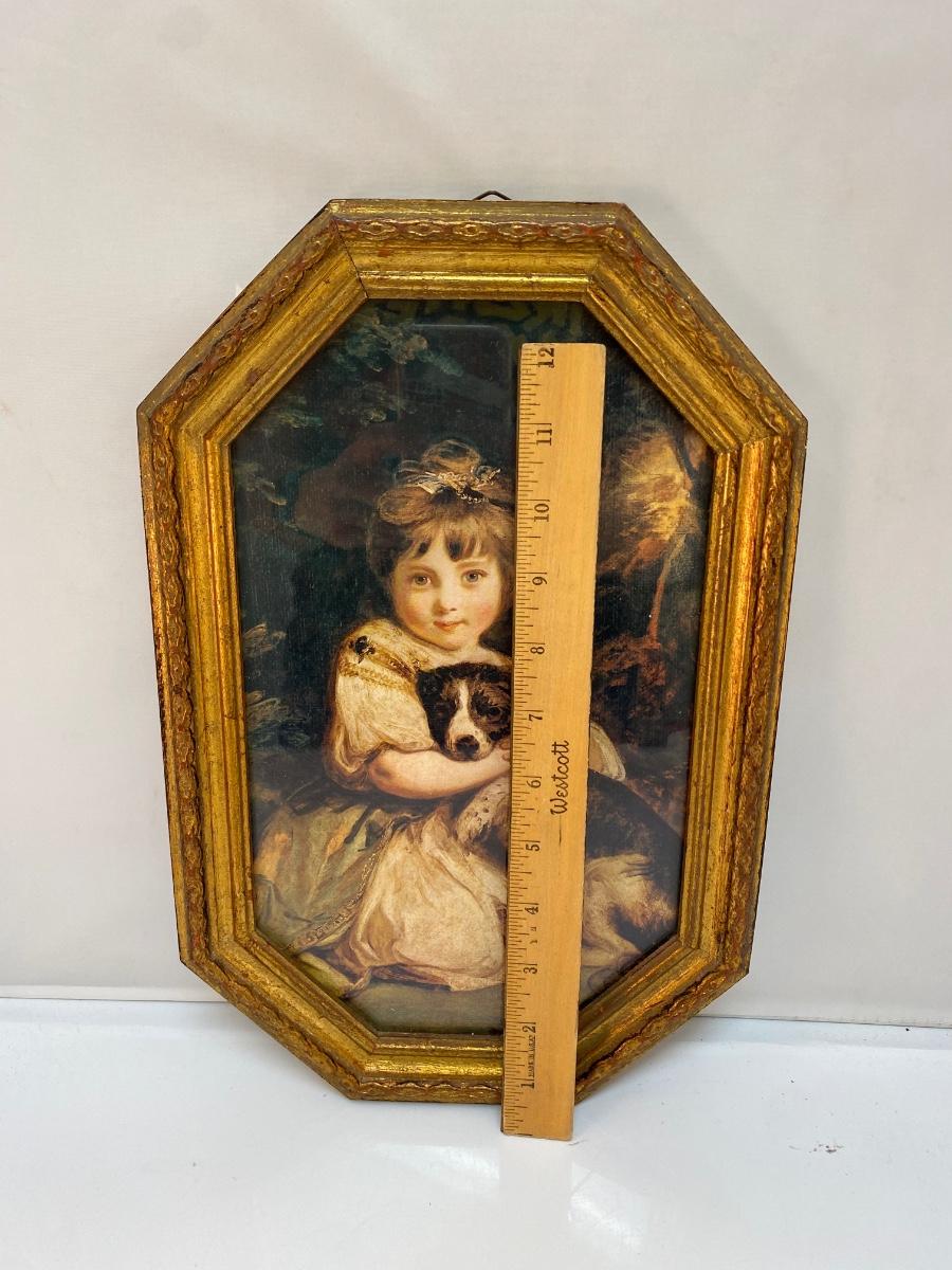 Vintage Joshua Reynolds Classic Art Print Reproduction Love Me Love My Dog Little Girl with Puppy. In good condition. Gold gilt frame about 14"x9" size.