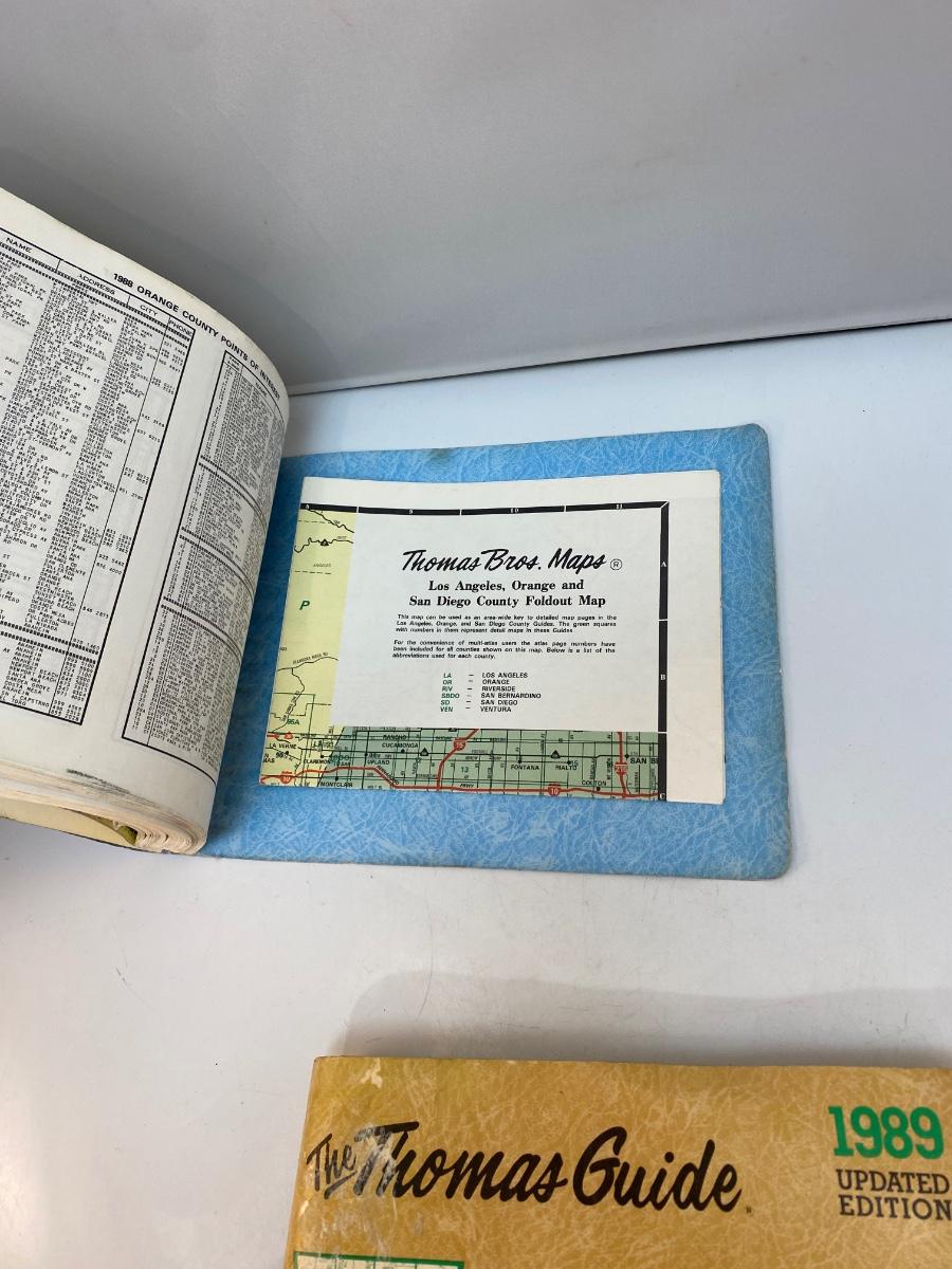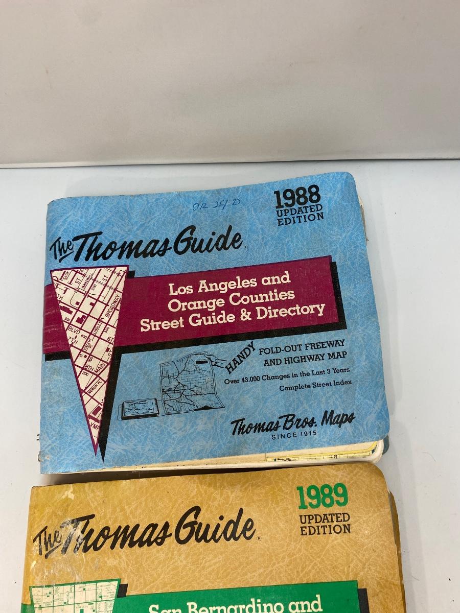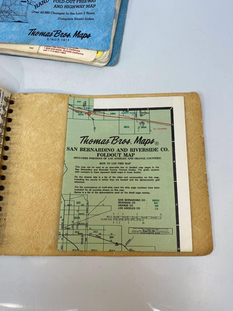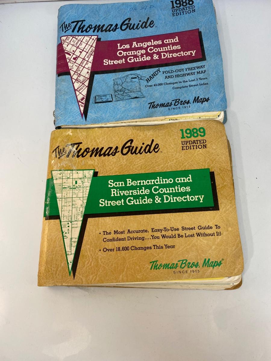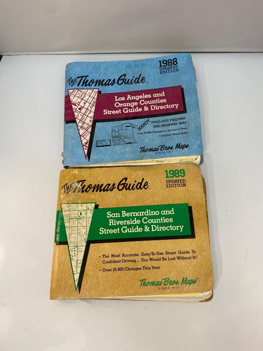 Thomas Bros. Gudie Map Books Los Angeles Orange Riverside San Bernardino County 1988 1989. In good used condition. Both have the fold out maps that came included.