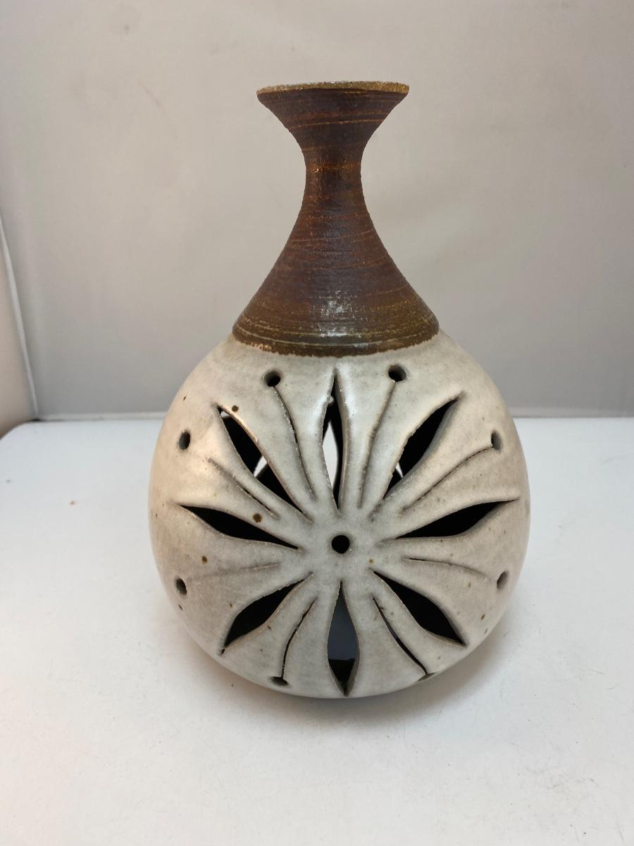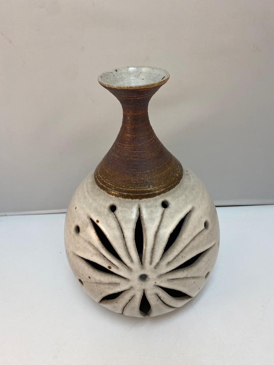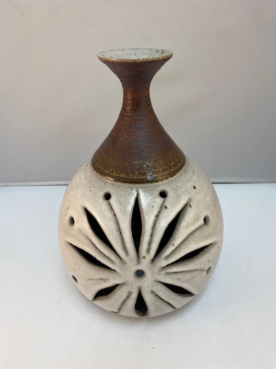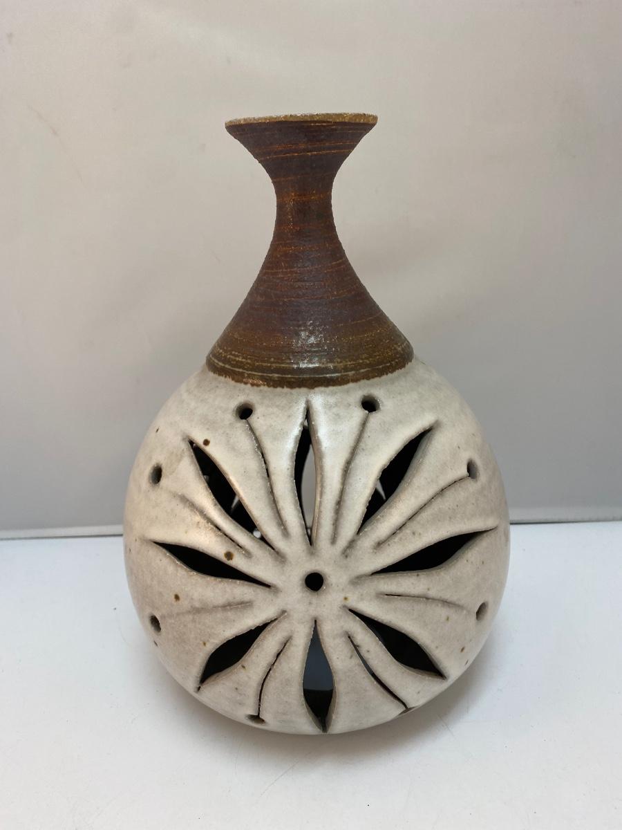 Vintage Retro Star Flower Cut Out Pattern Thrown Pottery Vase Signed. From artist Victoria Littlejohn