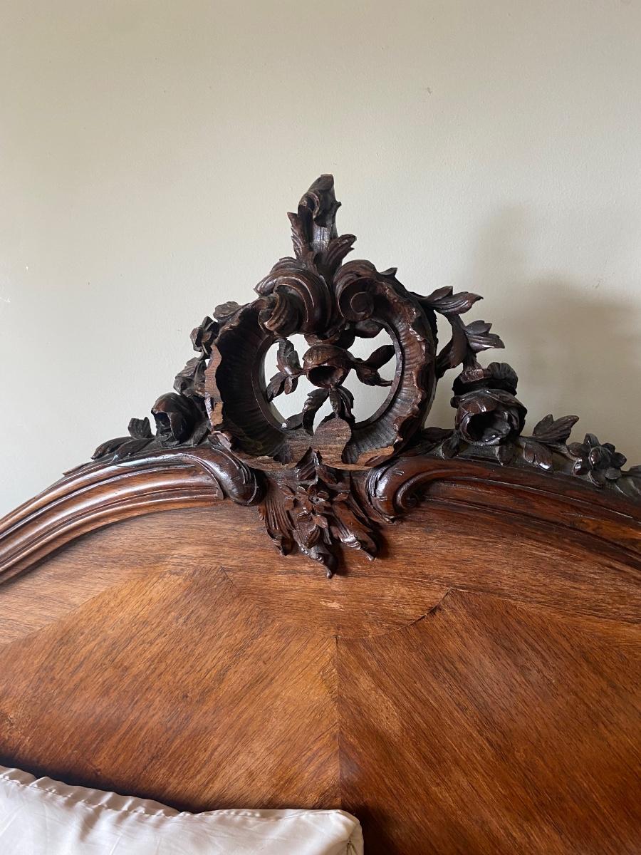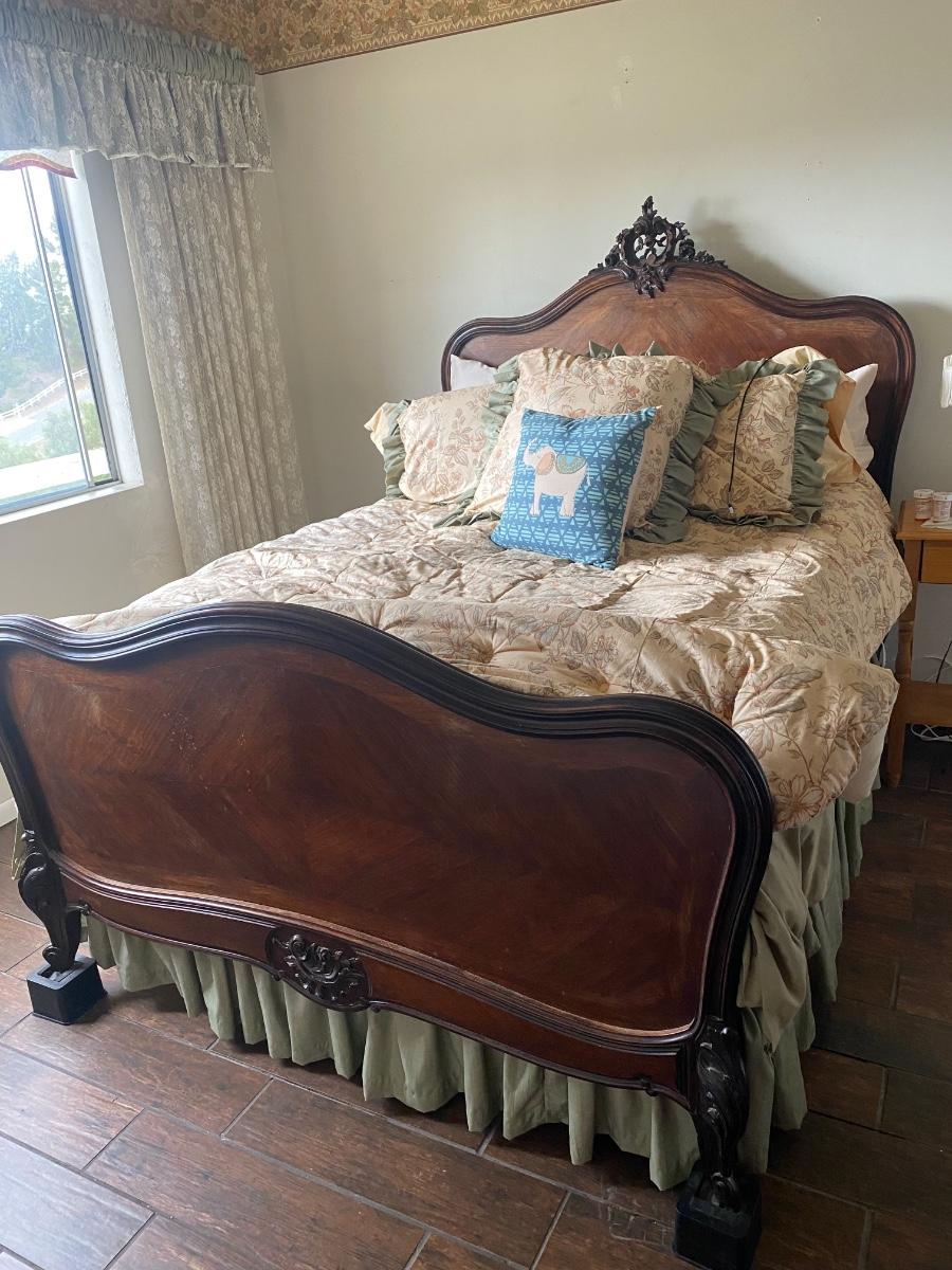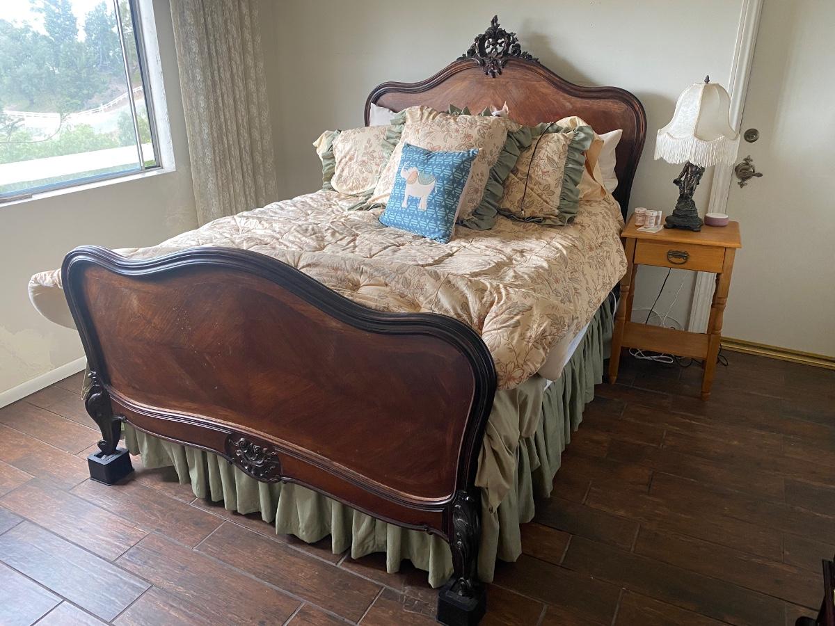 Antique Vintage French Rococo Carved Wood Full Size Bedframe with Mattress and Bedding. Beautiful wood bedframe. Mattress and bedding included.