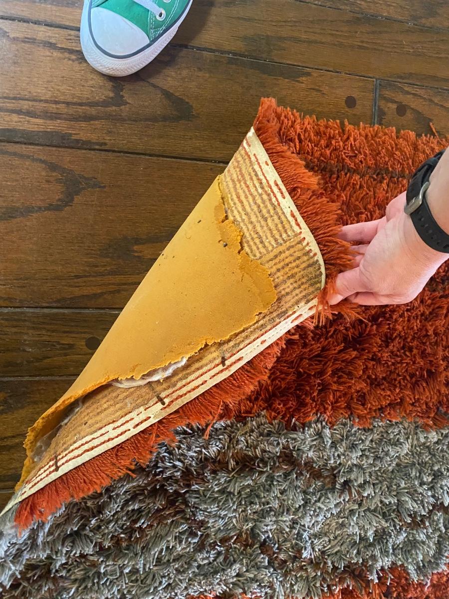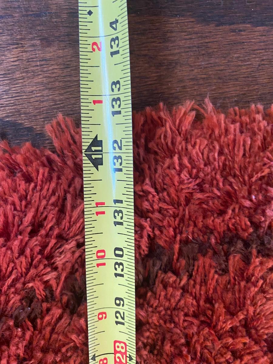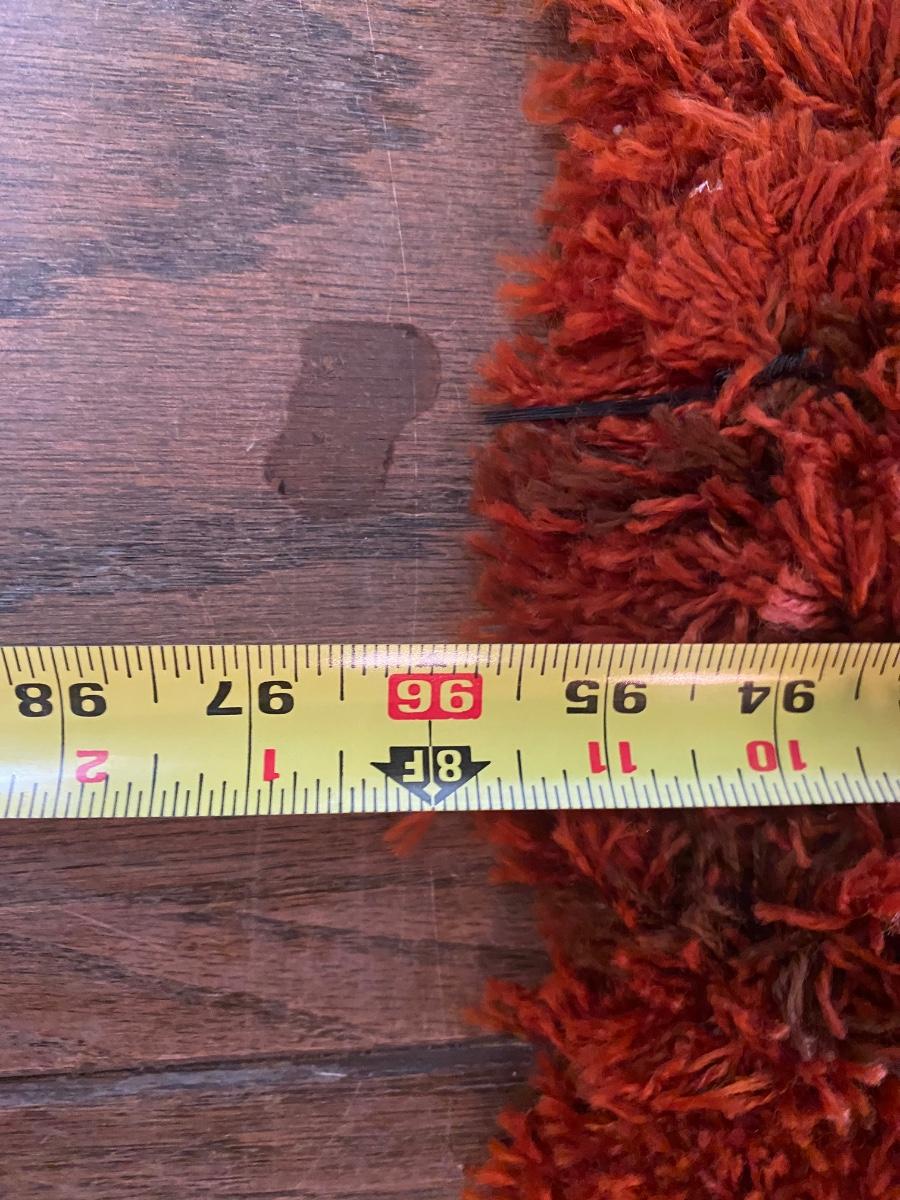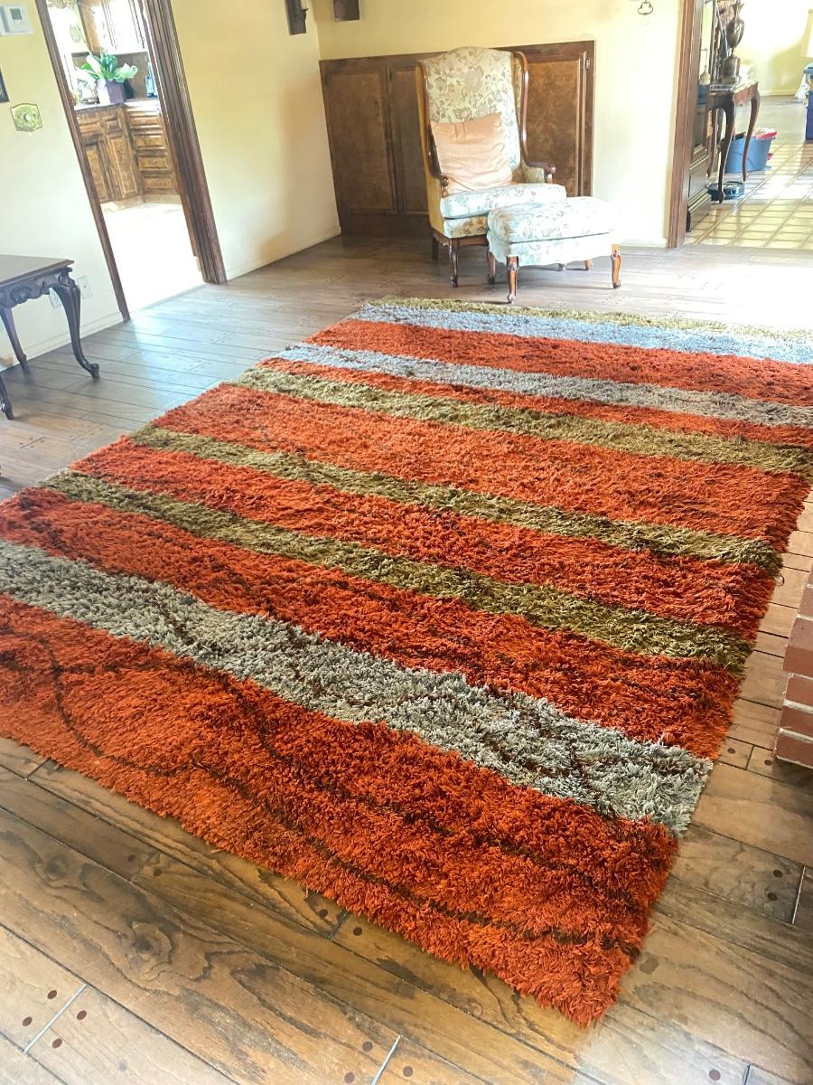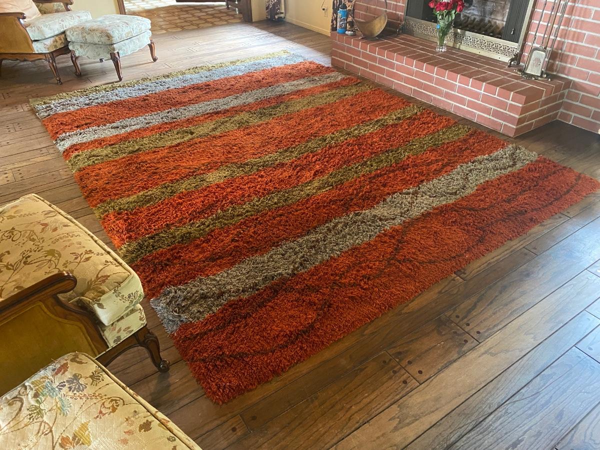 Large Orange and Grey Striped Long Shag Area Rug. In good condition. About 8'x11' size. has padding added to the underside. May need to be cleaned but no spots or stains noticed.