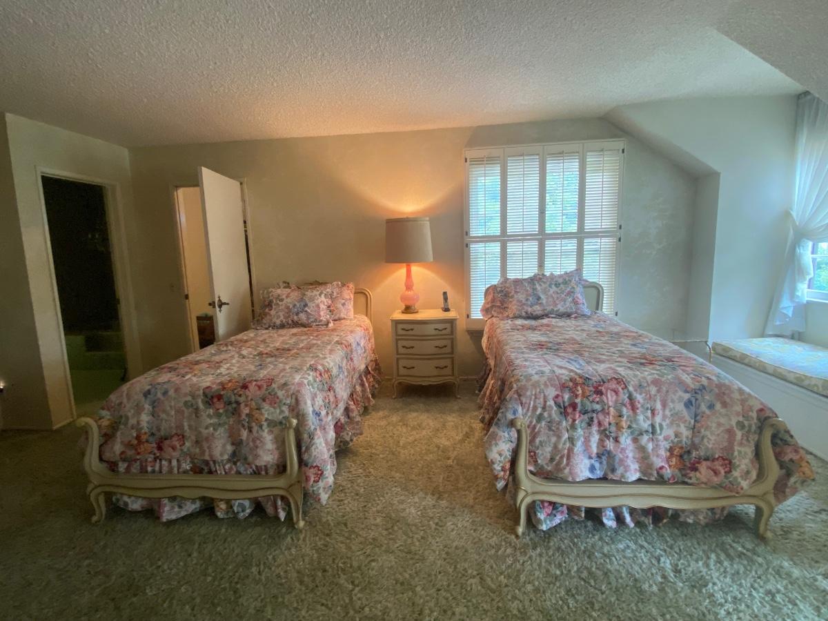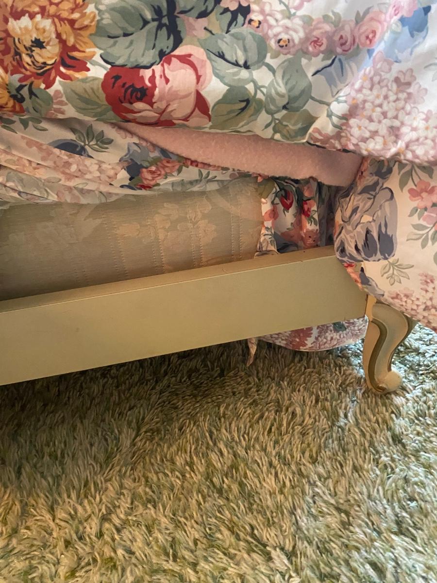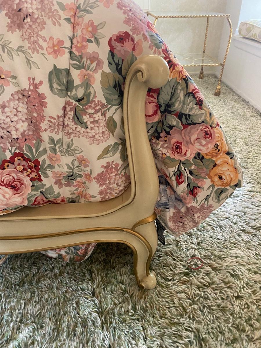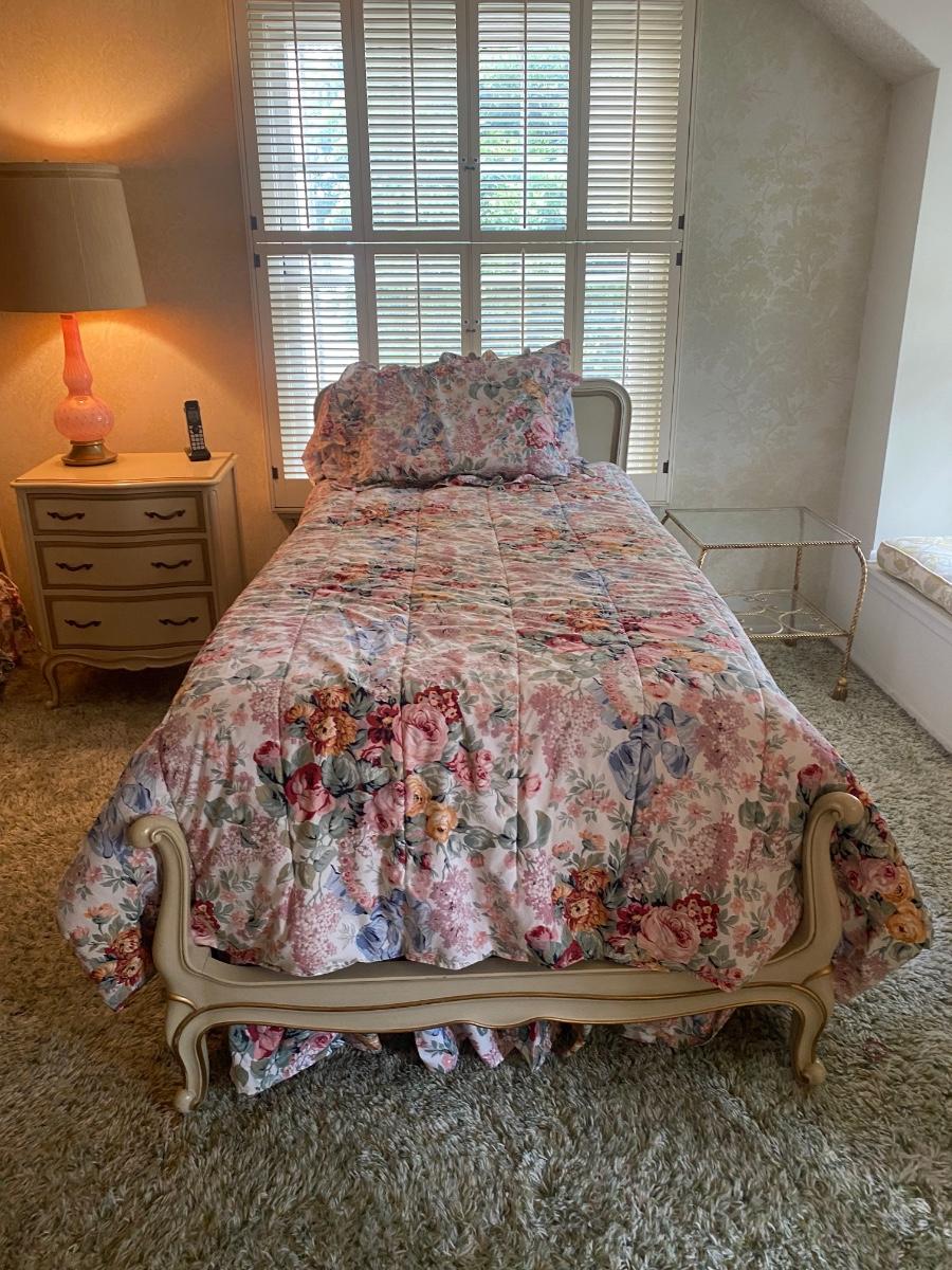 Pair of Vintage Drexel White & Gold French Provincial Twin Beds with Mattresses and Bedding. Bedframes in good condition. Floral bedding included. **Nightstand and lamp are separate listings in auction**