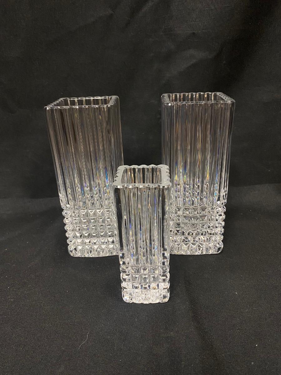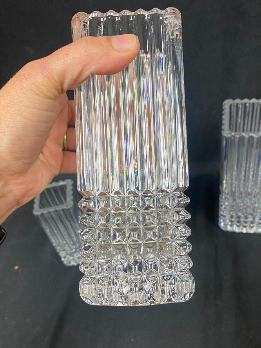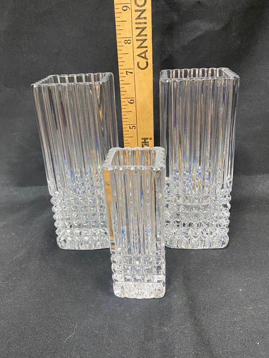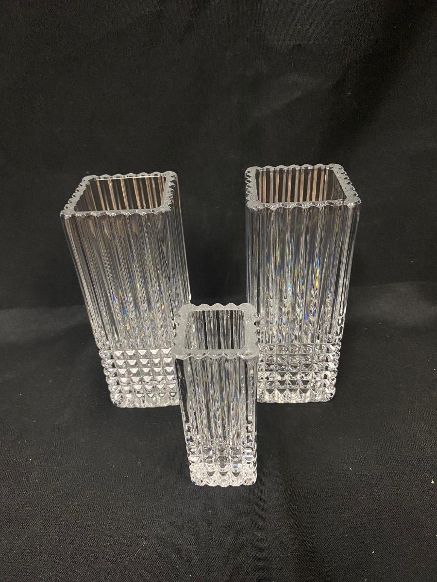 Retro Modern Crystal Glass Square Shaped Flower Vases with Ribbed Pointed Hobnail Cut. Two tall one short. In good condition, heavy glass.