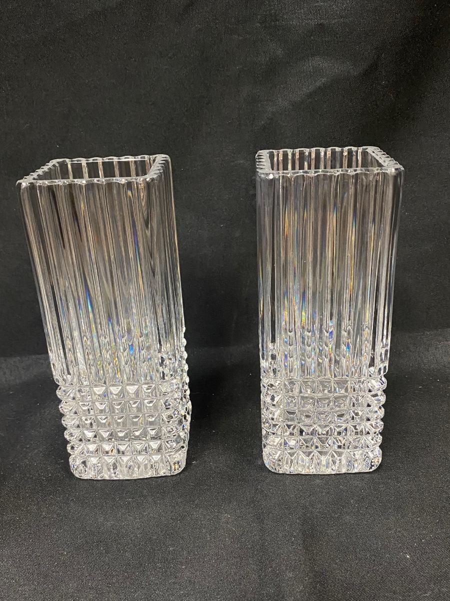 Retro Modern Crystal Glass Square Shaped Flower Vases with Ribbed Pointed Hobnail Cut