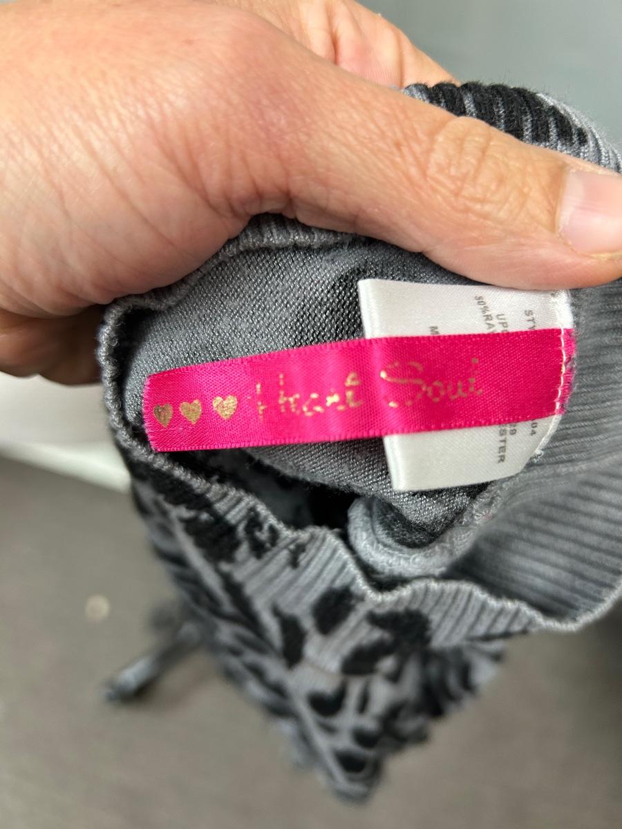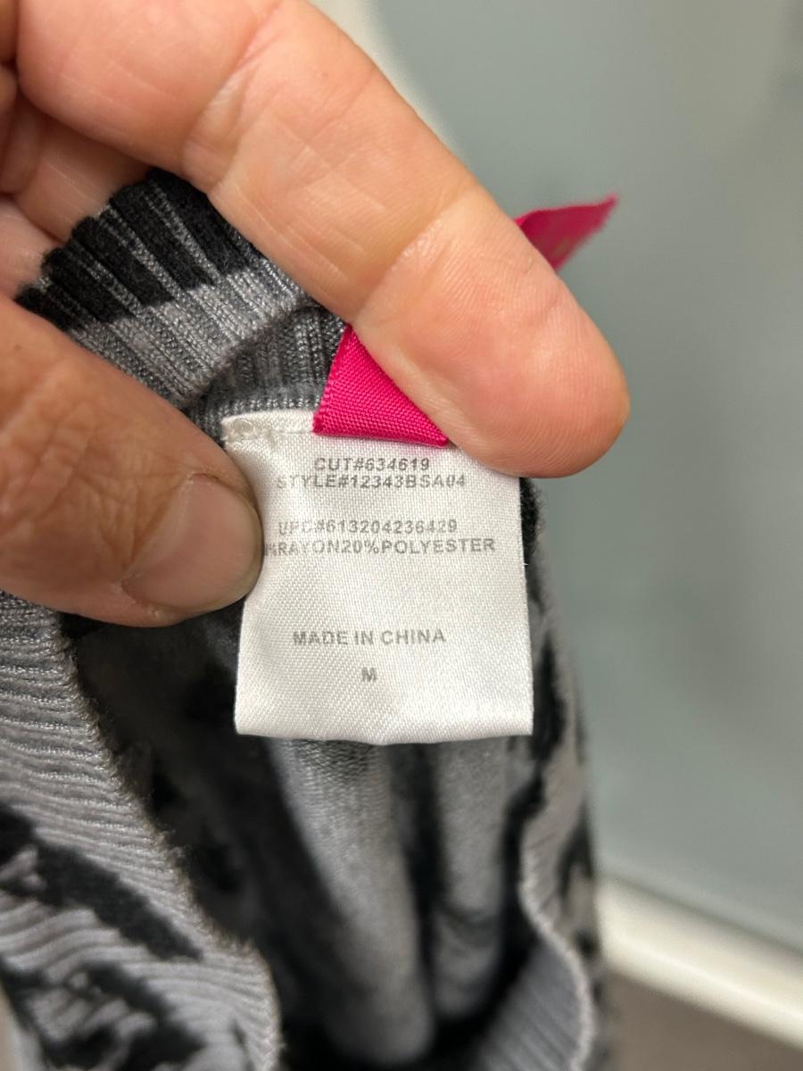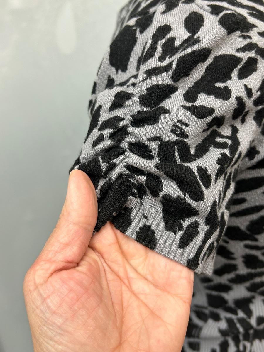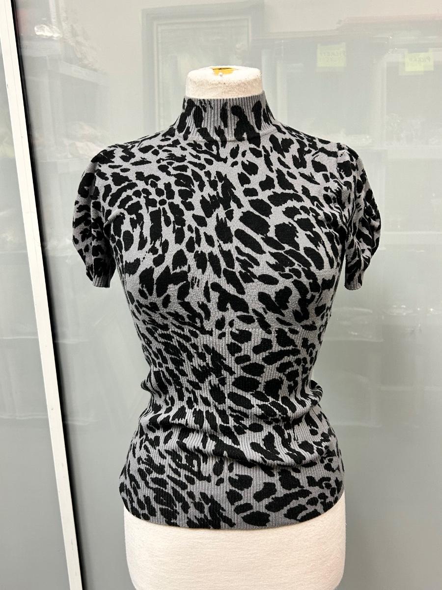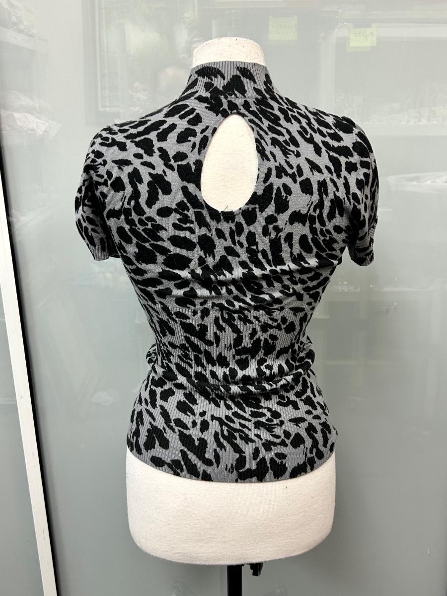 Short Sleeve High Neck Keyhole Back Grey & Black Leopard Print Sweater Blouse. Size Medium. In good condition. Could probably wear with keyhole in front.
