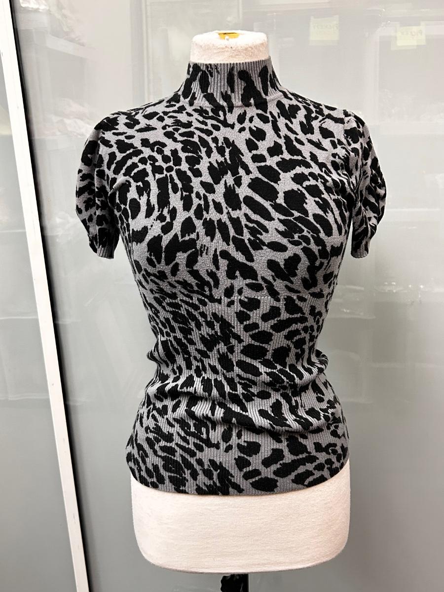 Short Sleeve High Neck Keyhole Back Grey & Black Leopard Print Sweater Blouse
