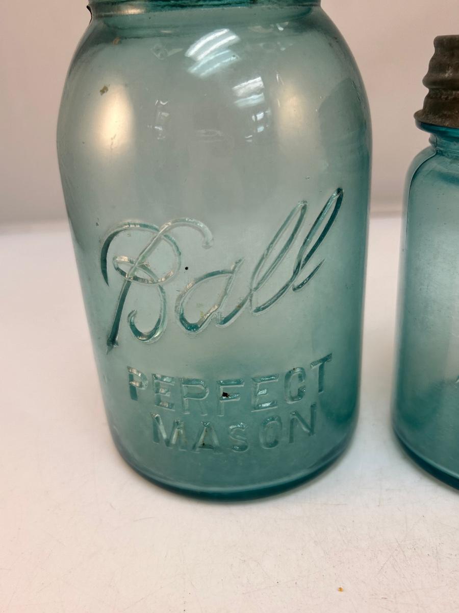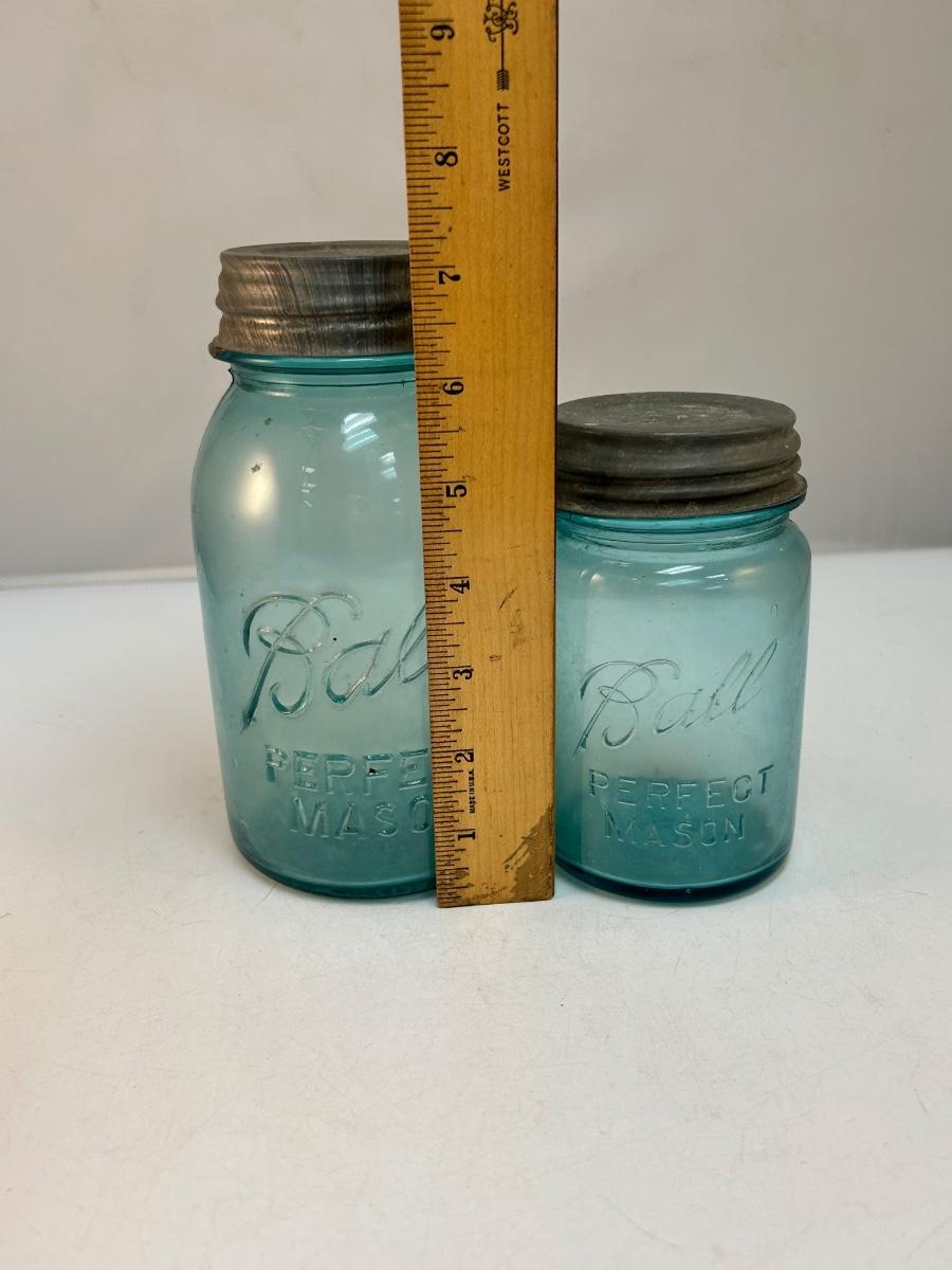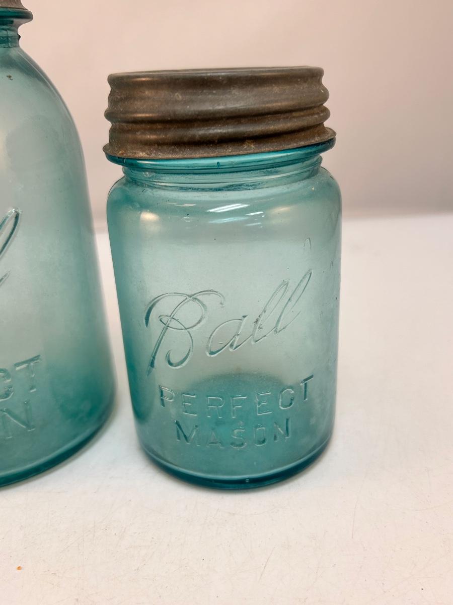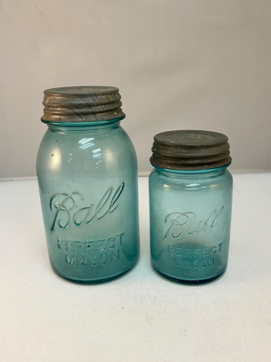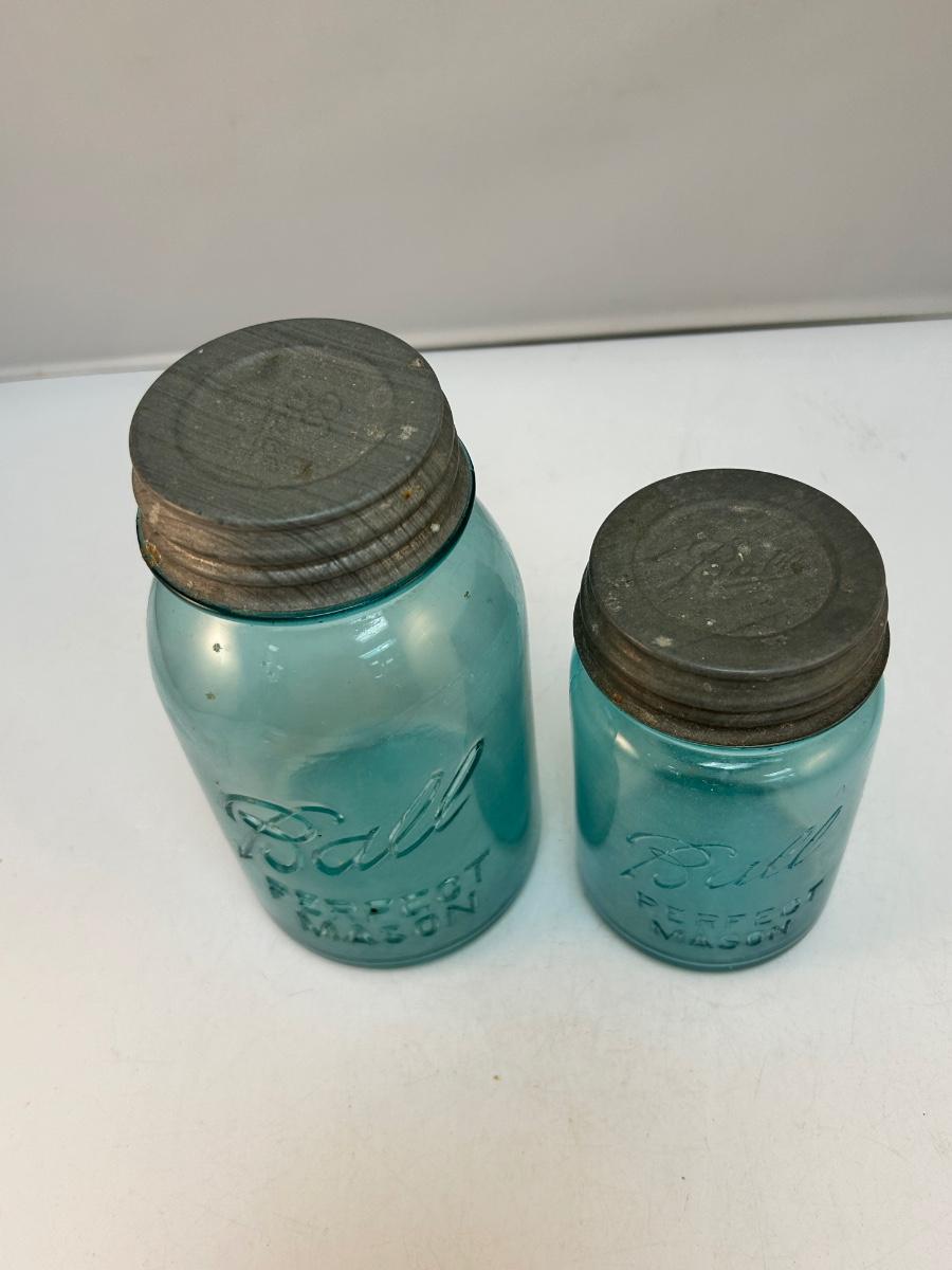 Pair of Turquoise Blue Vintage Ball Mason Canning Glass Jars with Lids. Different sizes. In good used condition.