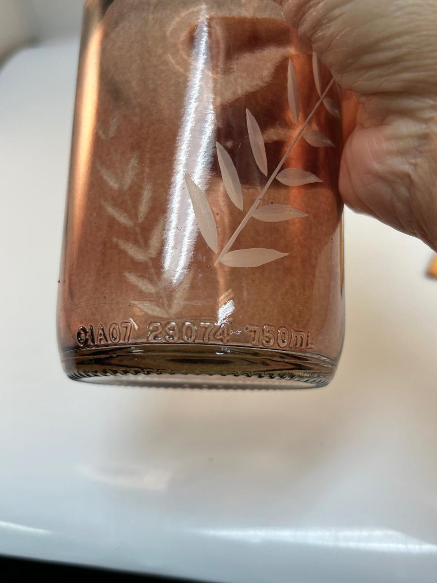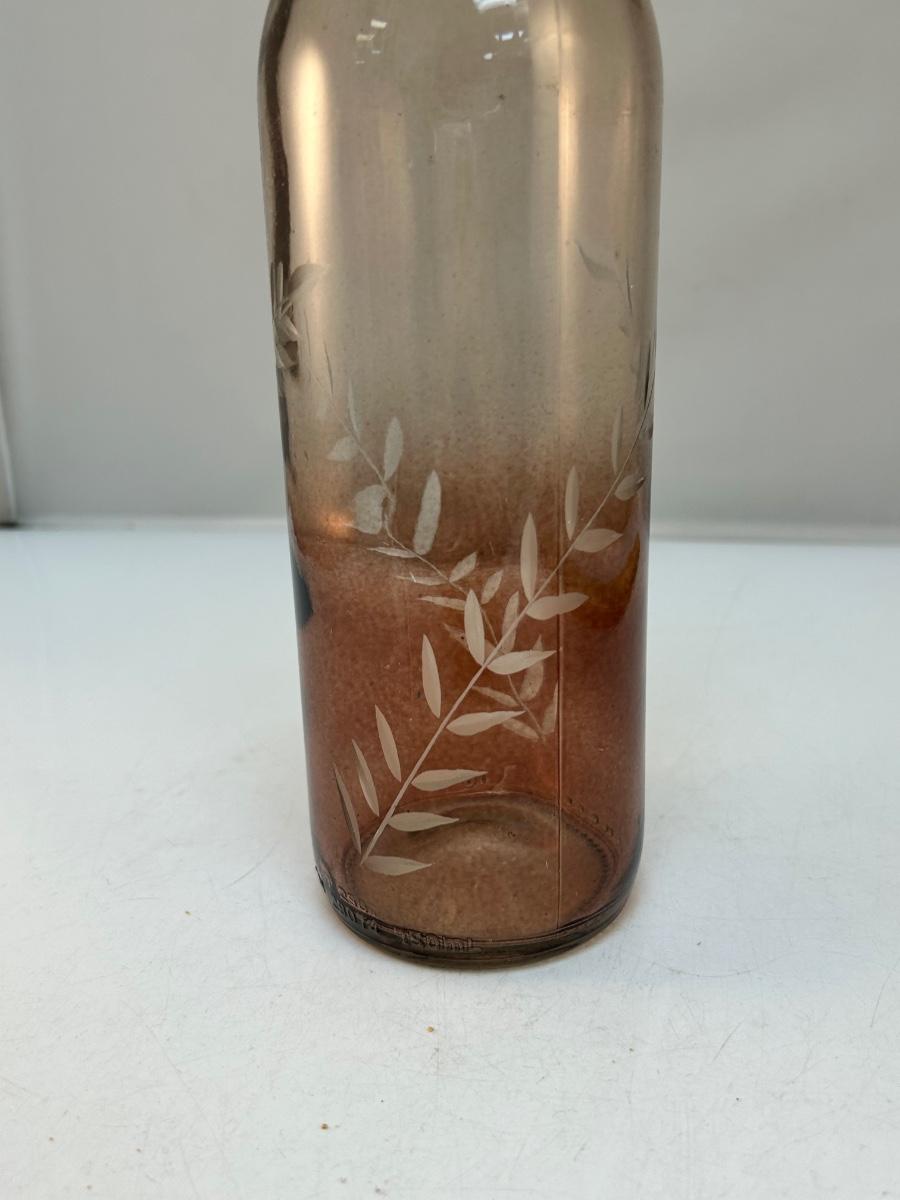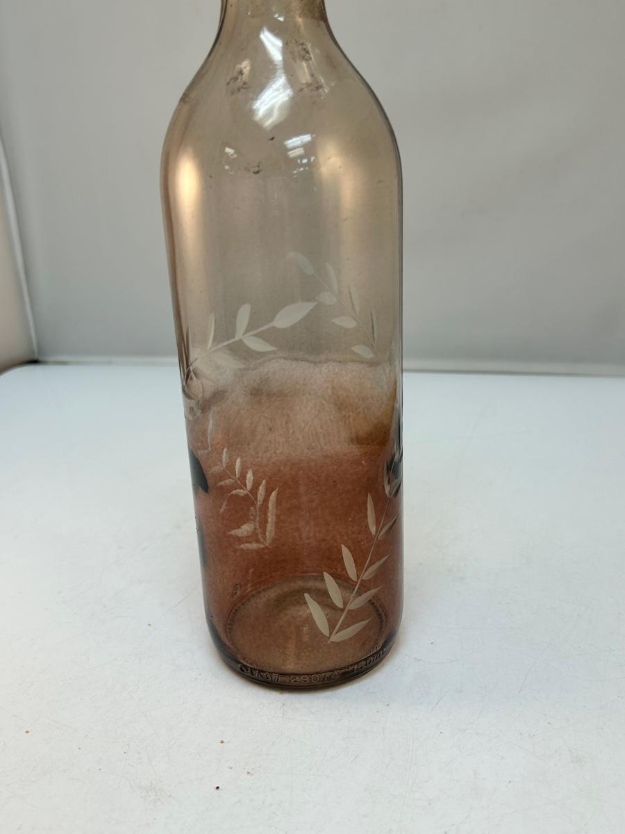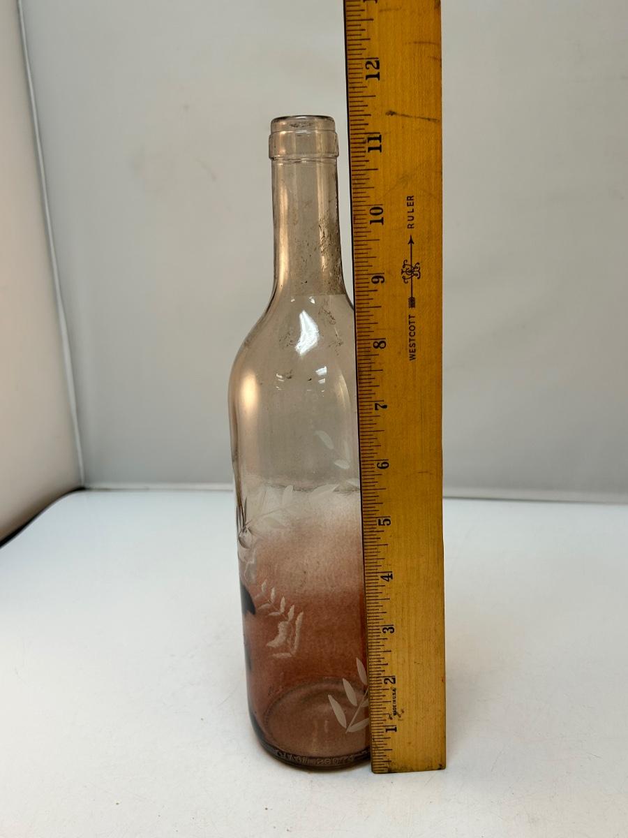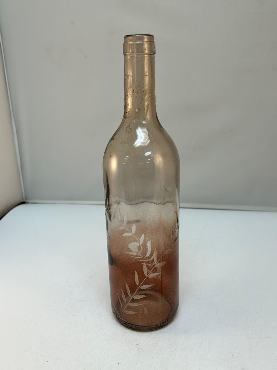 Amythest Purple to Clear Vine Etched Wine Bottle. Great for display or single rose vase. Unsure if it came this way or was a project piece.