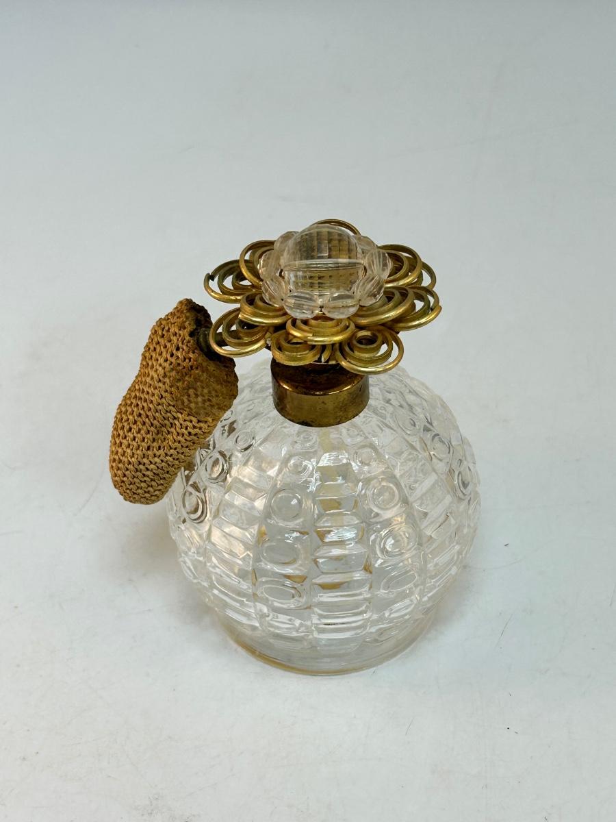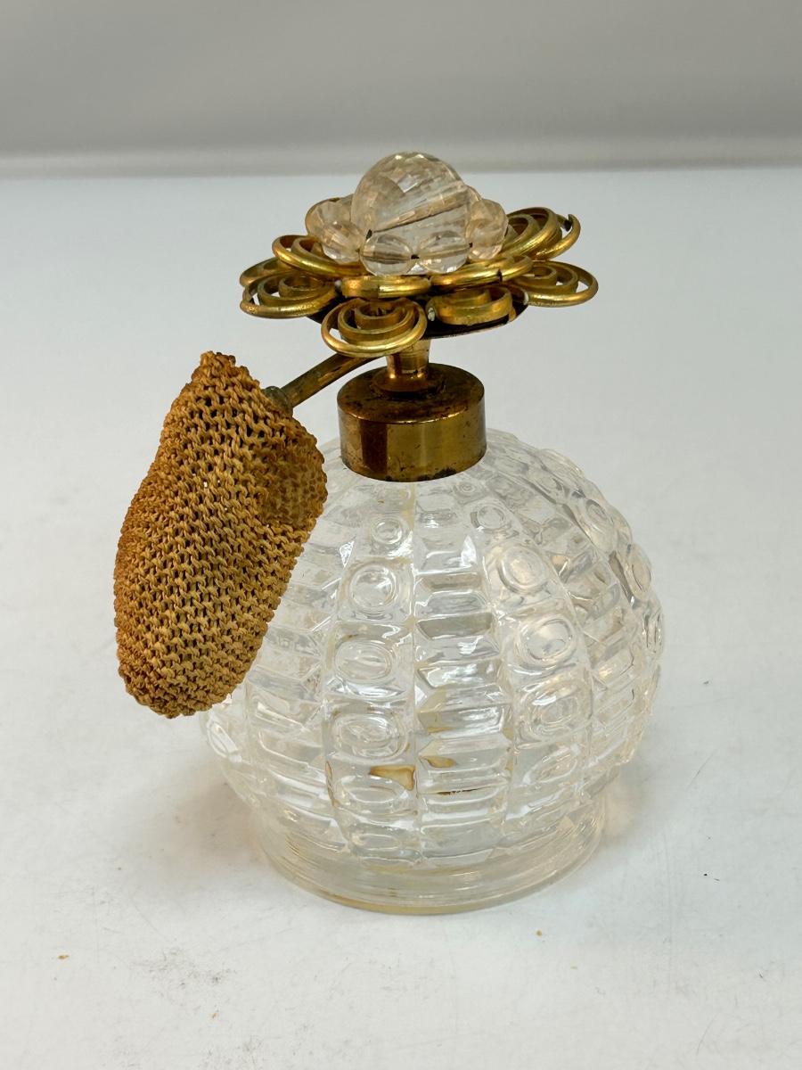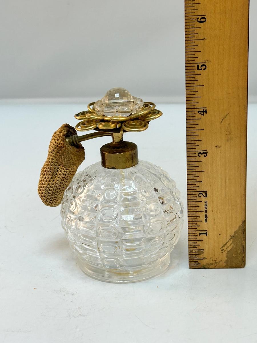 Vintage Square Pattern Pressed Glass Perfume Bottle Atomizer with Gold Tone Metal Flower Top. In good condition, great for display. Would not spray when pressed as the inside pumper piece has dried out and is not good.