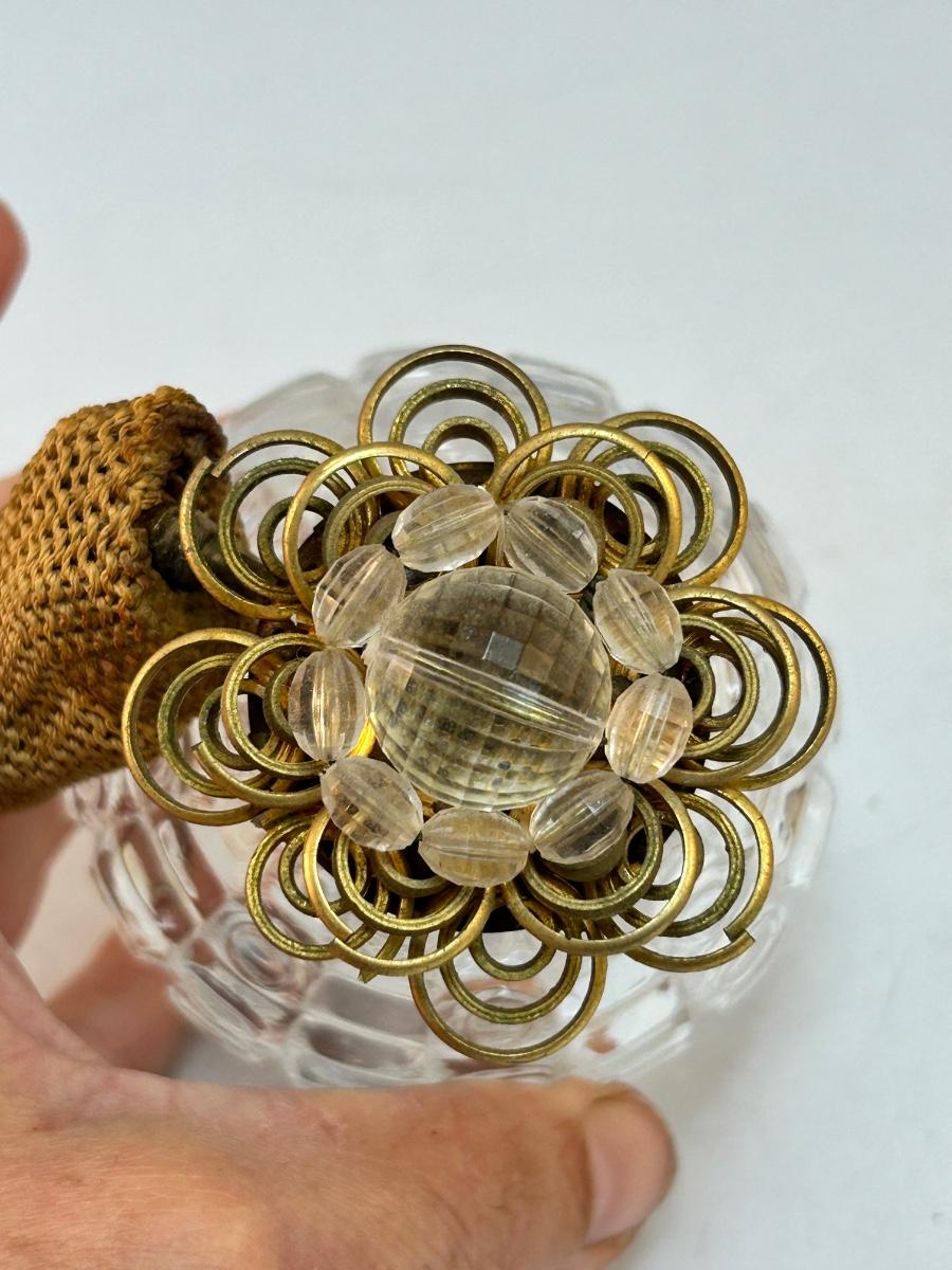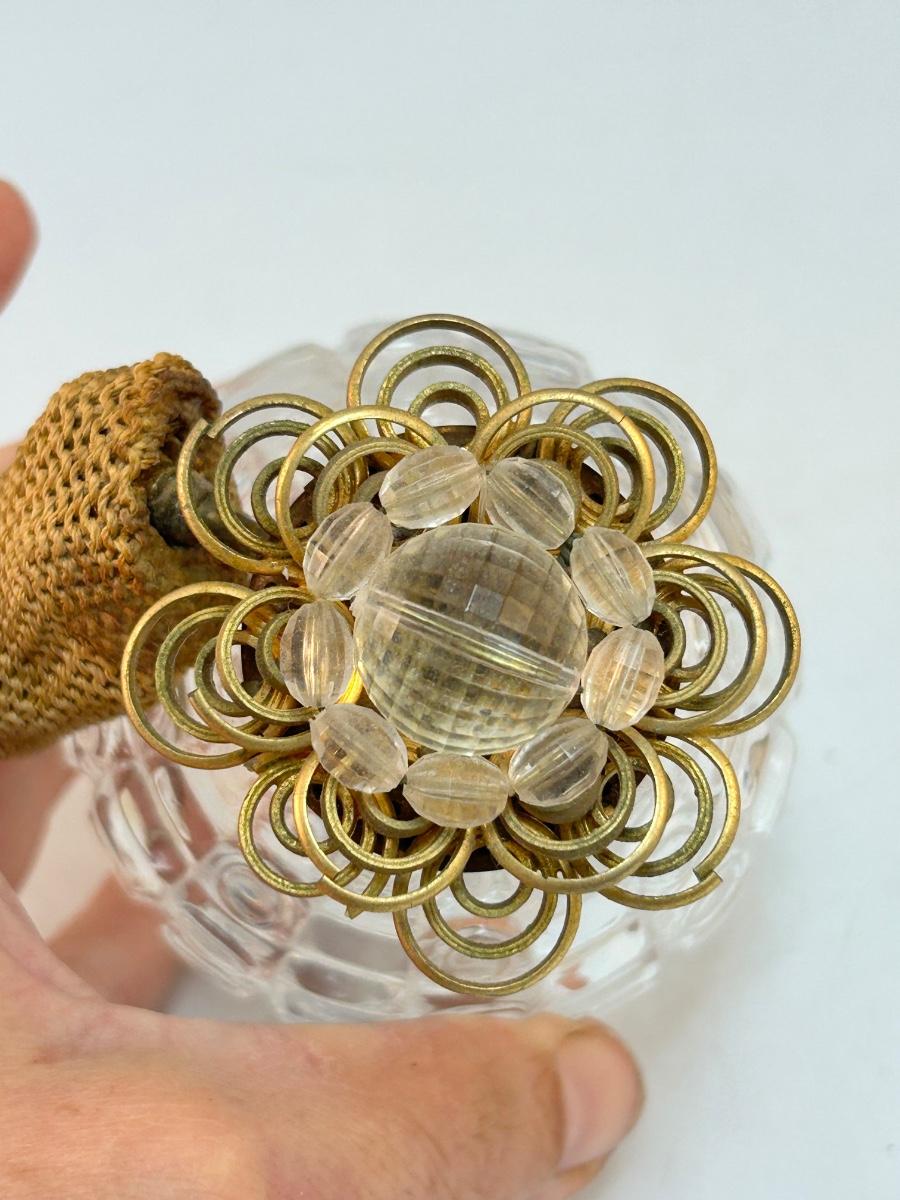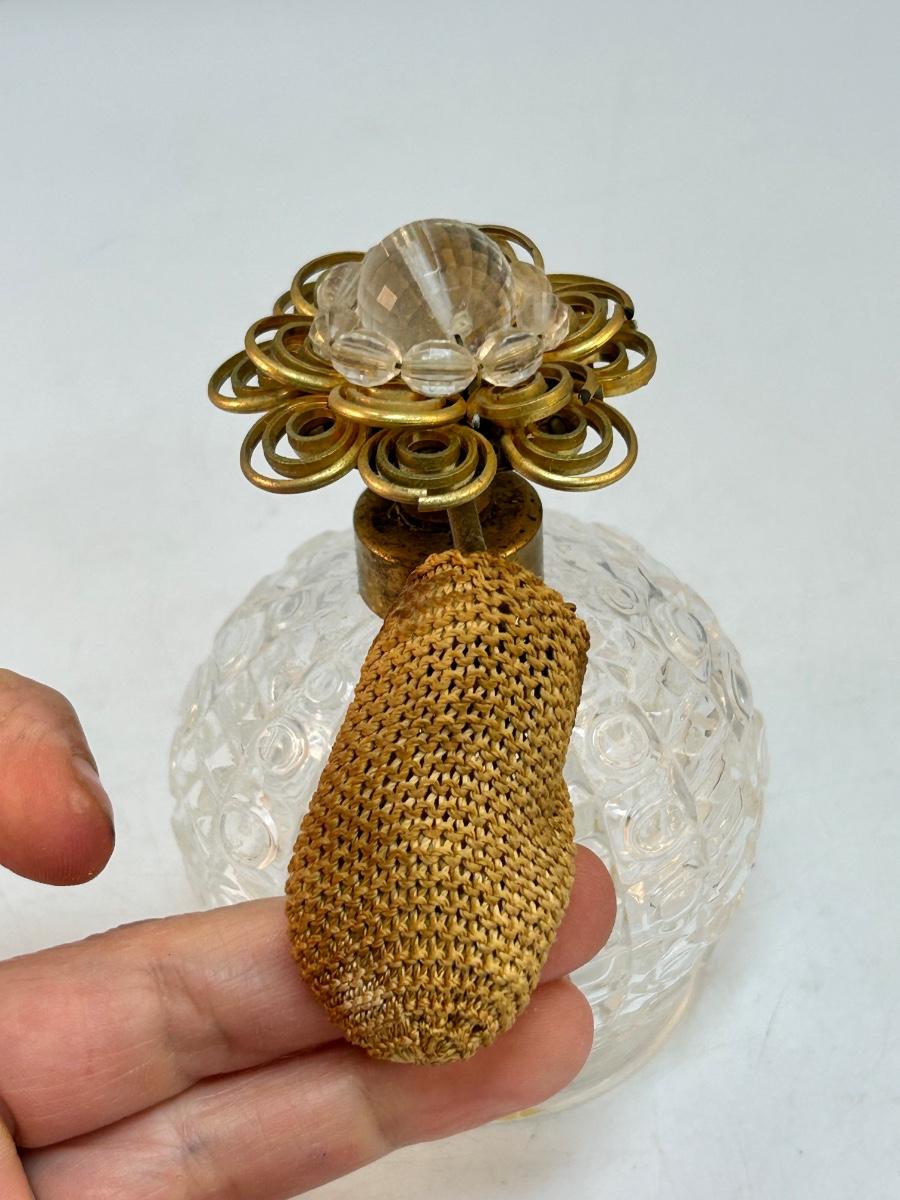 Vintage Square Pattern Pressed Glass Perfume Bottle Atomizer with Gold Tone Metal Flower Top. In good condition, great for display. Would not spray when pressed as the inside pumper piece has dried out and is not good.