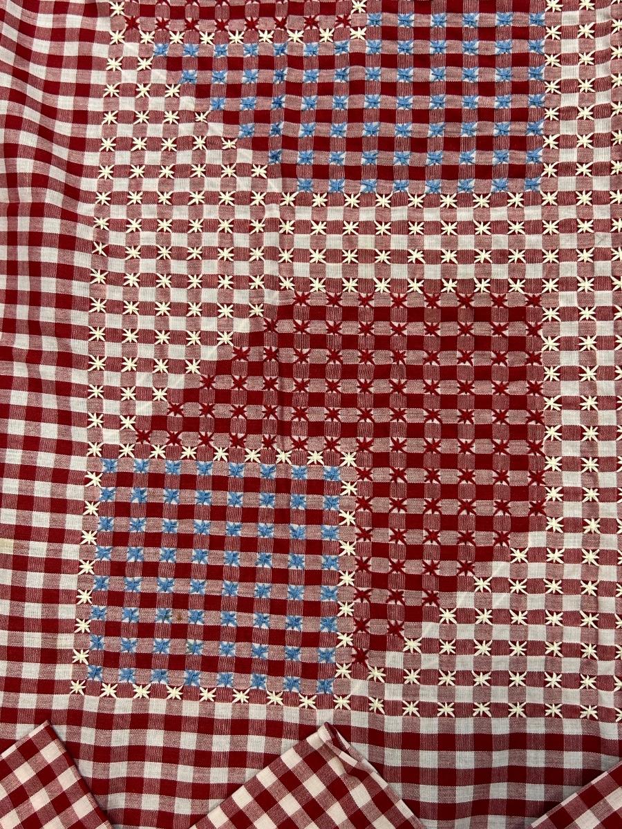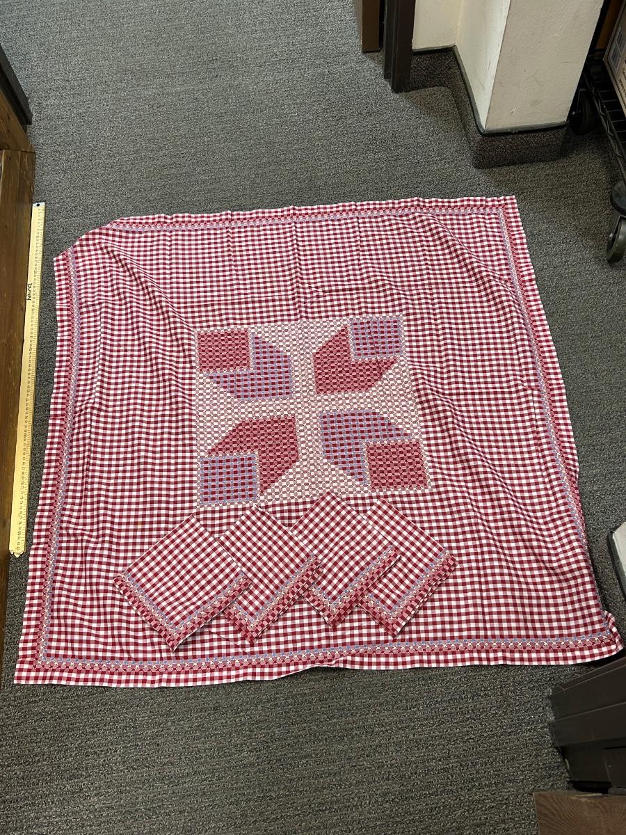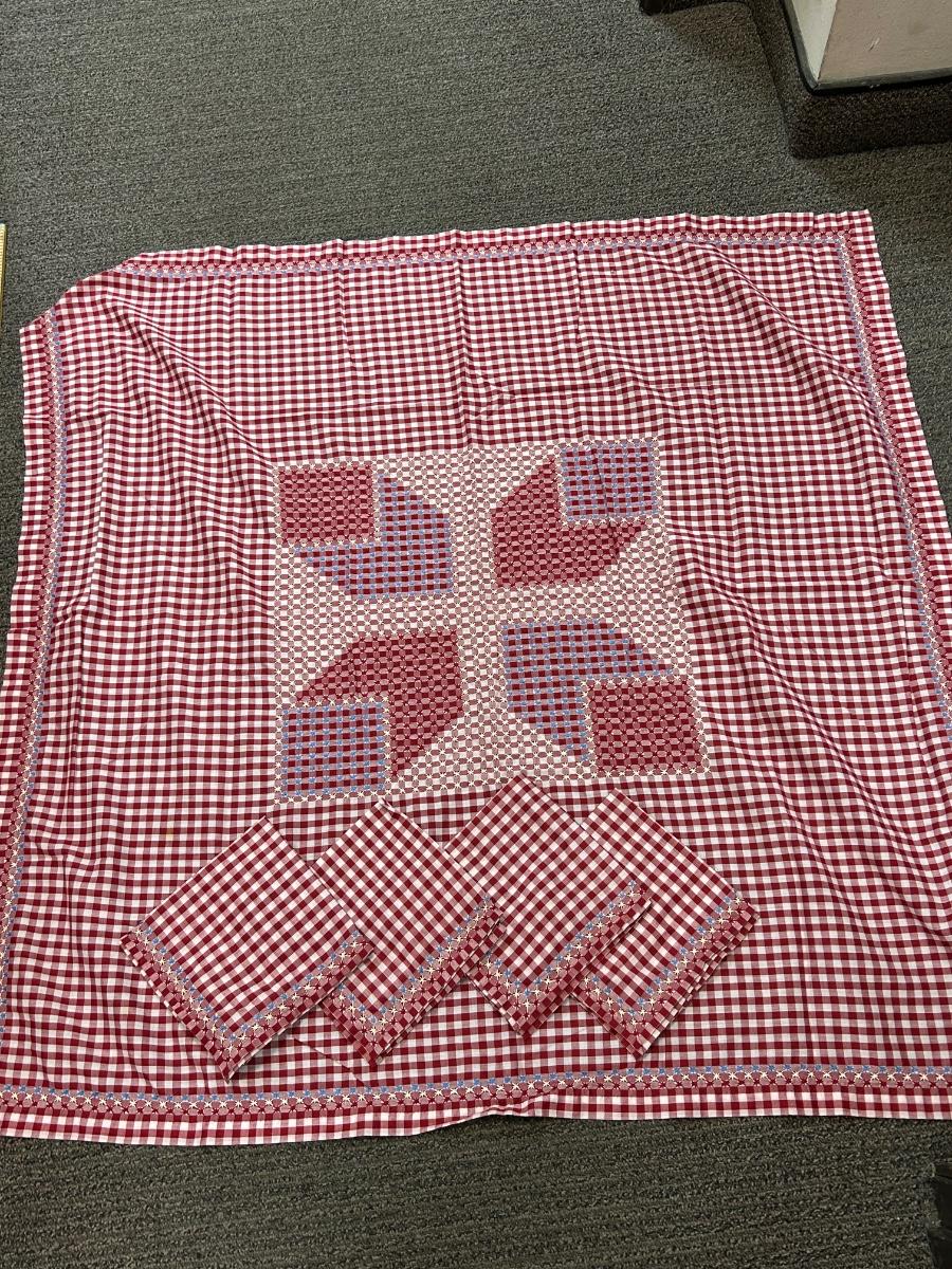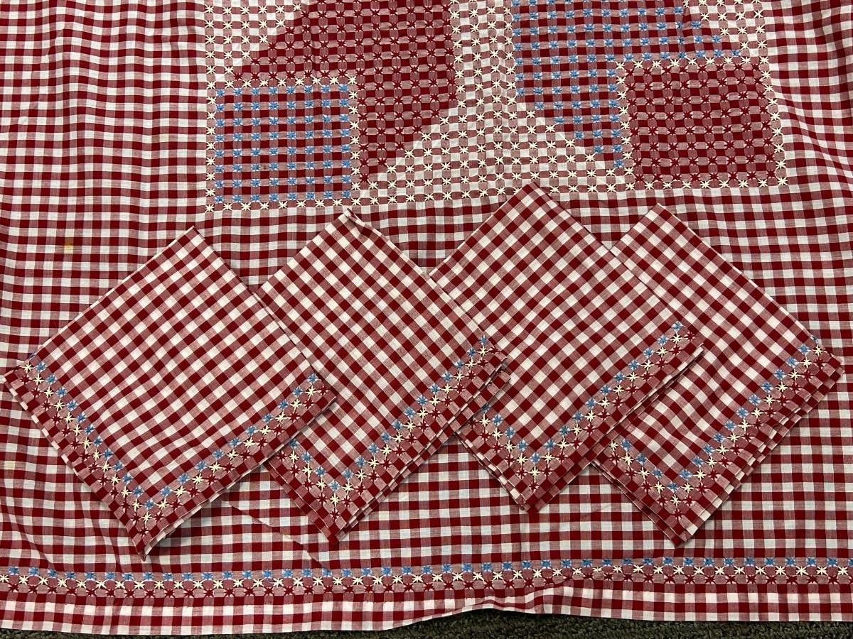 Red and White Gingham Checker Tablecloth with Napkins Set Cross Stitched Pattern. In good condition. Center design and napkin edge is done with embroidery floss.