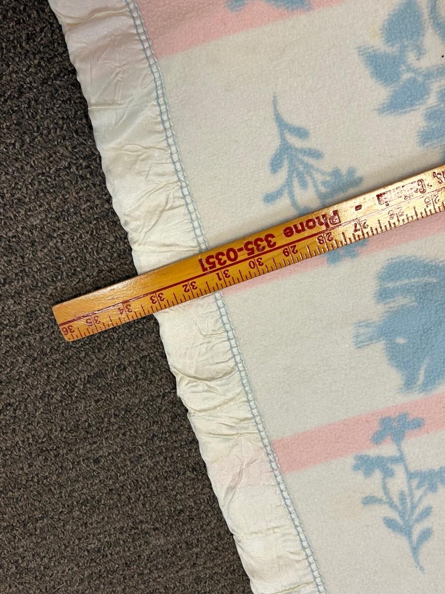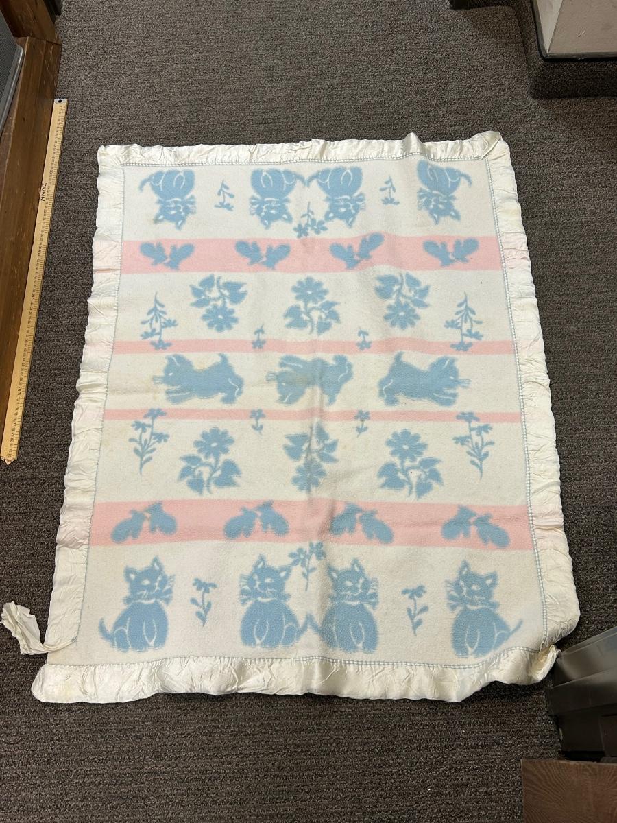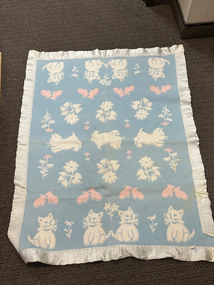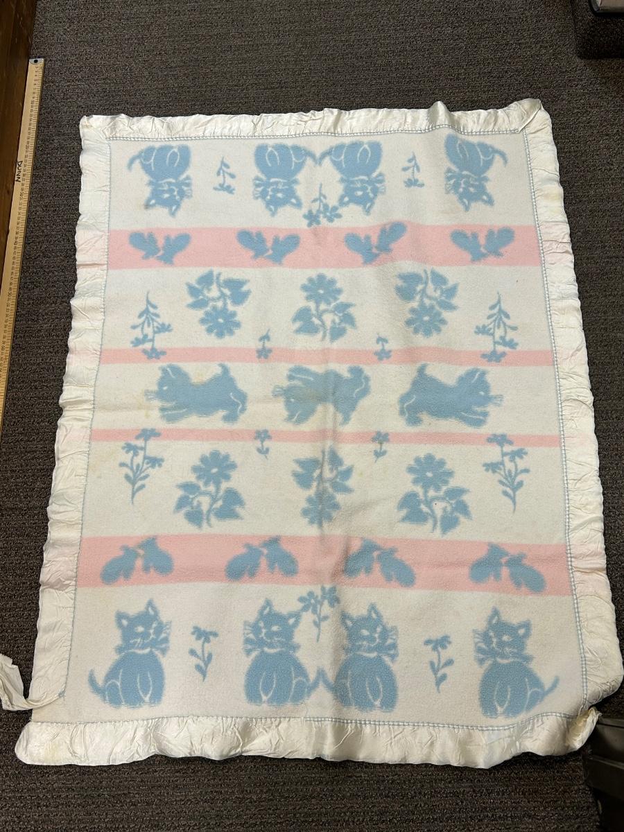 Vintage Blue Pink and White Reversible Baby Blanket Kittens & Flowers. In good vintage condition. Some very light discoloration. Around 3' size.