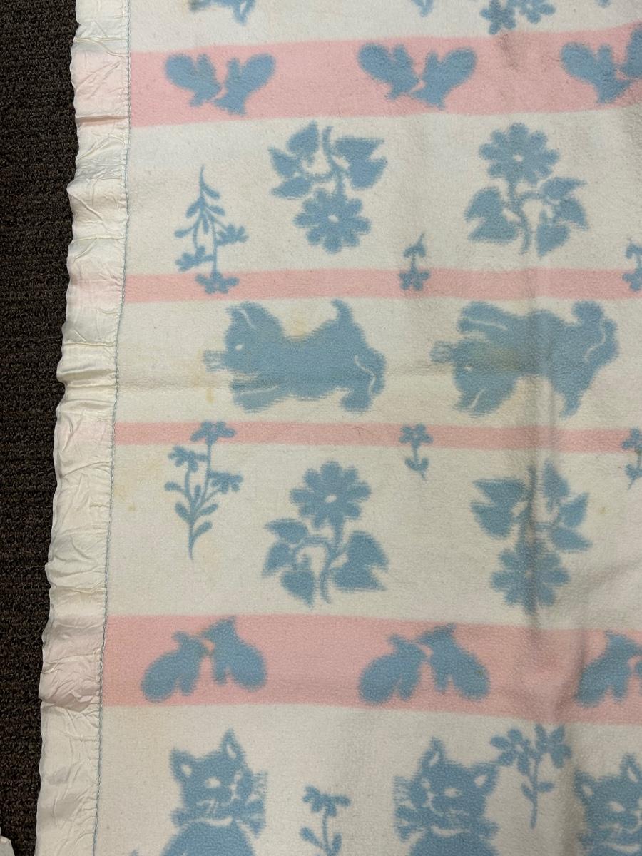 Vintage Blue Pink and White Reversible Baby Blanket Kittens & Flowers