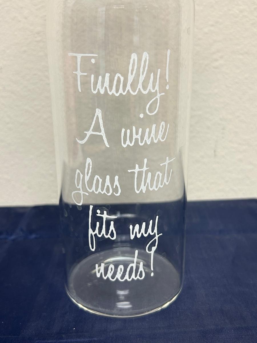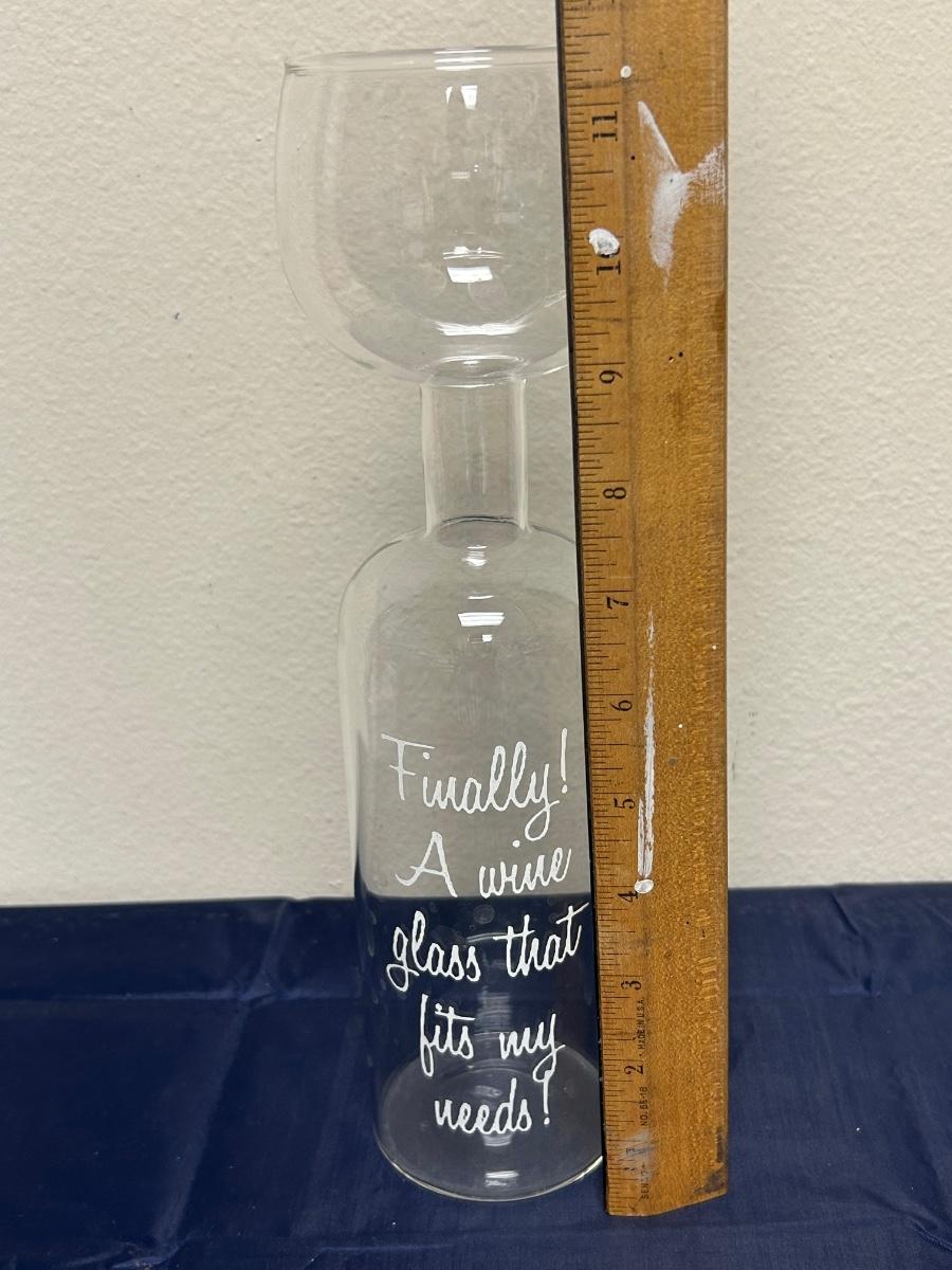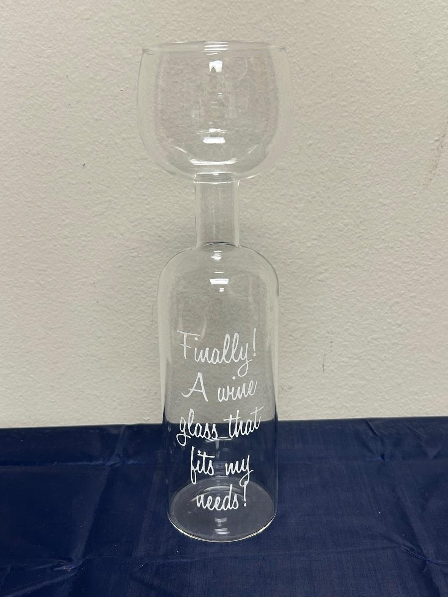 Novelty Wine Glass Bottle. Wine glass and bottle in one, has the quote "Finally! A wine glass that fits my needs!" In good condition.