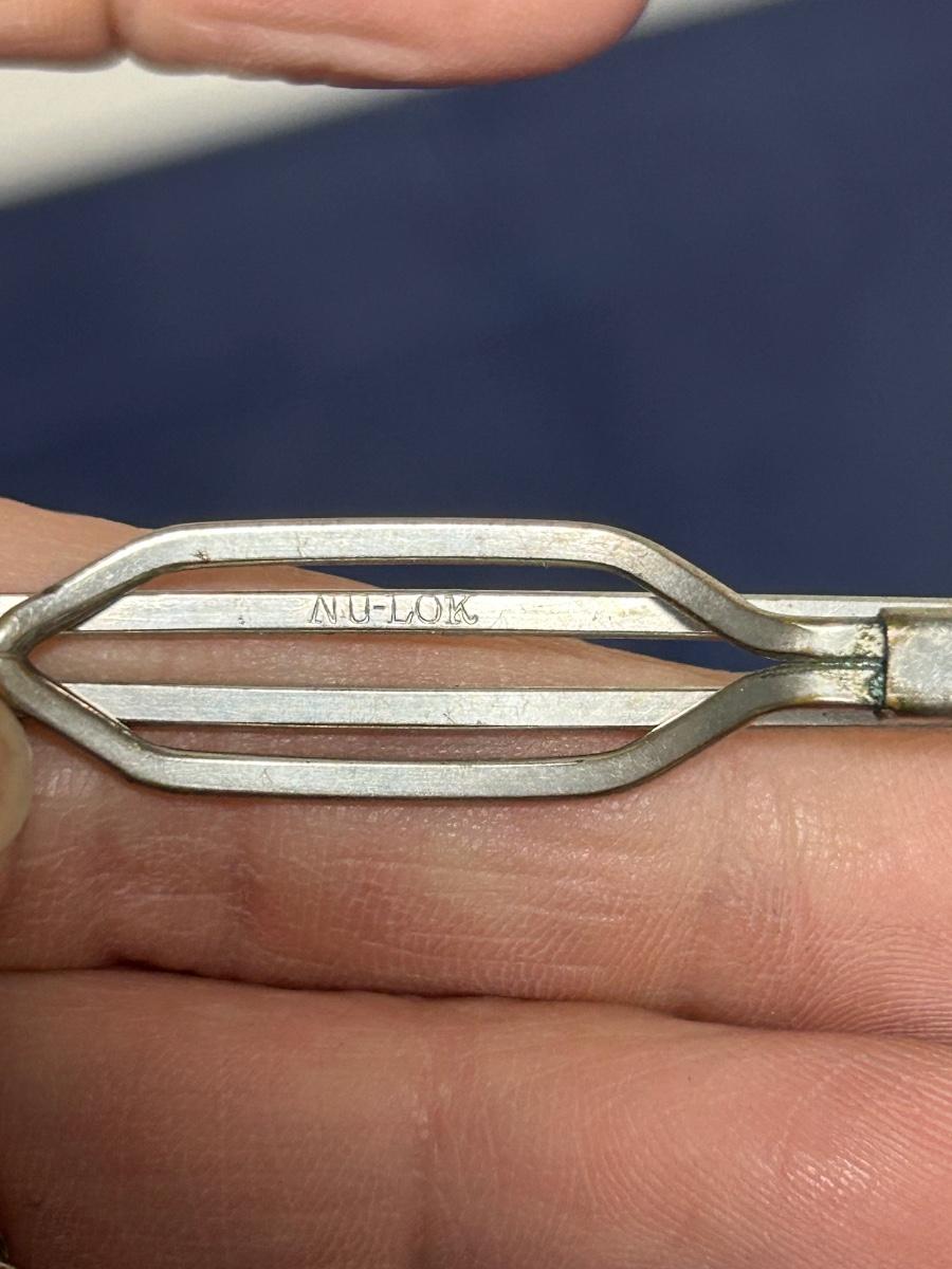 Vintage Retro Silver Tone Tie Clip with Lucite Center. In good condition. Lucite is opaque and black, not sure if there is missing design or not.