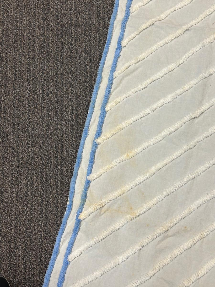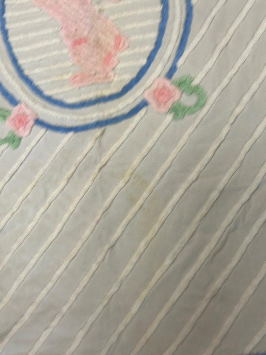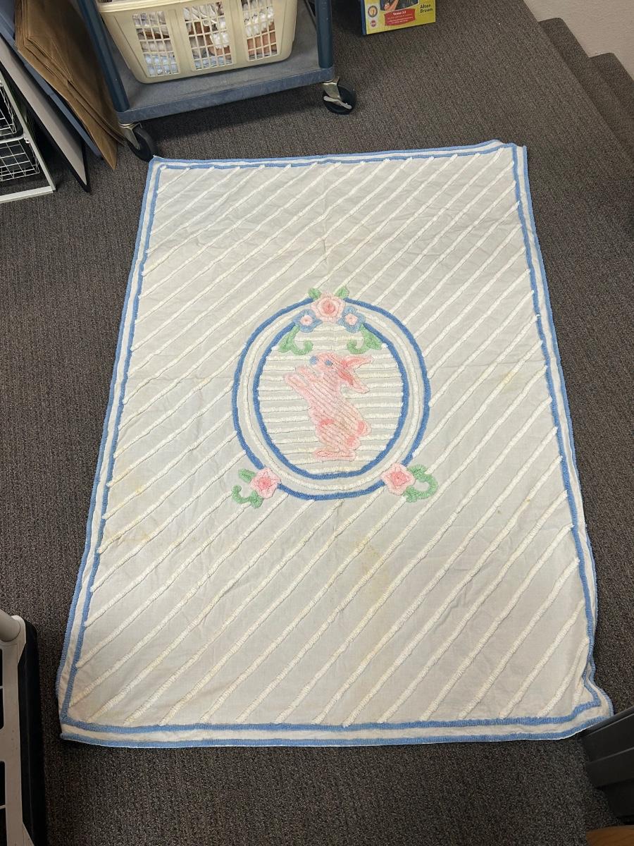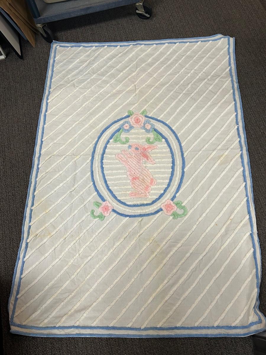 Vintage Fabric Applique Pink Bunny Rabbit Blue Edge Baby Blanket