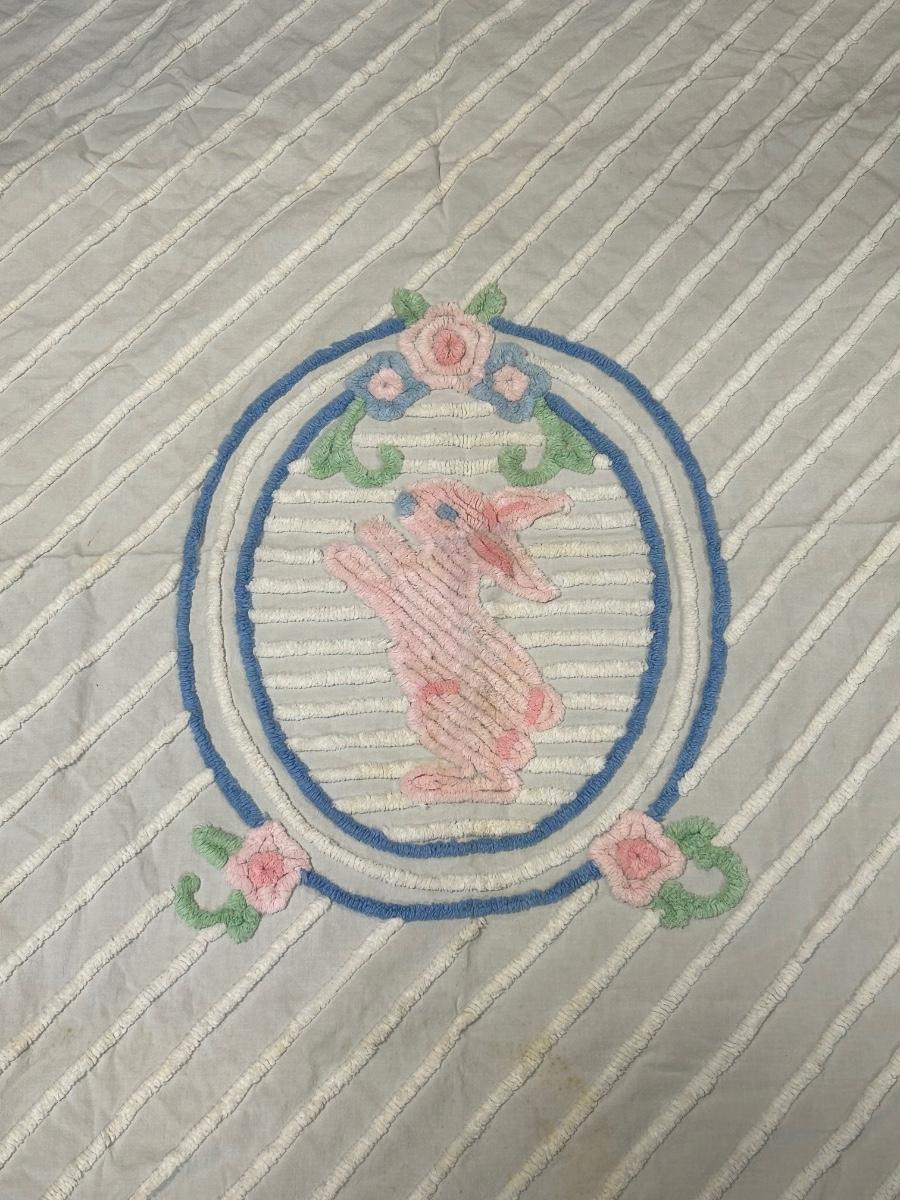 Vintage Fabric Applique Pink Bunny Rabbit Blue Edge Baby Blanket. In good vintage condition. No holes, very light discoloration. About 5' length.