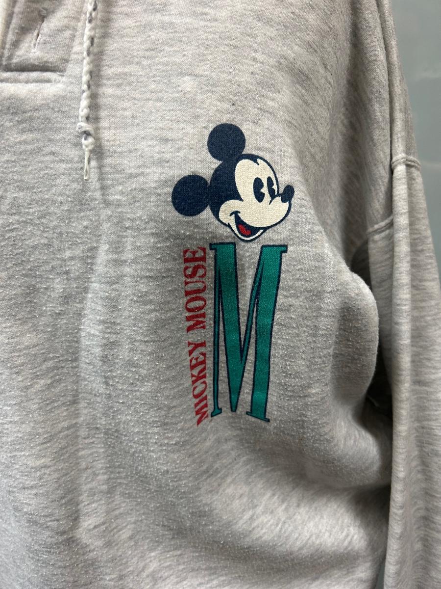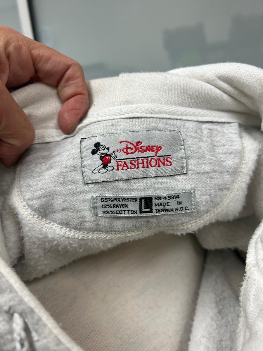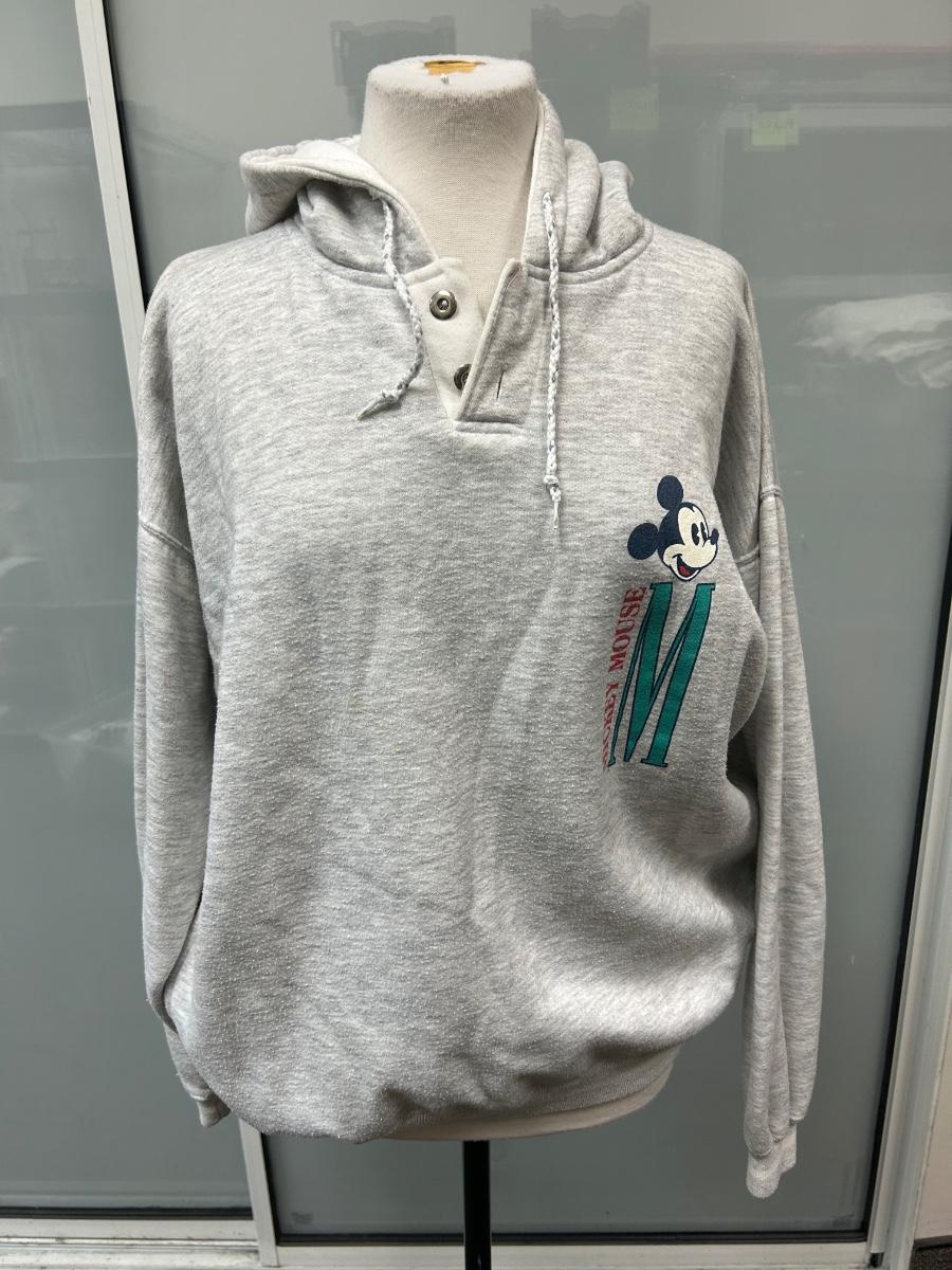 Retro Disney Fashions Grey Mickey Mouse Hoodie Sweatshirt Sweater with Hood Size Large. In good worn condition. No stains but looks like it might have discolor at shoulders from hanging in closet.