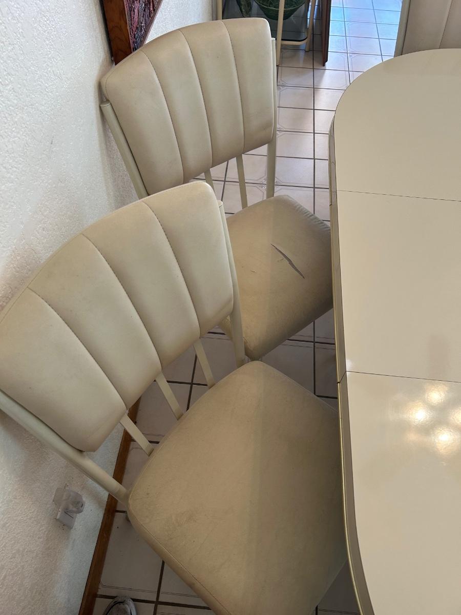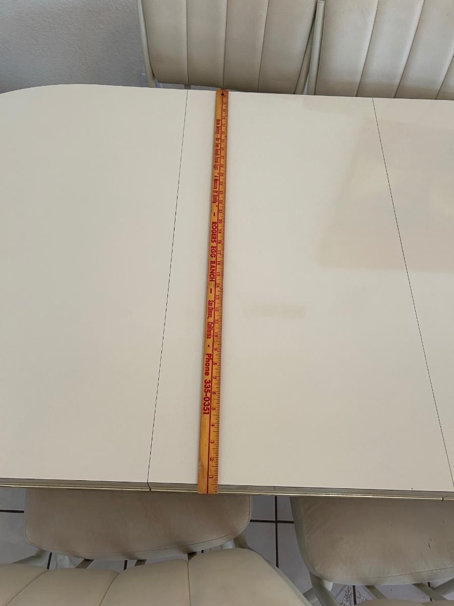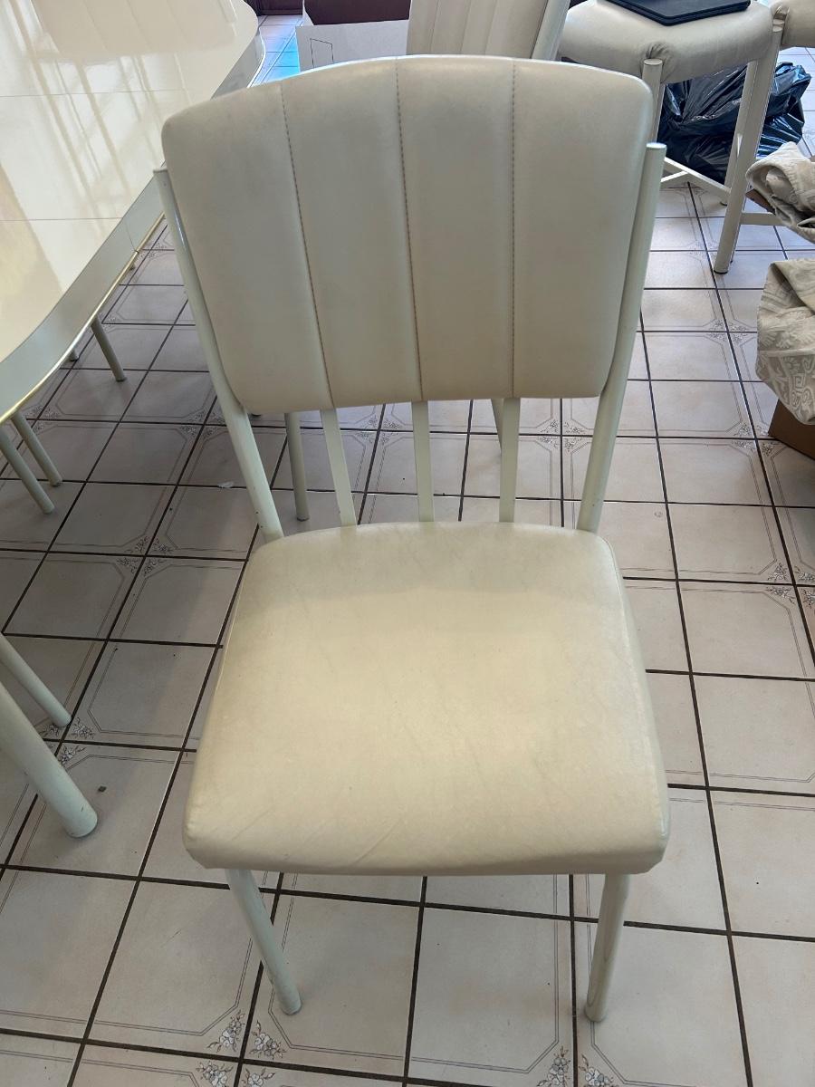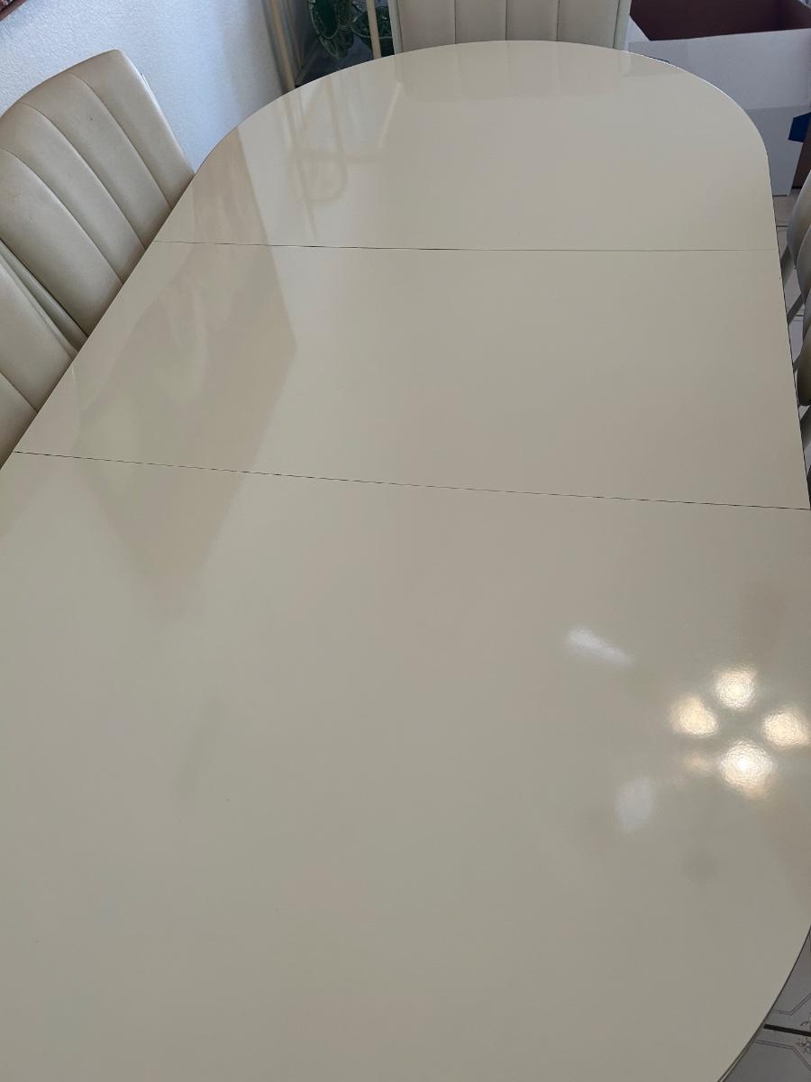 Retro 1980s Ivory White Laminate and Metal Oval Dining Table with 6 Chairs. Chairs have light wear but the table is in great condition, glossy surface.
