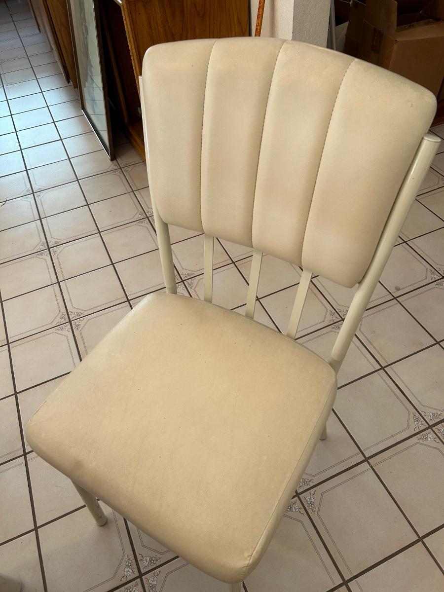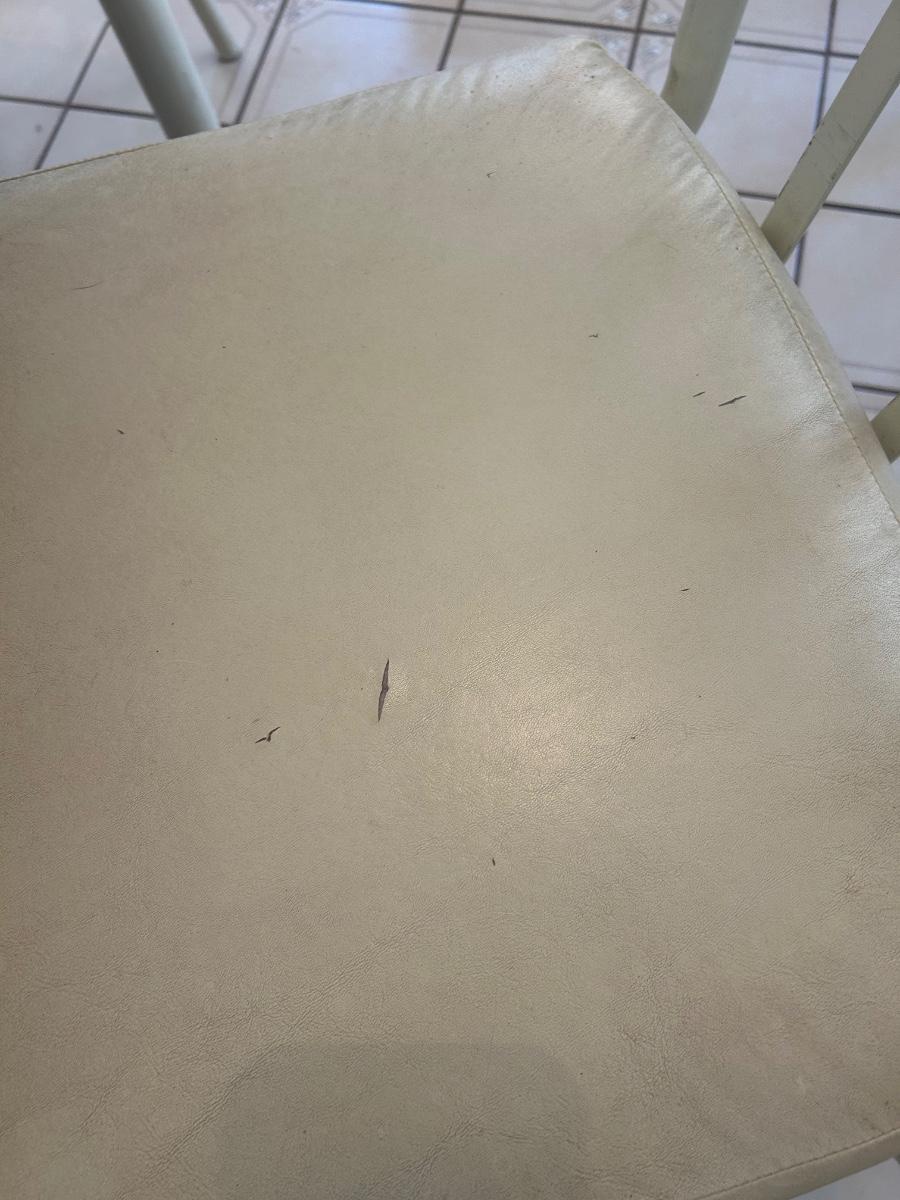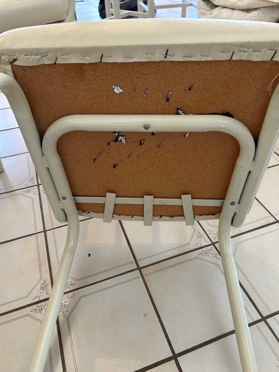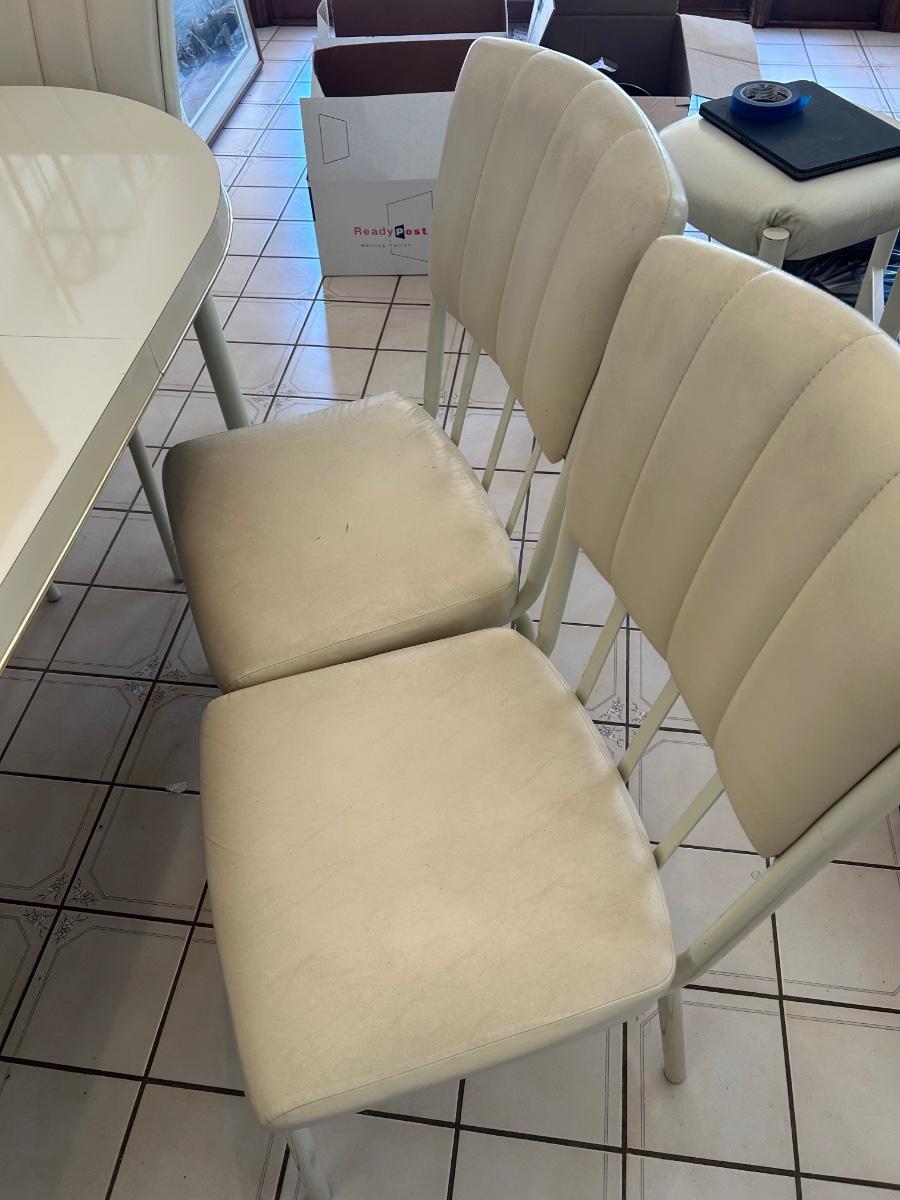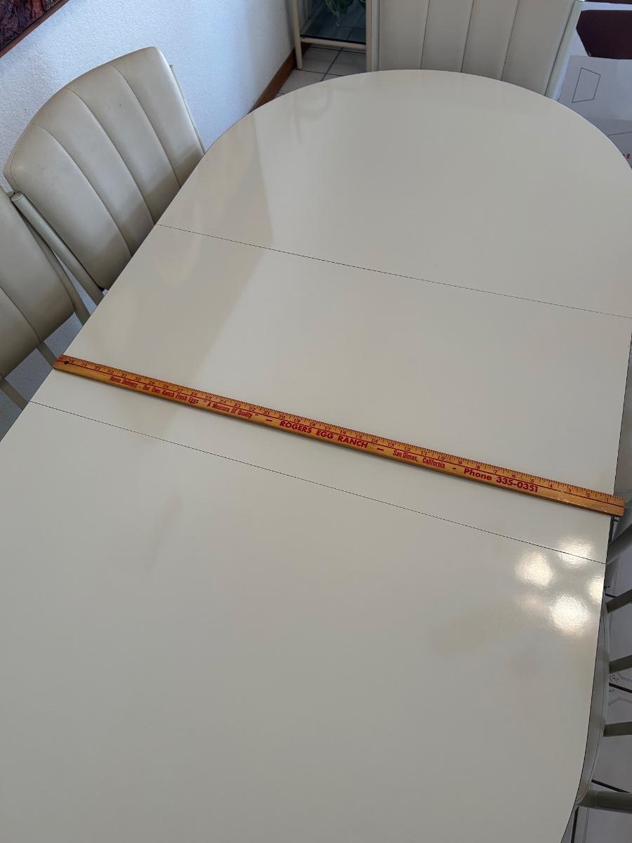 Retro 1980s Ivory White Laminate and Metal Oval Dining Table with 6 Chairs. Chairs have light wear but the table is in great condition, glossy surface.