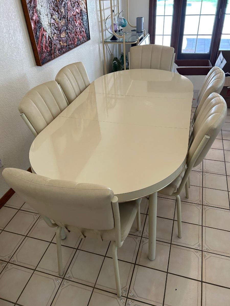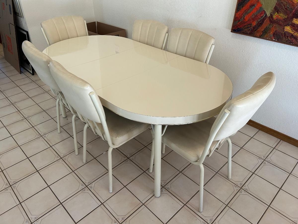 Retro 1980s Ivory White Laminate and Metal Oval Dining Table with 6 Chairs