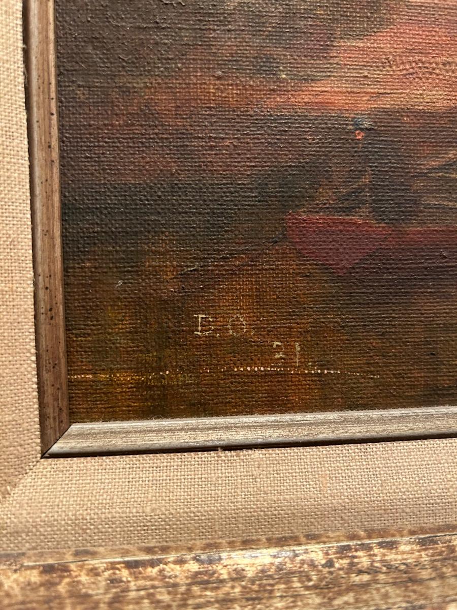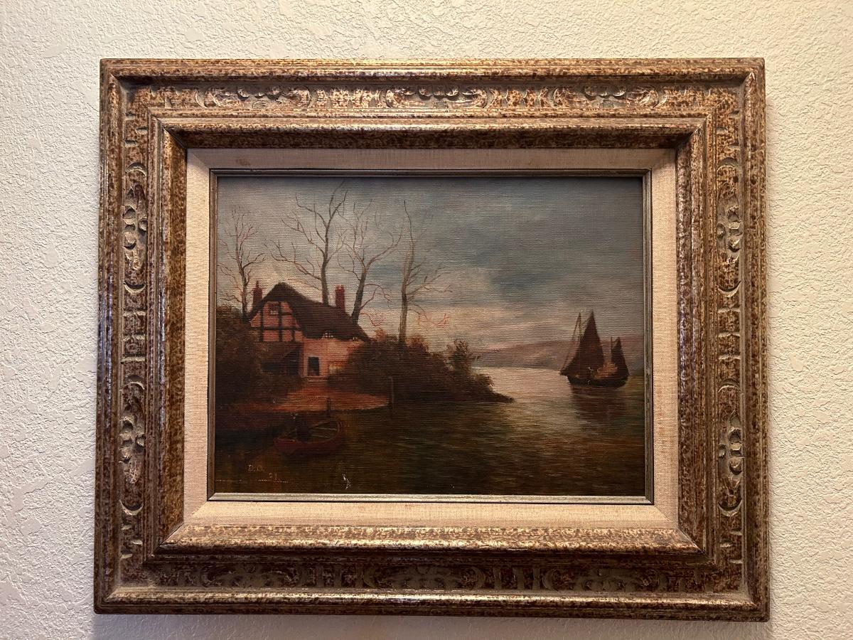 Vintage Cottage by the Sea with Boat Sailing Away Framed Art Painting Signed