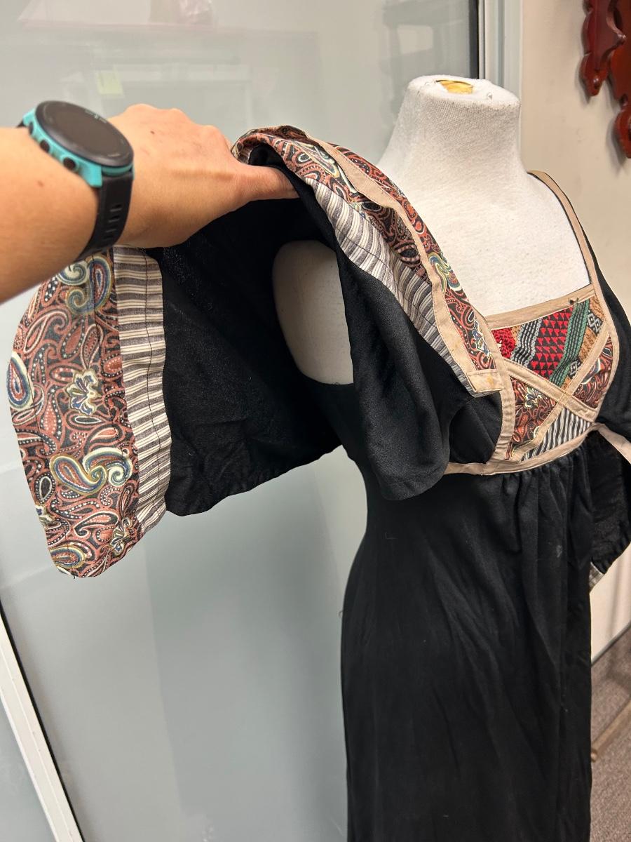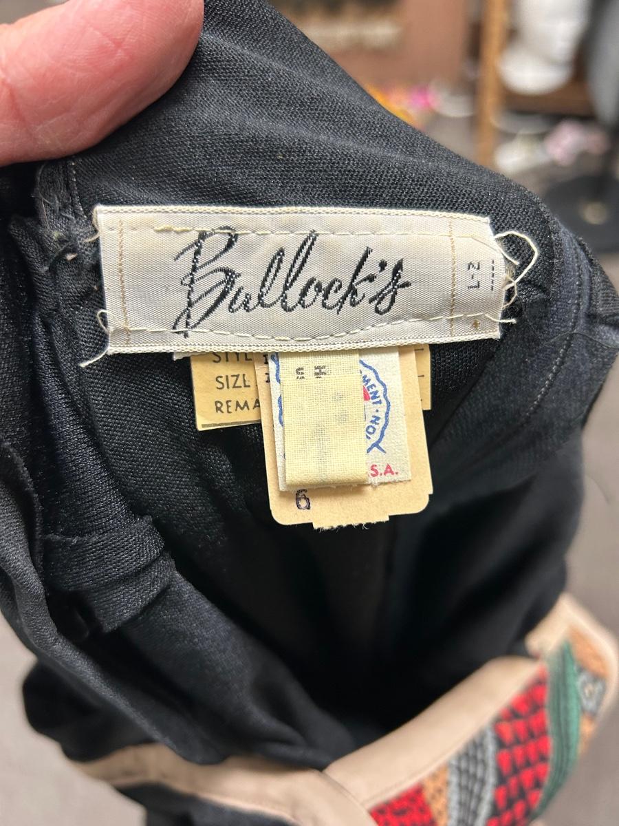 Vintage Bullock's Black Patchwork Chest Maxi Dress with Hanky Sleeves Size 6. In vintage condition. There is a spot of thread wear at chest and some discoloration spots that may come out with washing.