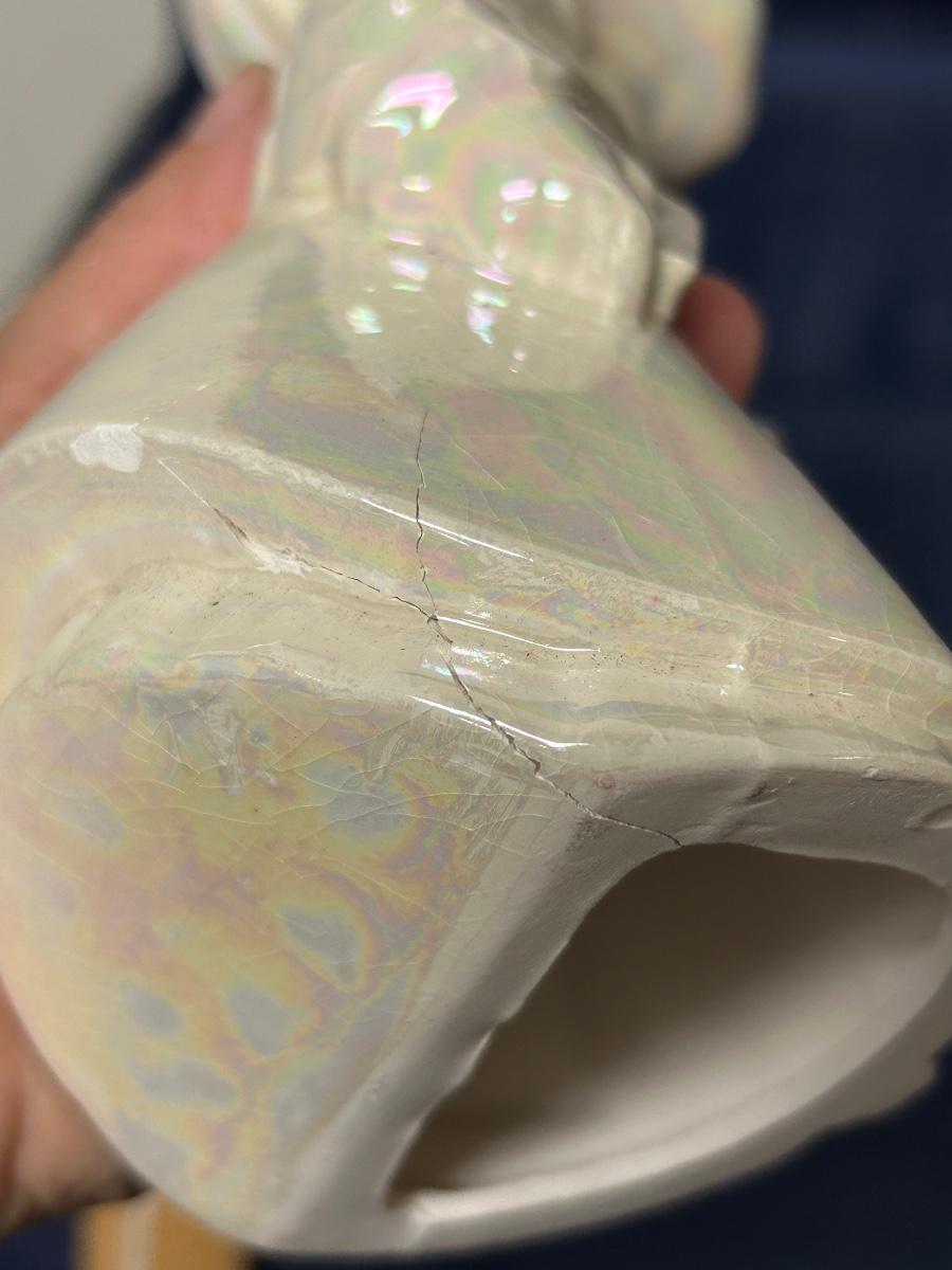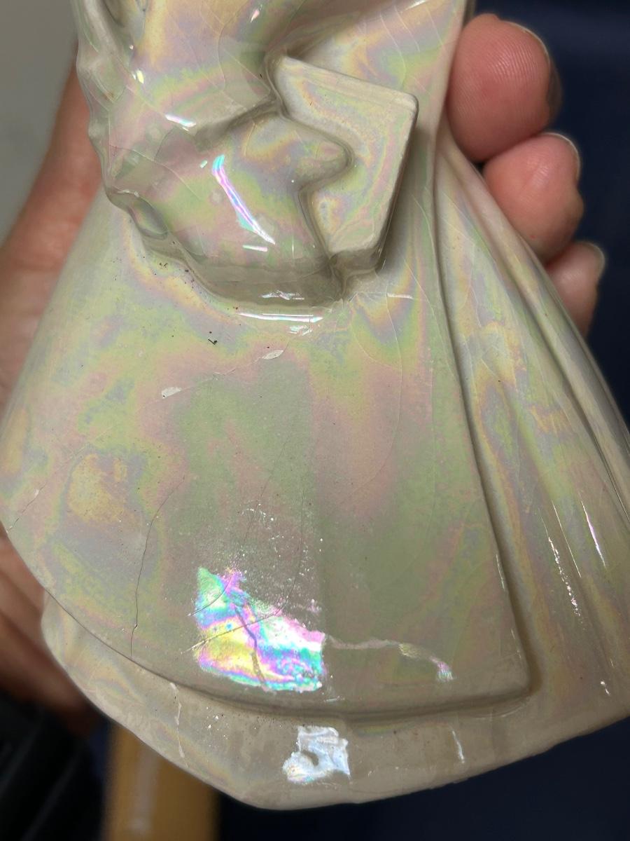 Pair of Vintage Pearlescent Kissing Angel Figurines. Unfortunately, the boy angel has crazing and is cracked on the back near the bottom.