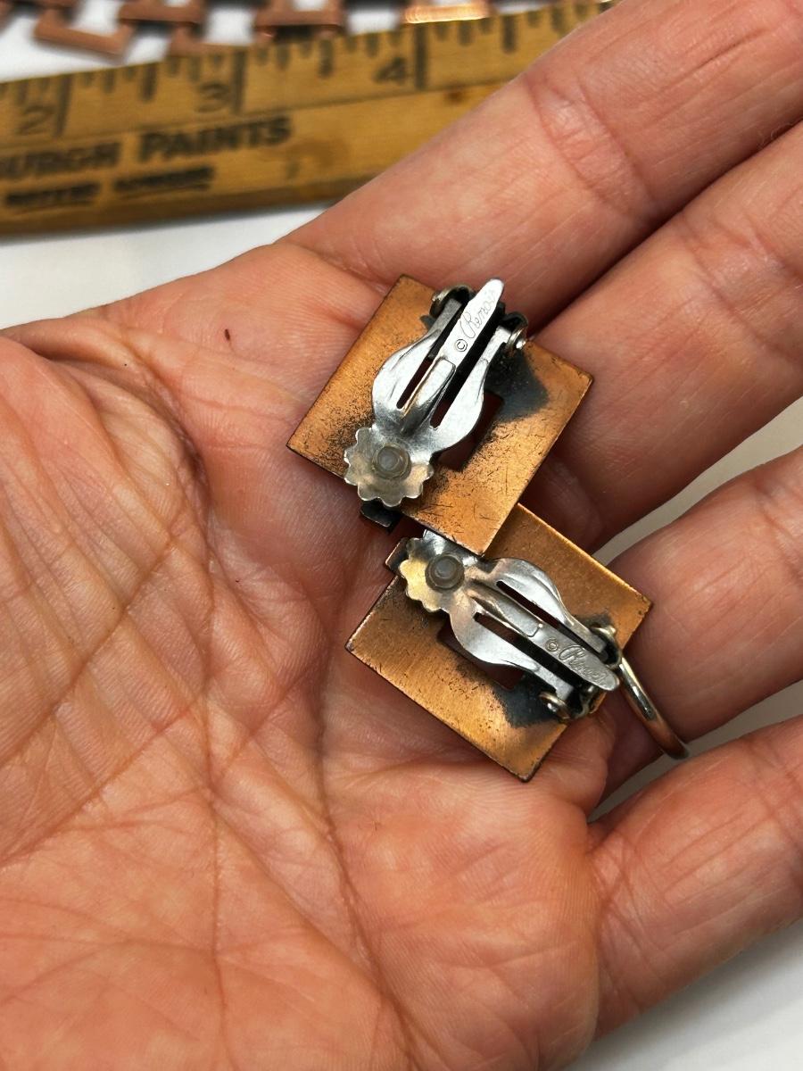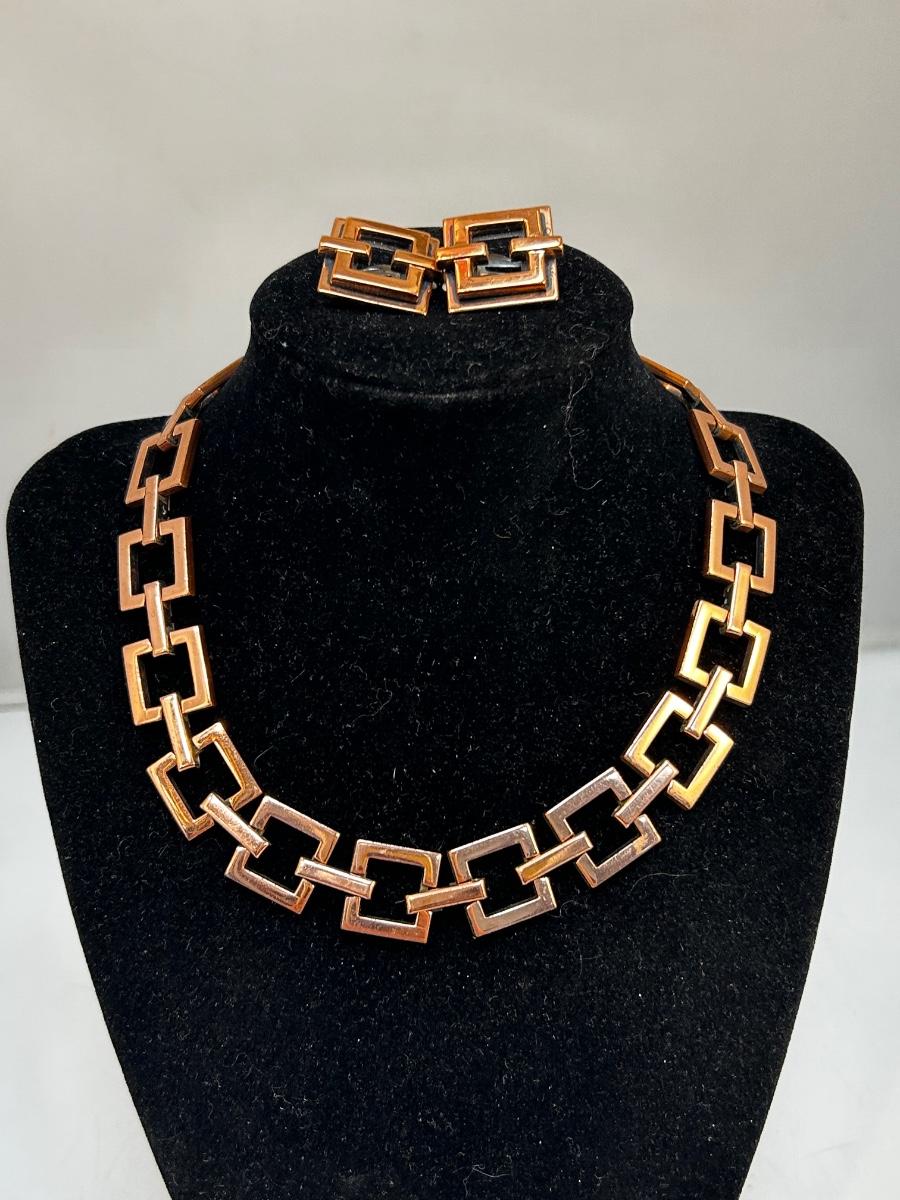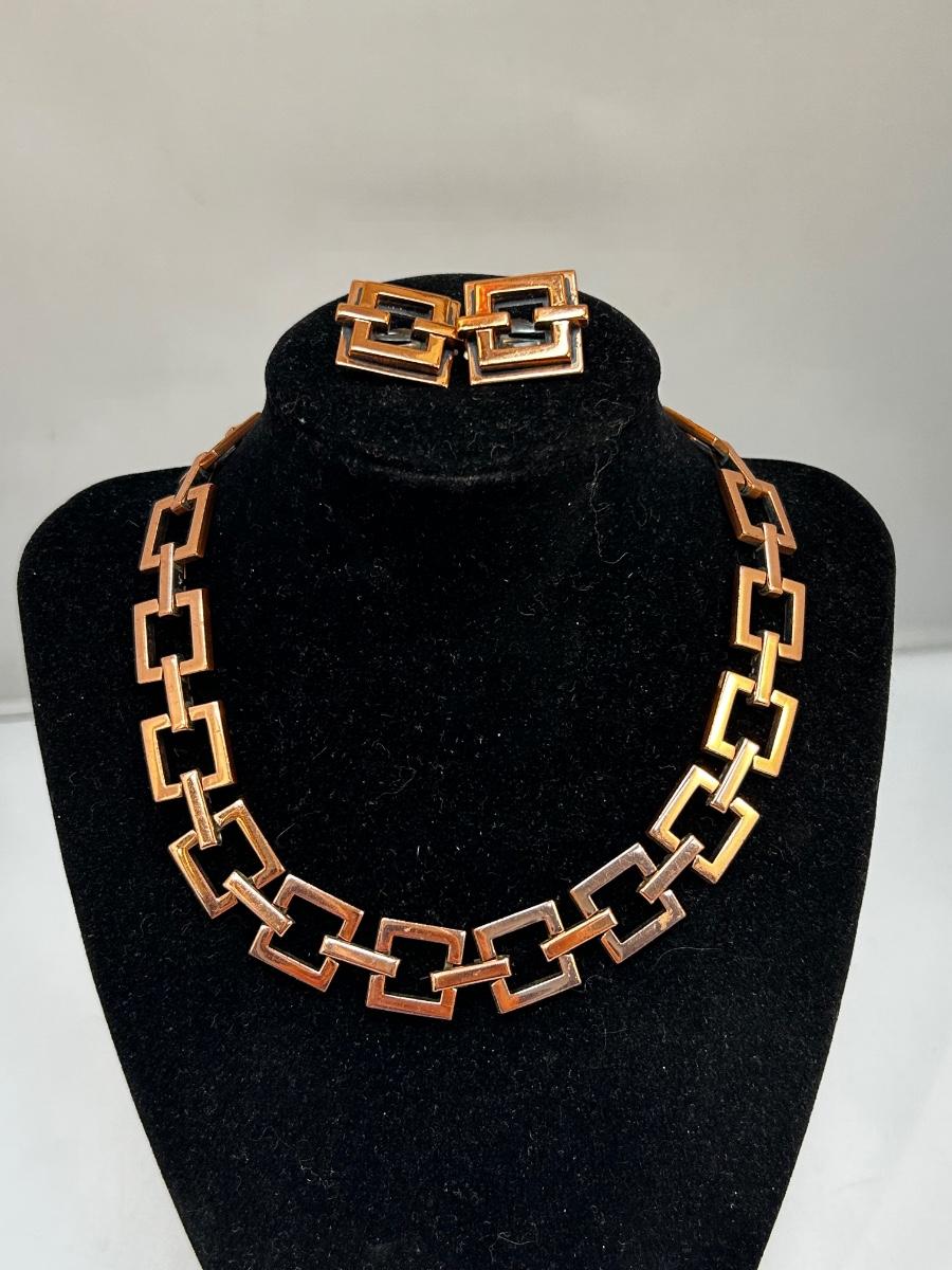Vintage Renoir Copper Geometric Square Choker Style Necklace with Matching Clip Style Earrings