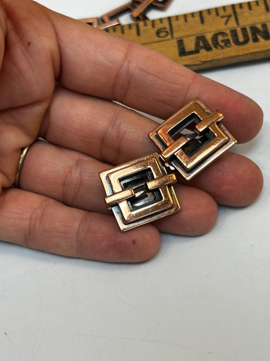 Vintage Renoir Copper Geometric Square Choker Style Necklace with Matching Clip Style Earrings. In good condition. All pieces are stamped Renoir.