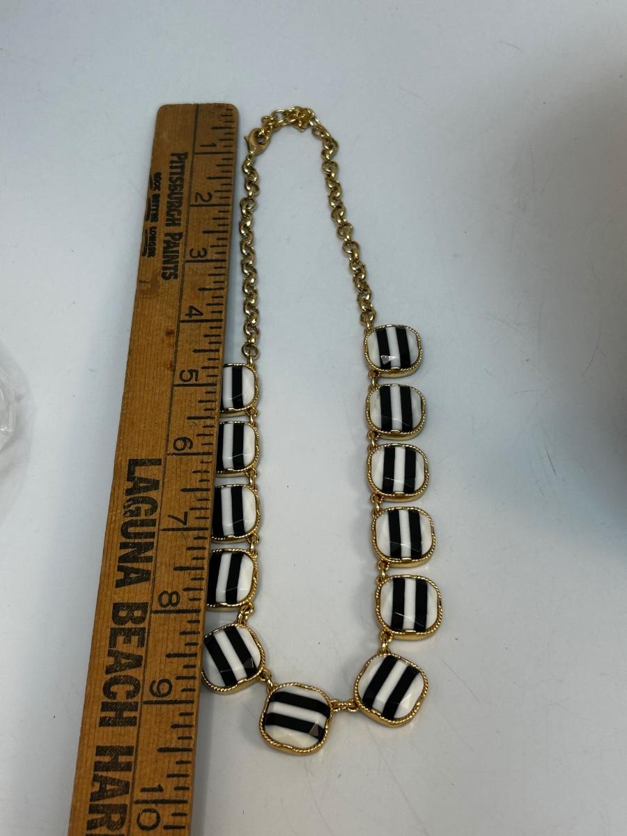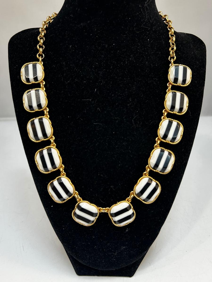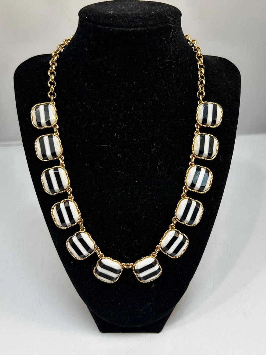 Talbots Shiny Gold Tone Chunky Black and White Striped Statement Necklace
